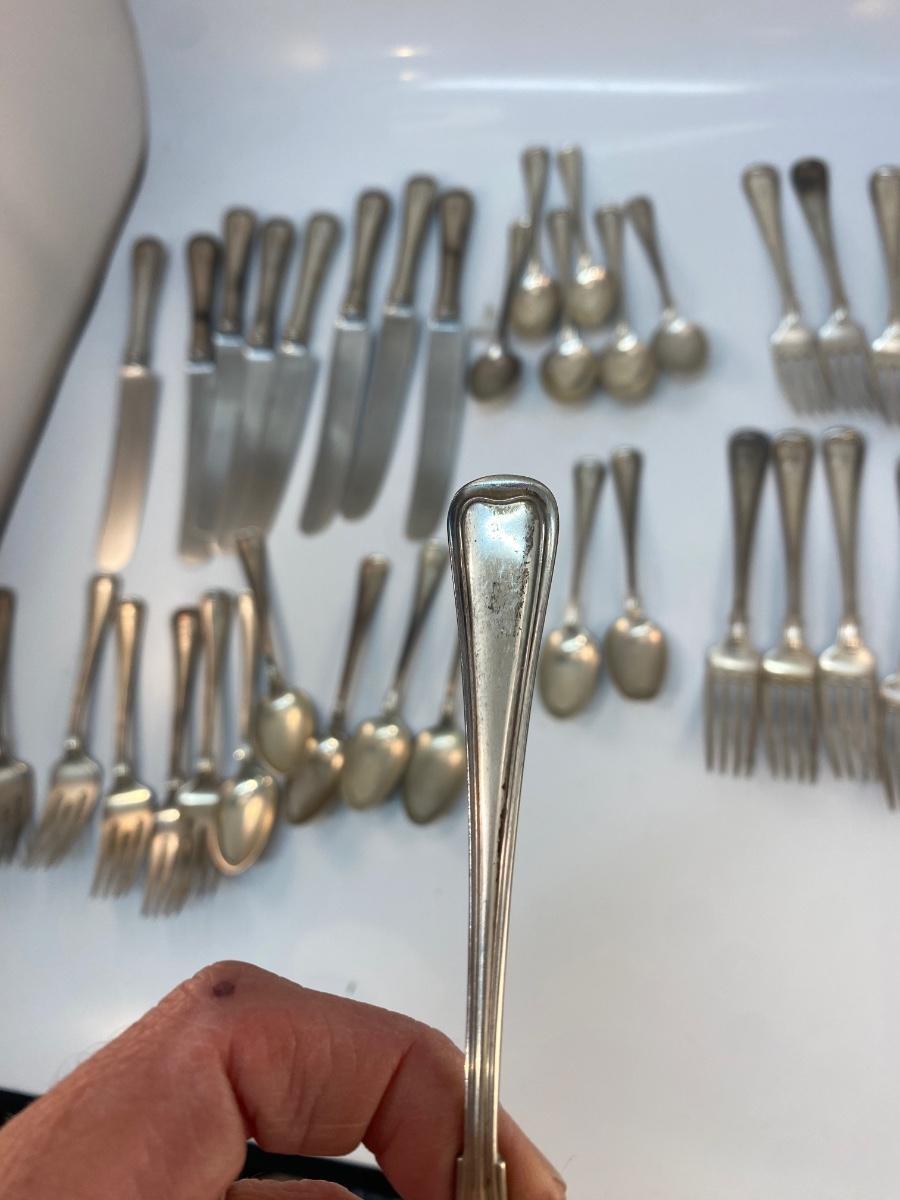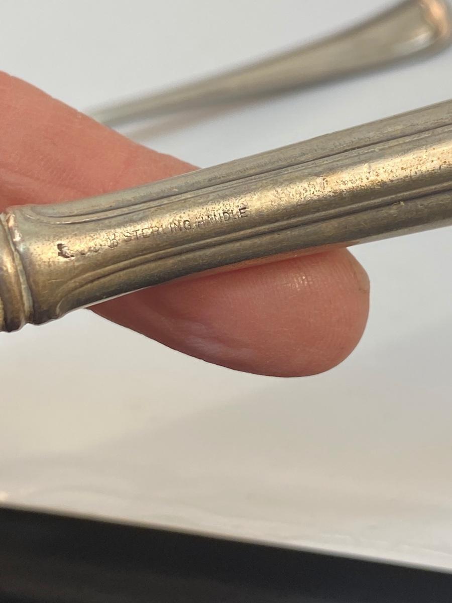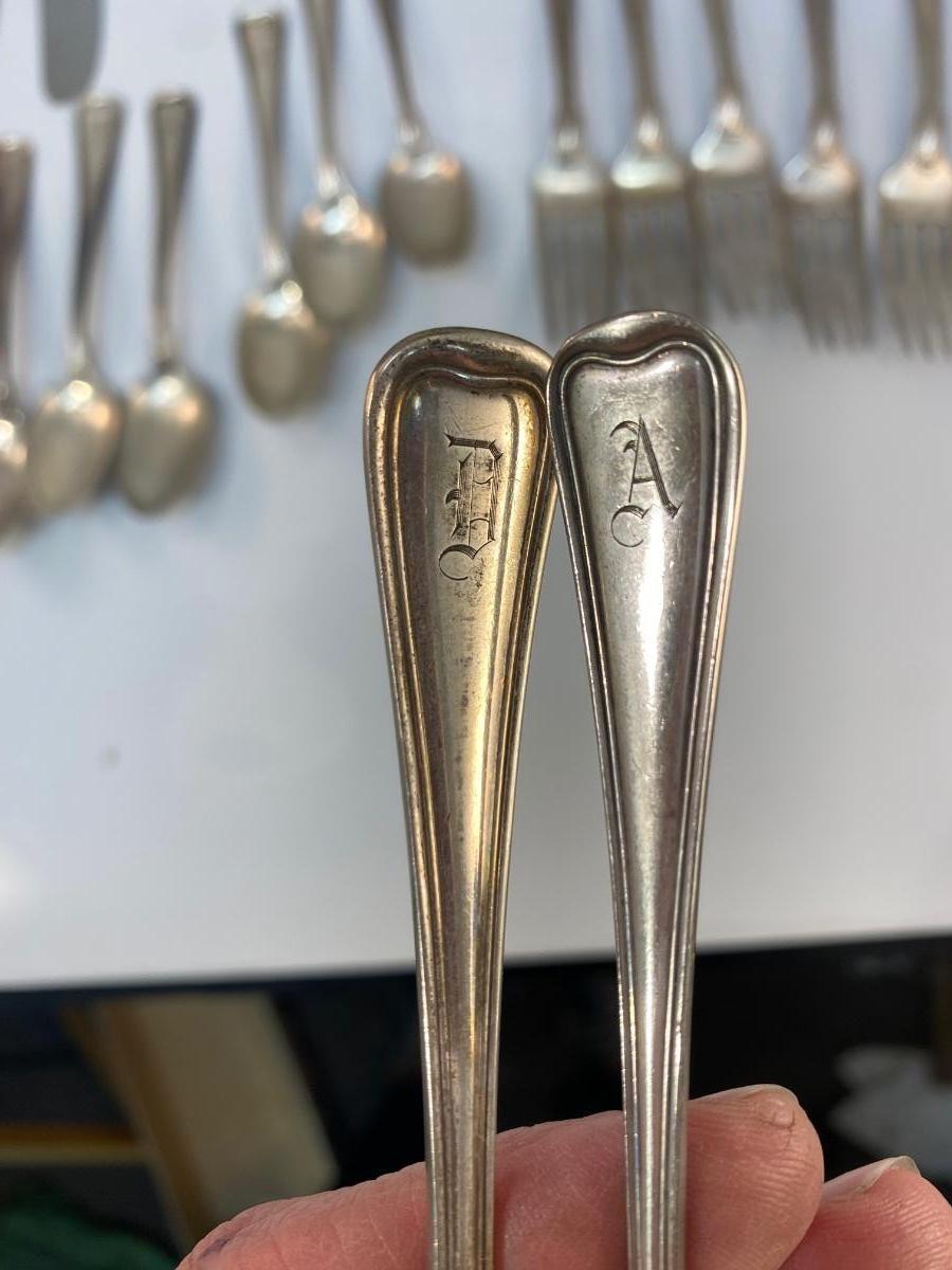 Vintage Sterling Silver Flatware Set Monogrammed Forks Knives Spoons. Old looking set of sterling. Some pieces are monogrammed "A" and some "D". Three spoons are not monogrammed at all. Incomplete set. Heavy pieces. Knives are sterling handle with stainless blades. Total weight for forks and spoons is 1254g and knives are 634g. 39 pieces total.