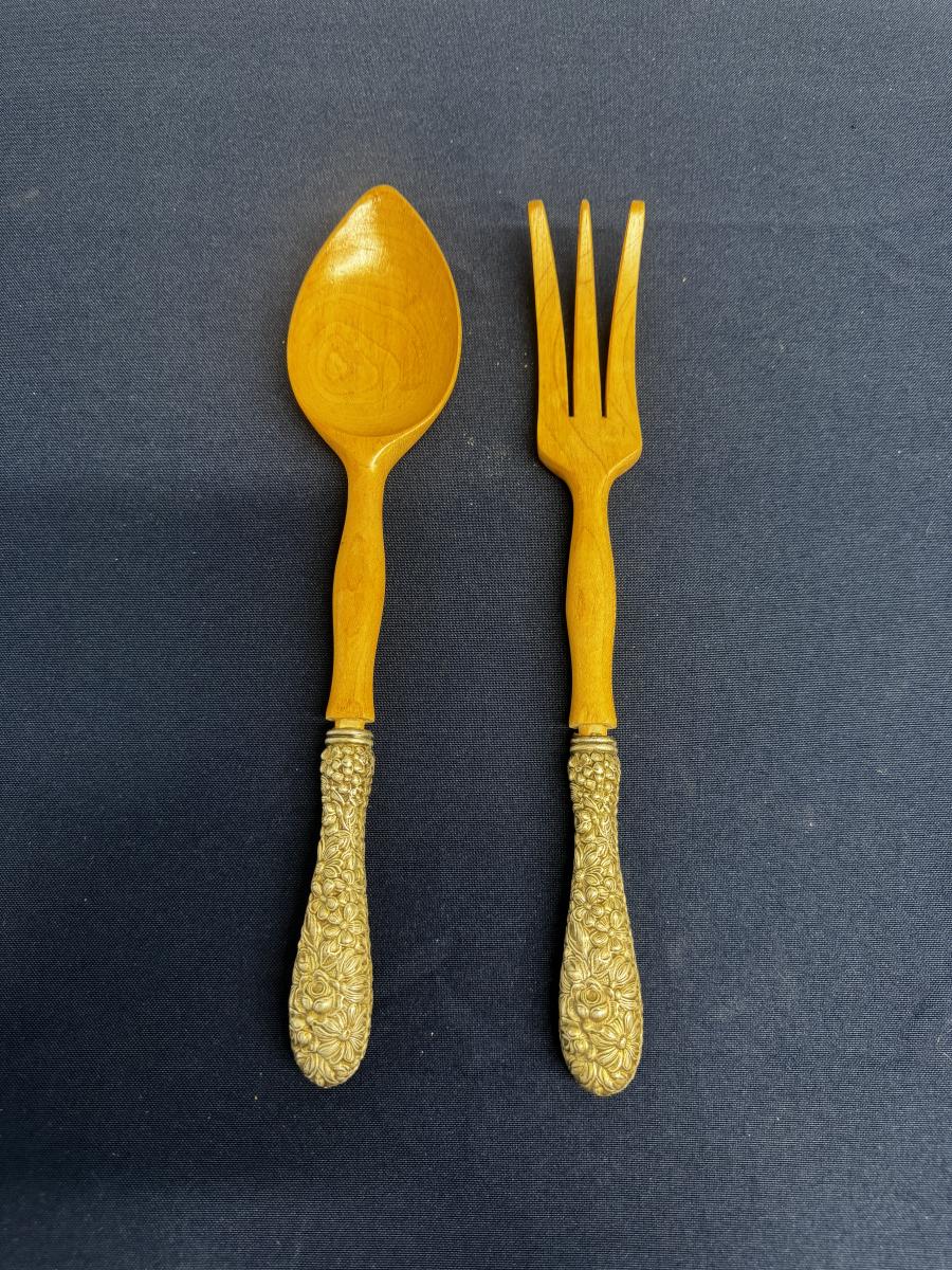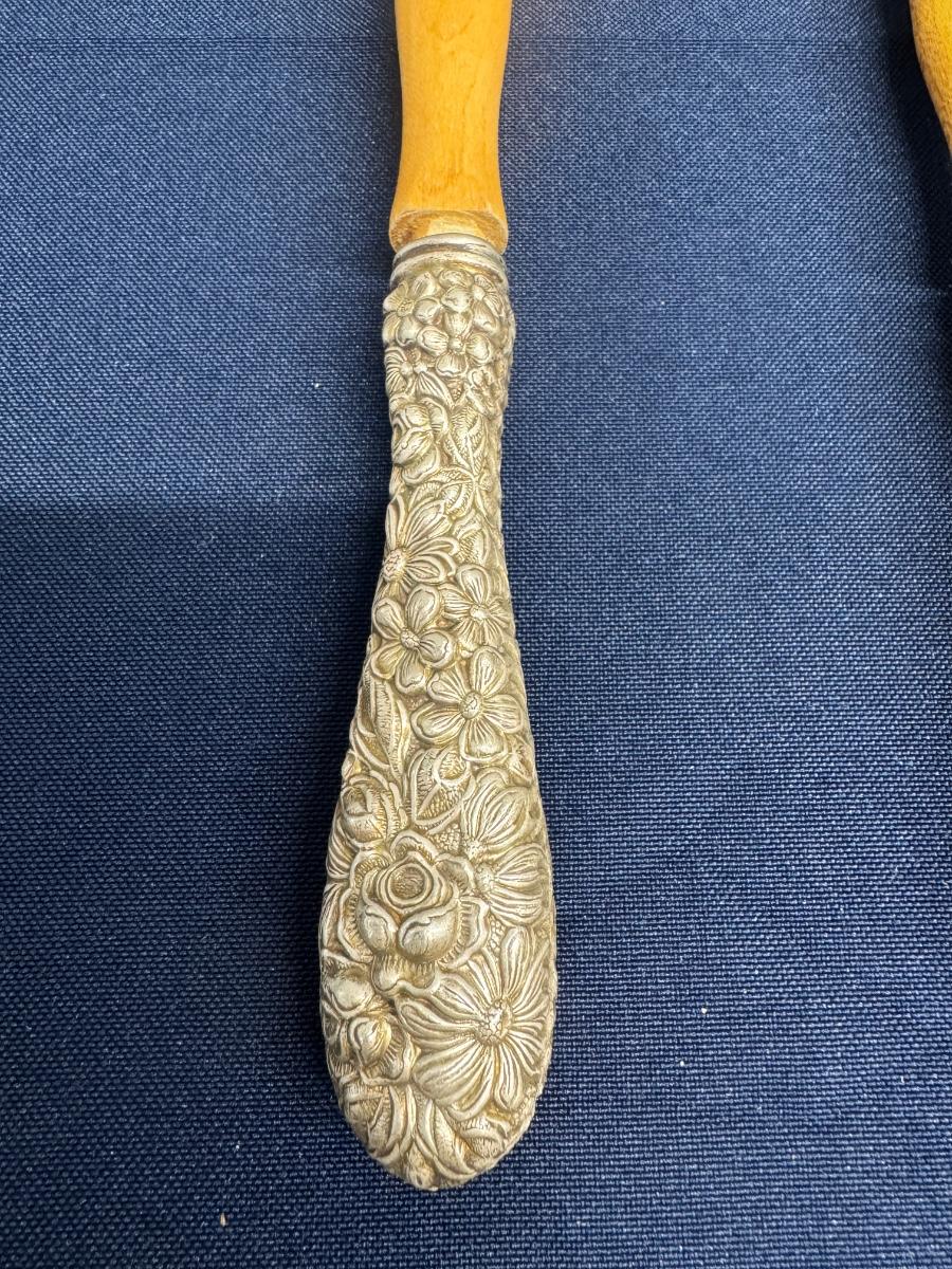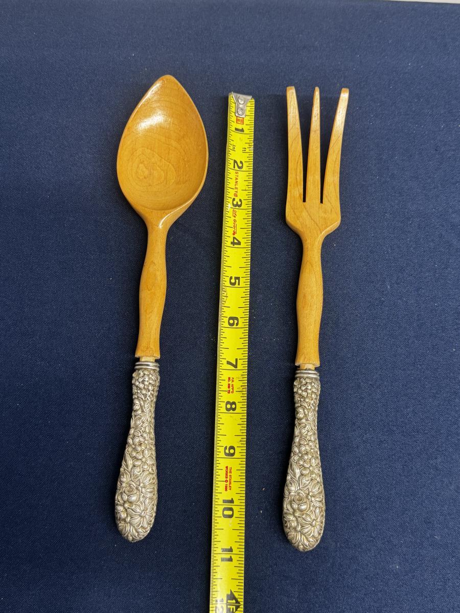 Vintage Sterling Silver Handled Wooden Salad Servers – Floral Repoussé – Pair