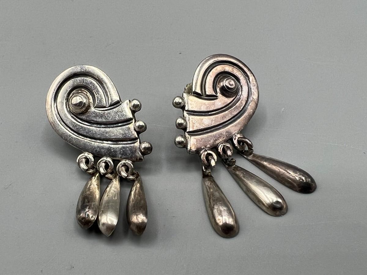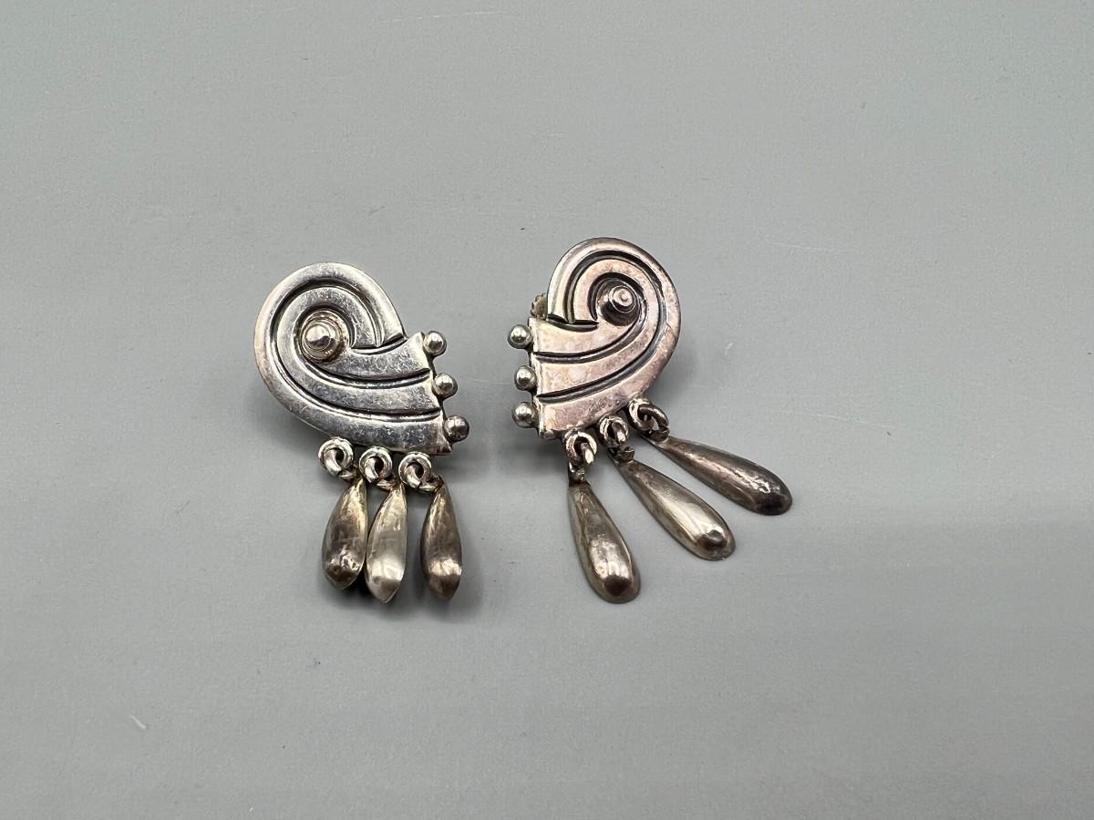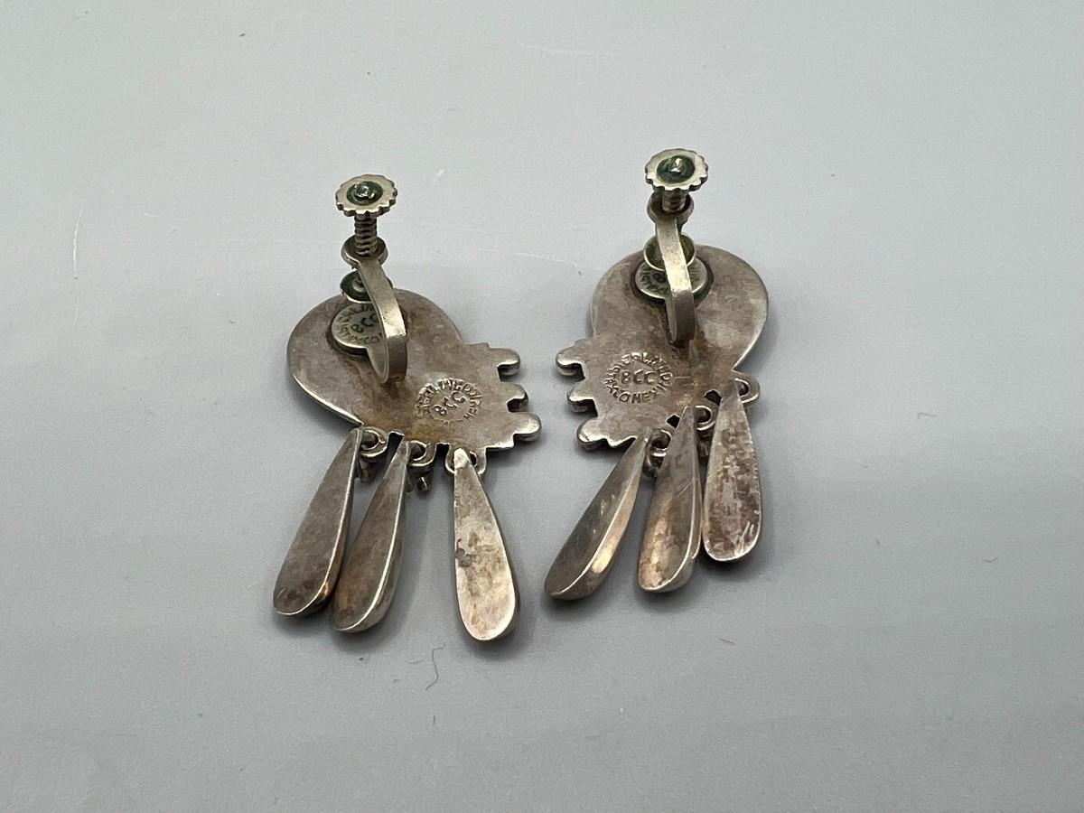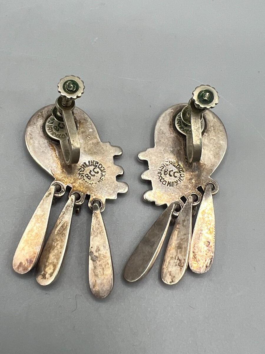 Vintage Sterling Silver Made in Mexico Spanish Style Dangling Earrings, there is some light wear, but there is no significant damage and is in good wearable condition. Check pictures for more details and for sizing.