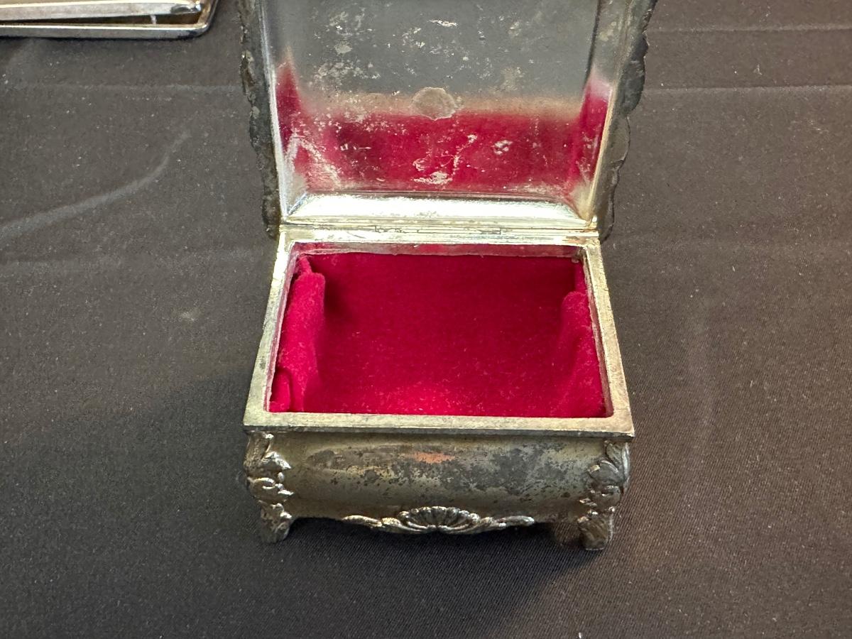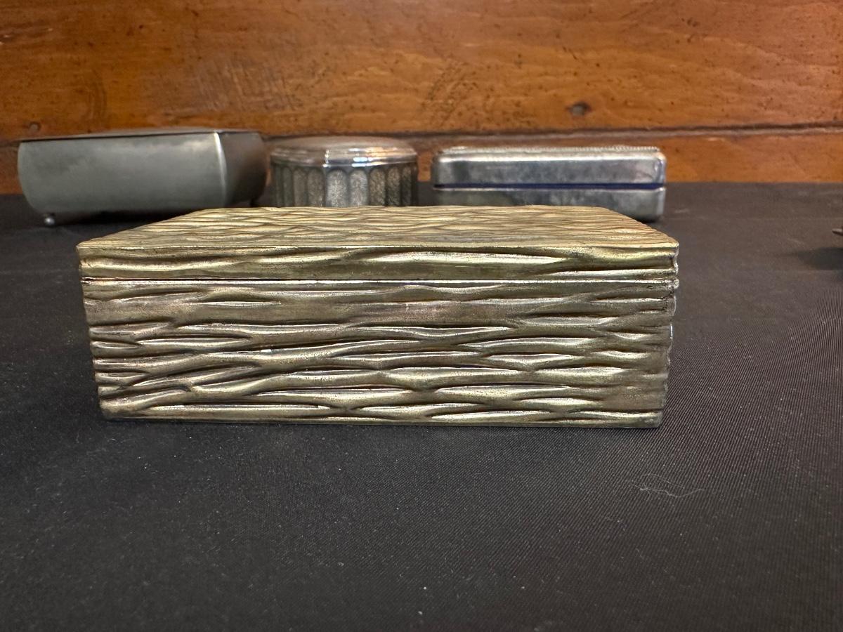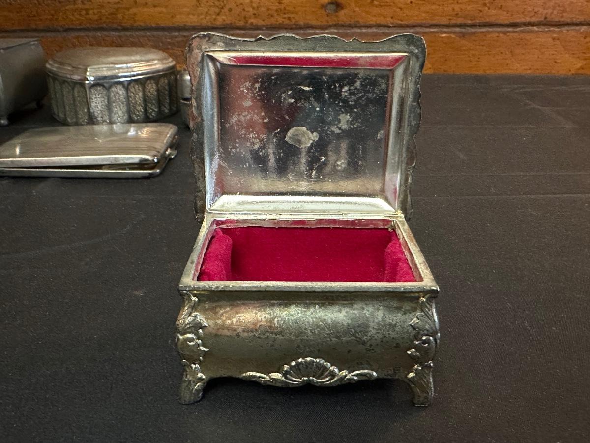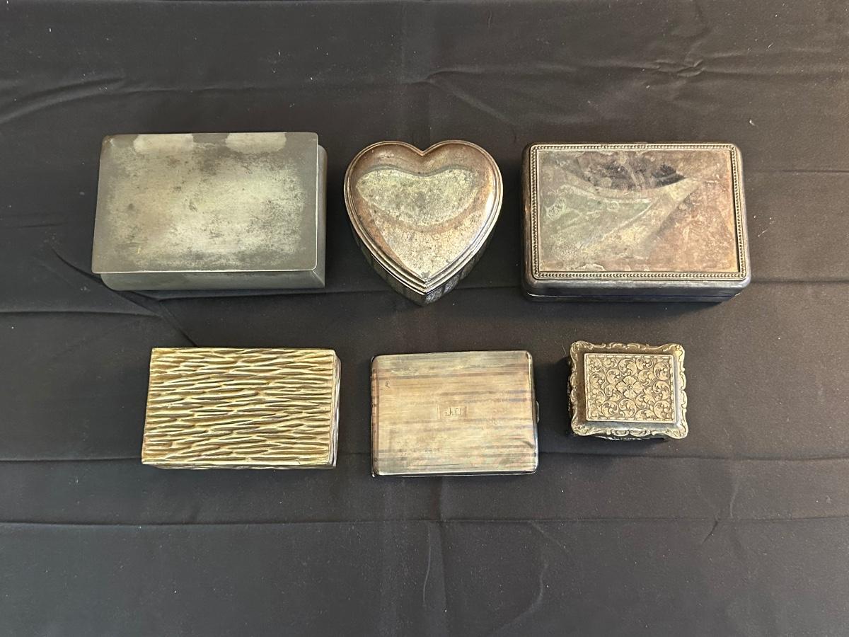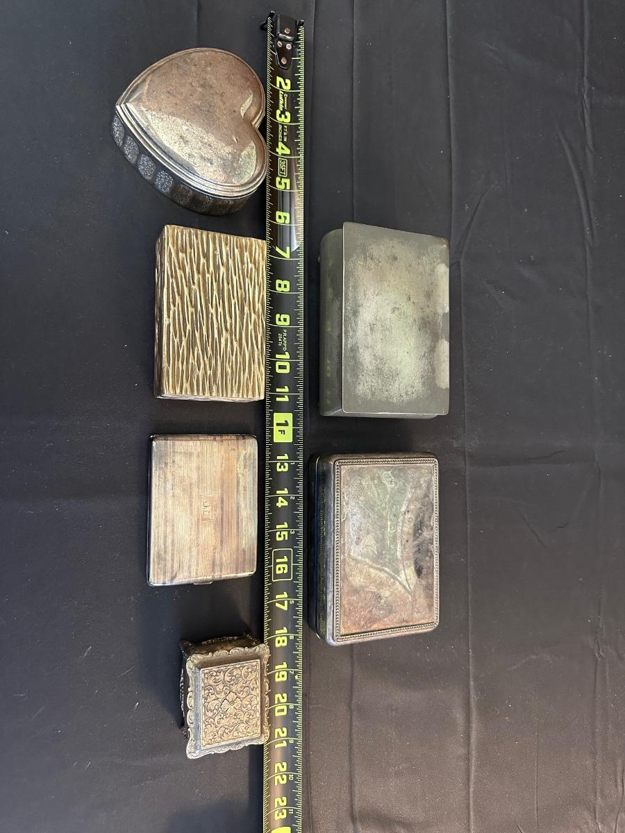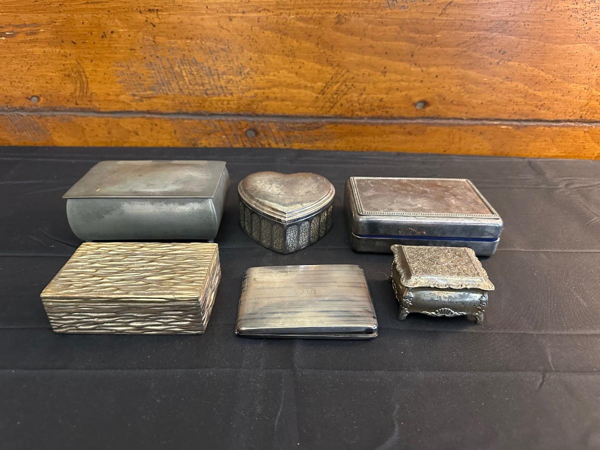 Money clip has “Sterling”. Other boxes are seemingly silver plated, metal or Pewter.