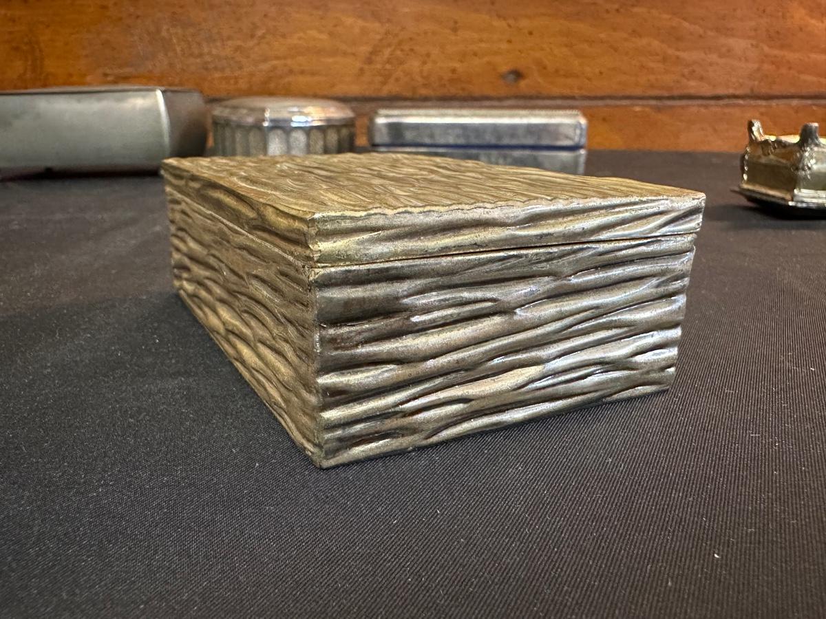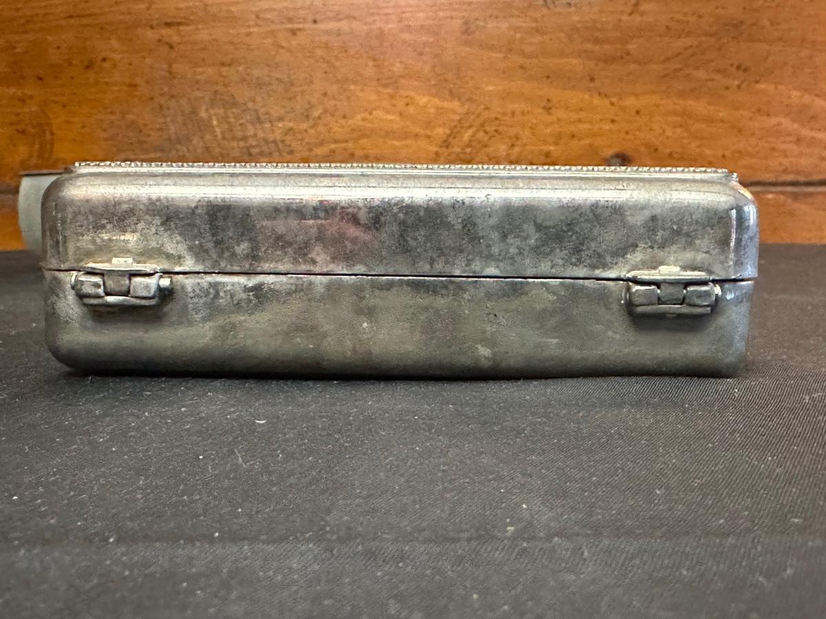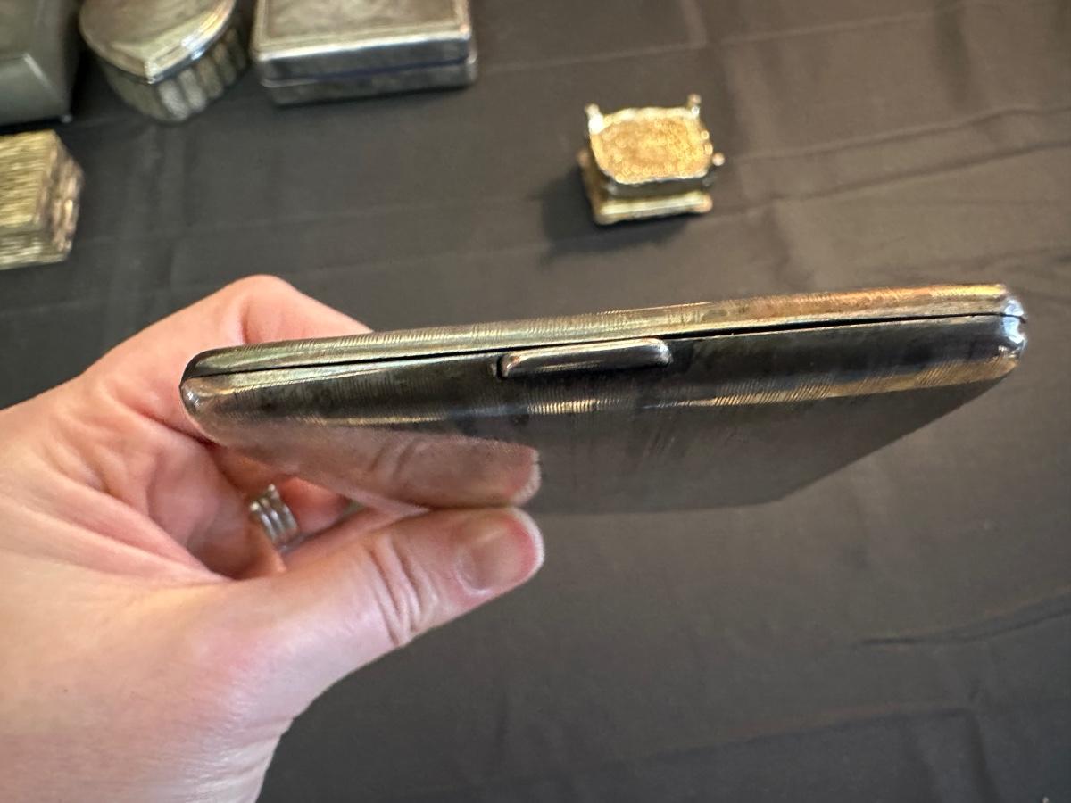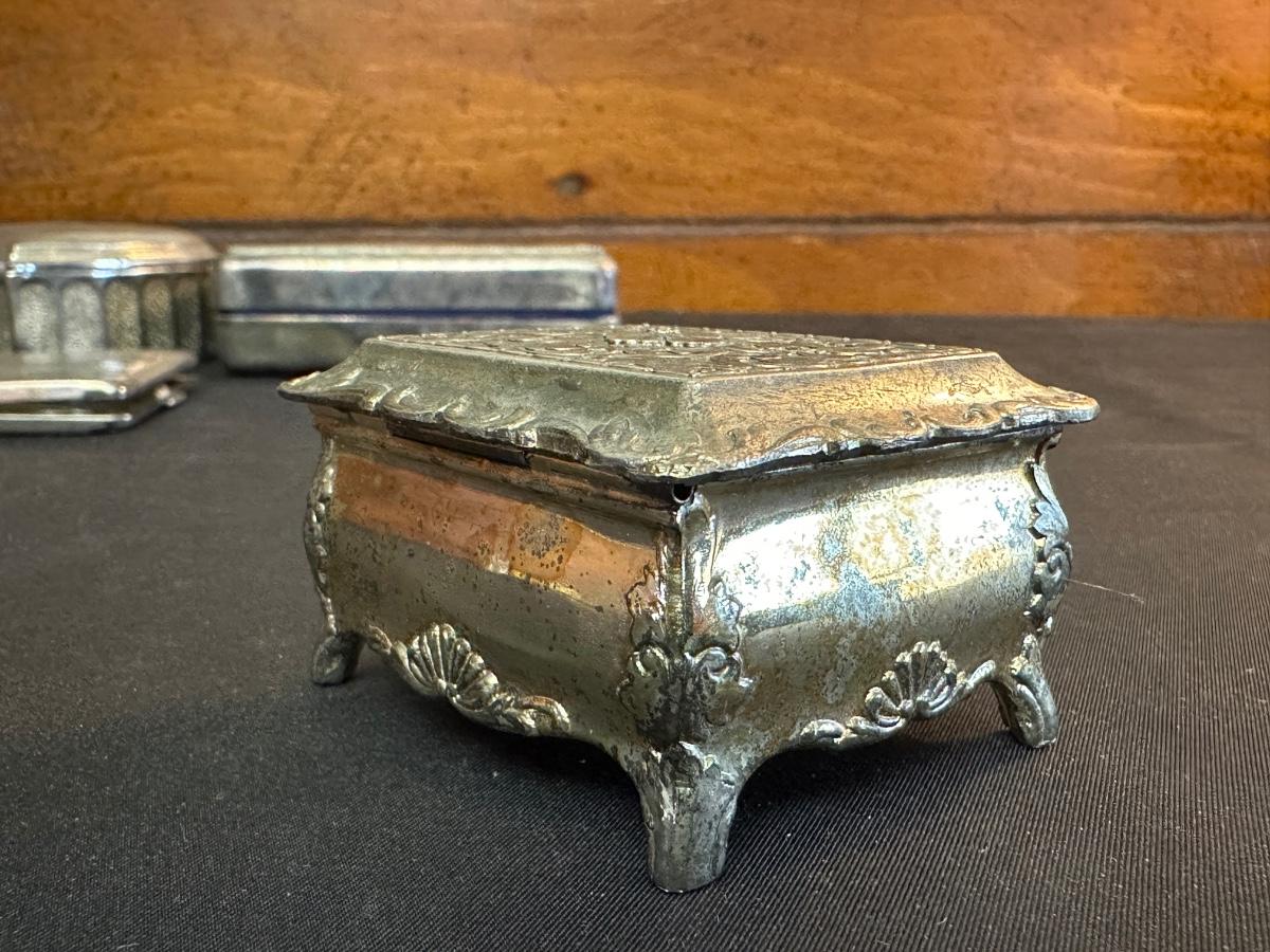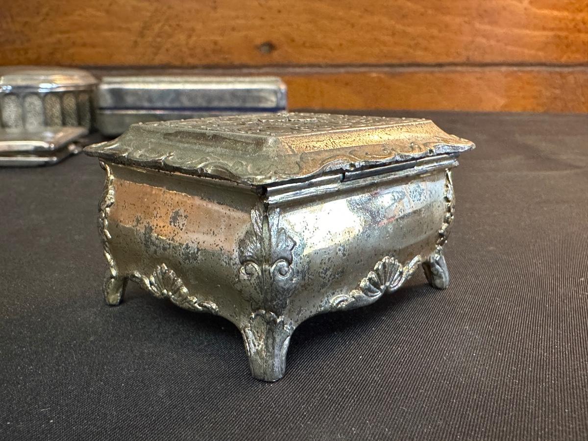 Money clip has “Sterling”. Other boxes are seemingly silver plated, metal or Pewter.