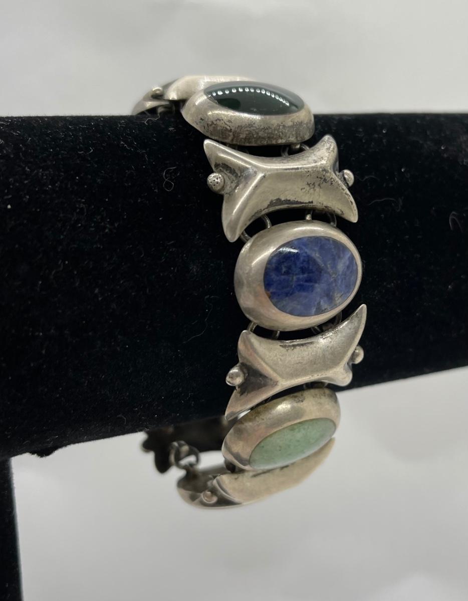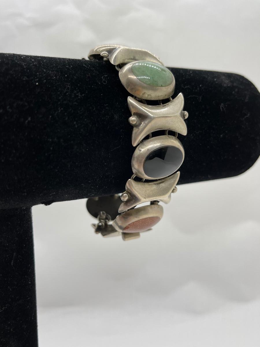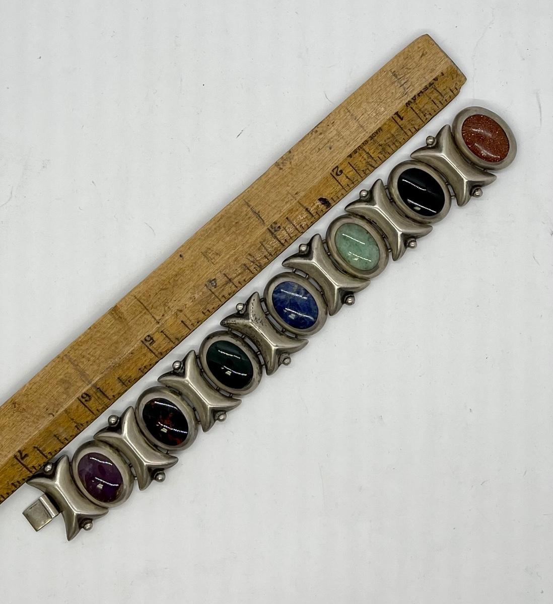 Vintage Sterling Silver Polished Stone Chakra Chunky Link Bracelet Taxco Mexico 925. In good condition. Center link is stamped. Latches well. About 7" length.