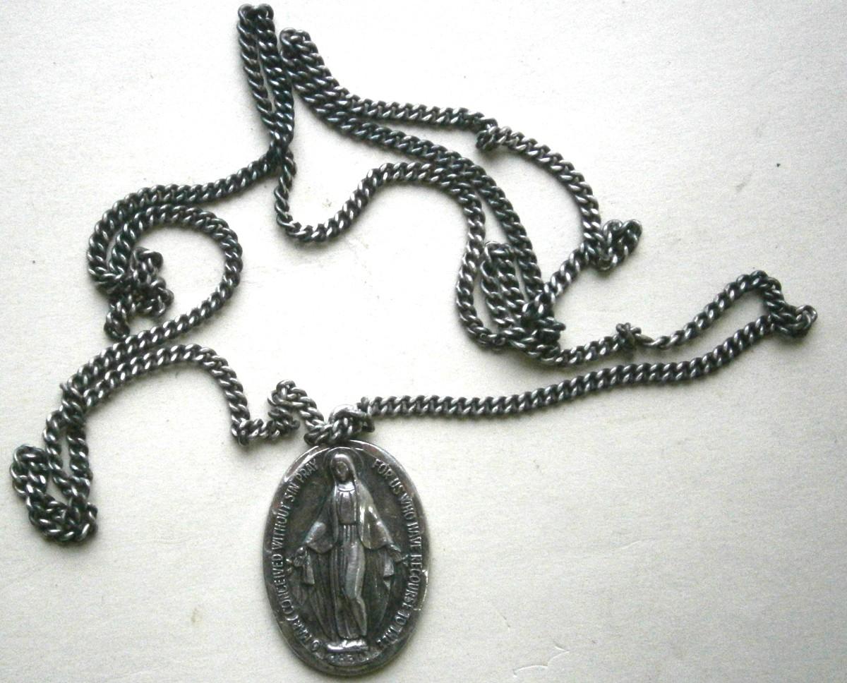 Vintage Sterling Silver Religious Pendant and Chain, chain is 26 in. long and is continuous (no clasp), pendant is 1 1/4 in. tall, overall weight is 21.5 grams.