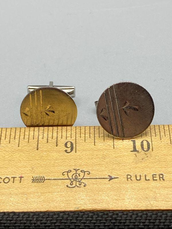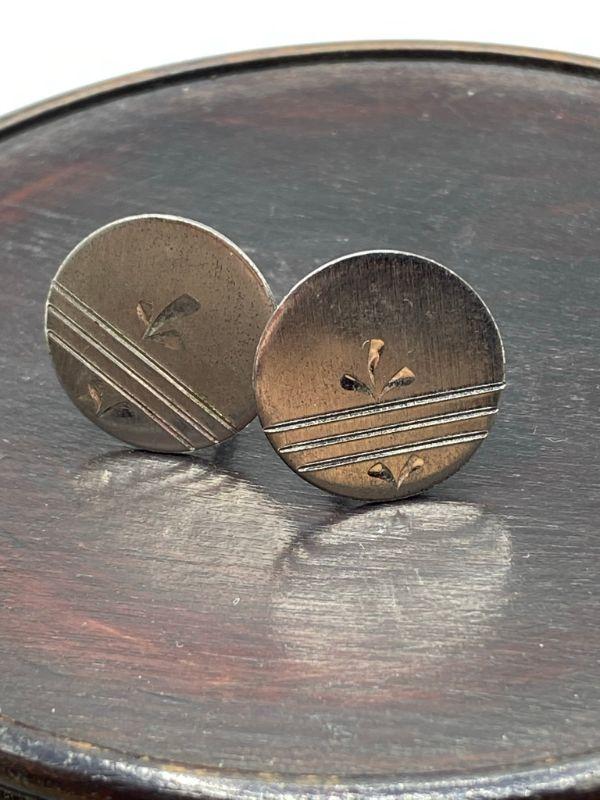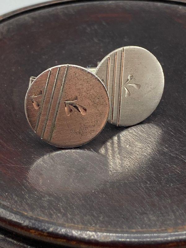 Sterling silver cuff links. Round with simple etching, go with any suit. Need to be cleaned up a little, have some fine scratches from being mixed in with other metal jewelry. Stamped on the back and pin. About 1/2" size.