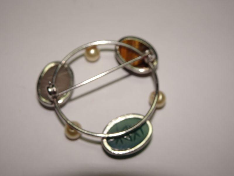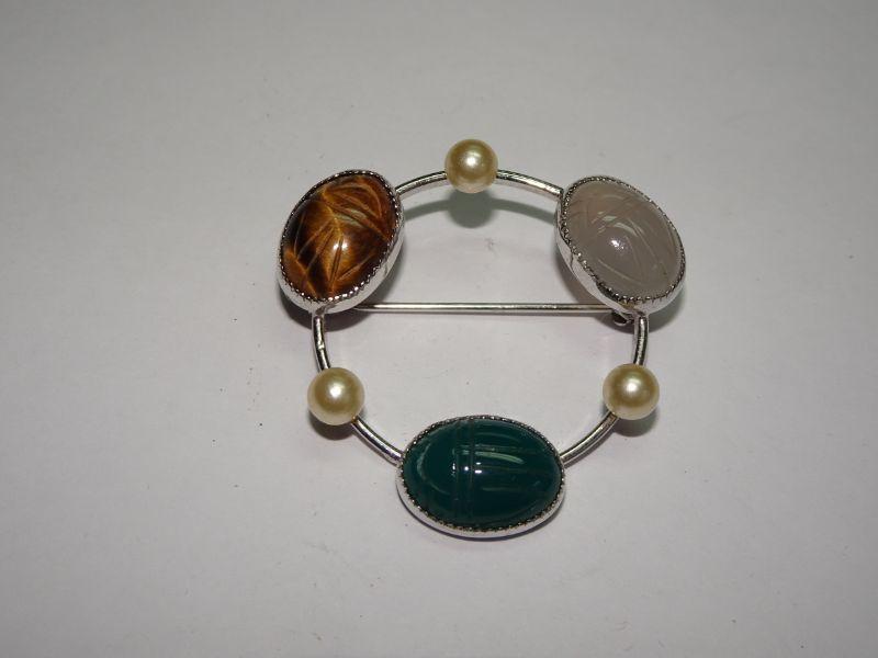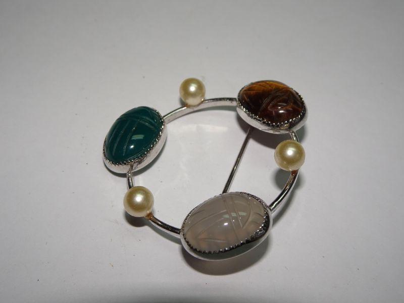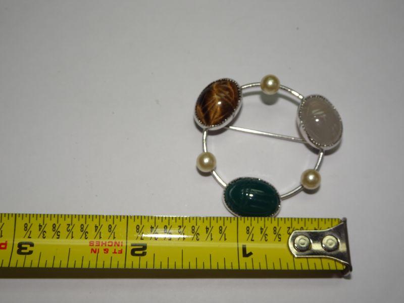 Vintage Sterling Silver Signed Beau Scarab Brooch Pin, Tigers Eye, Rose Quarts, Jade
