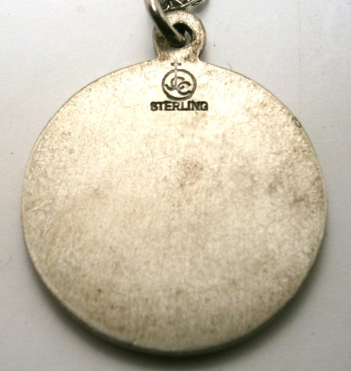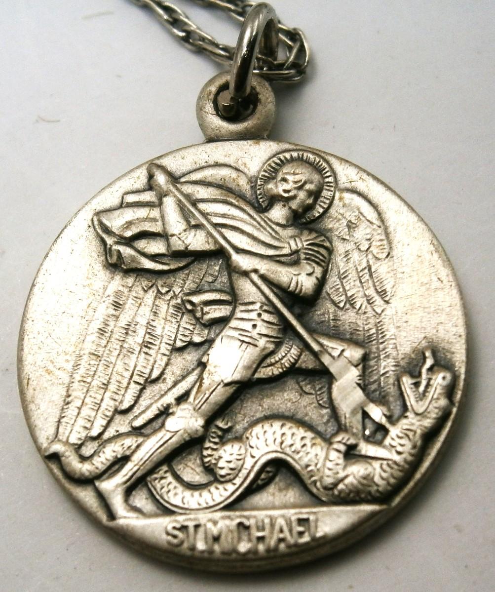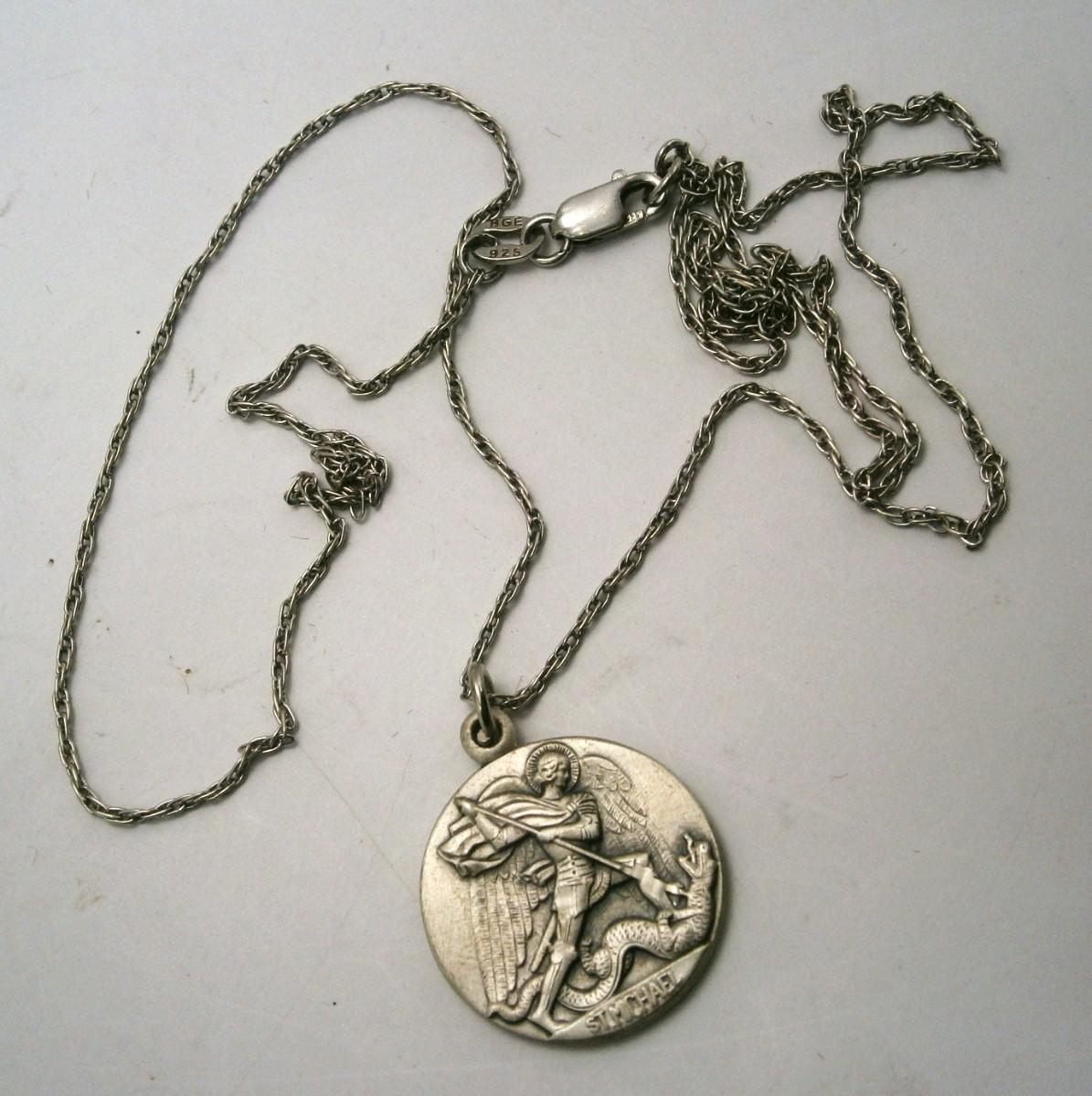 Vintage Sterling Silver St. Michael Slaying Dragon Medal on sterling silver chain, medal is 3/4 in. wide and chain is 20 in. long.