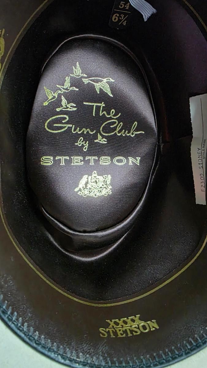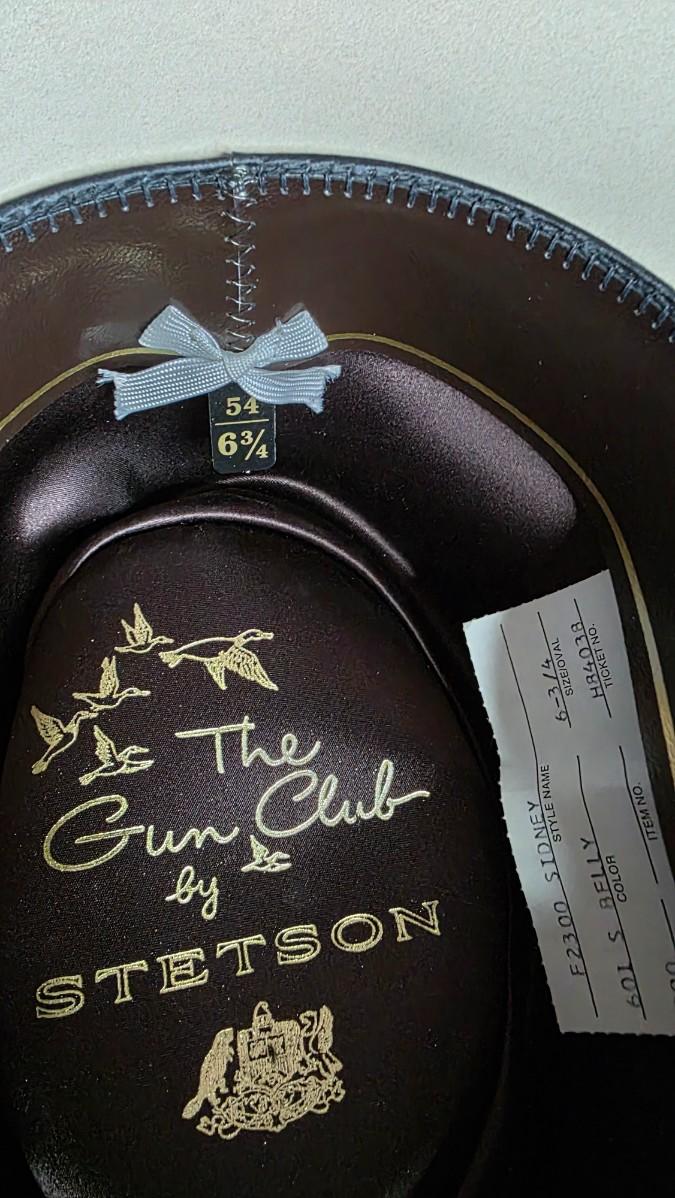 Inside, the artistry continues. The rich satin lining bears the Stetson Gun Club insignia, complete with illustrated wildfowl and the golden-embossed Stetson crest—details collectors immediately recognize and value. The leather sweatband is supple and stamped with the XXX Stetson hallmark, reinforcing its heritage-grade build. The factory label confirms all original specifications: F2300 Sidney, 601 S Belly, Size 6¾, Brim 300, Ticket No. H84038.