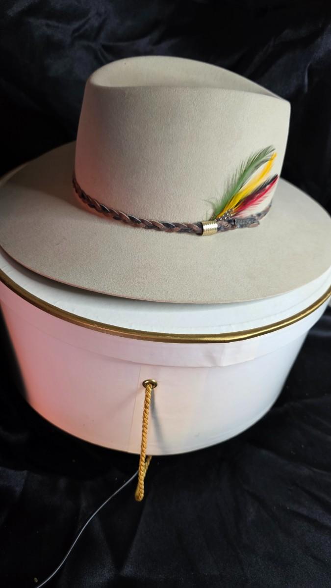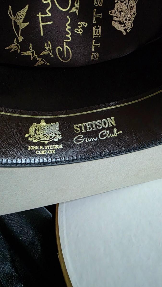 What makes this find truly exceptional is its condition—new, unused, and housed in its original vintage Stetson hat box. Finding any Gun Club model in preserved, unworn shape is rare… finding one complete in its box is a genuine stroke of collector’s fortune.