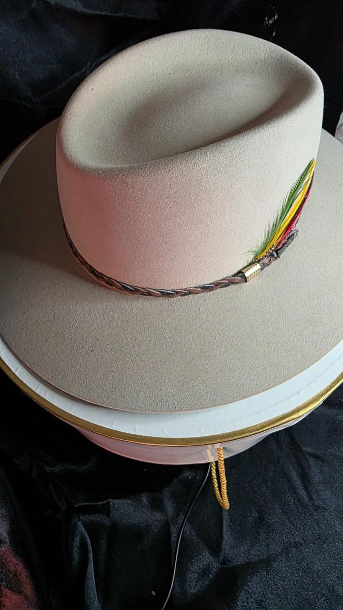 This model, Style F2300 – Sidney, showcases the esteemed XXX Stetson quality rating, indicative of superior felt craftsmanship and Stetson’s commitment to excellence. The 601 S Belly color offers a refined, versatile neutral tone—an elegant sandy beige that enhances its vintage character while remaining effortlessly wearable. The silhouette features a classic profile with smooth lines, a clean crown, and a beautifully braided hatband accented by a vibrant multi-color feather—an iconic nod to traditional Western flair.