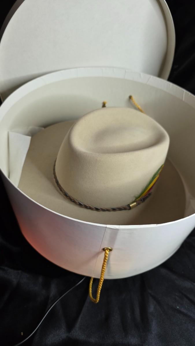 What makes this find truly exceptional is its condition—new, unused, and housed in its original vintage Stetson hat box. Finding any Gun Club model in preserved, unworn shape is rare… finding one complete in its box is a genuine stroke of collector’s fortune.