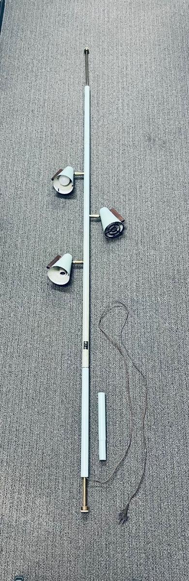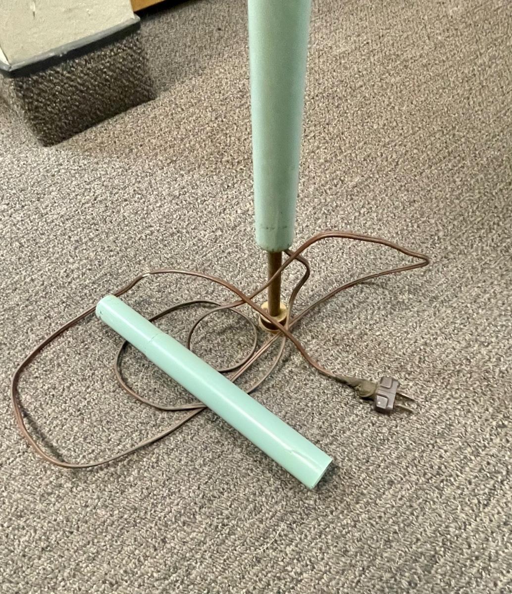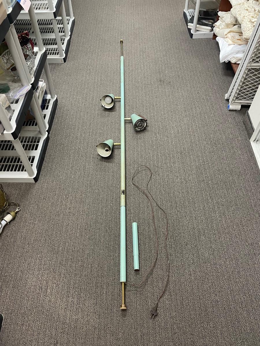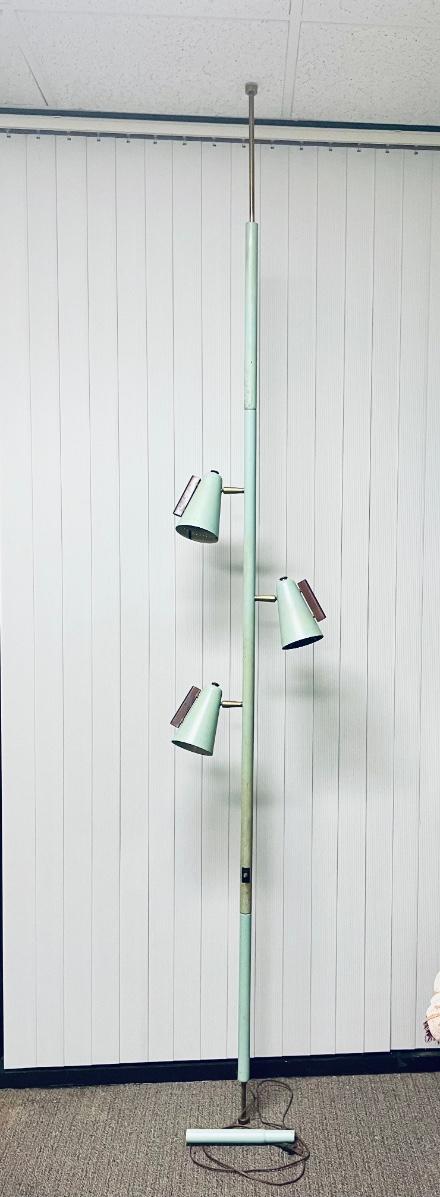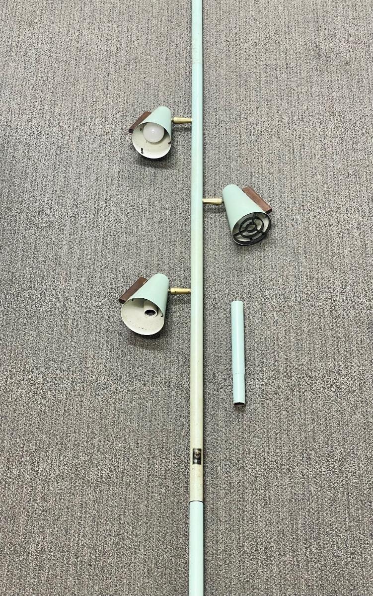 So cool! This tension pole lamp appears to be complete and comes with a bonus pole piece for higher ceilings, but it needs some TLC. Designed by Raymond Loewy for Ted Stiffel Lamps. 2 of the 3 black plastic light baffles are missing, see photos for details. Painted teal, parts of the finish appears to be discolored and rough on an end piece. It does work, we tested it and found that one of the three lamp sockets has some loose wires which should work once socket is fixed. We unfortunately didn't take photos of the lamp when we plugged it in and when we went to remove the plug from the wall socket the plug separated in our hand. We were able to put the pieces back together, but we don't feel comfortable plugging it back in. We are sure that there is an experienced lamp person that is going to thoroughly enjoy restoring this beautiful Mid-Century piece.