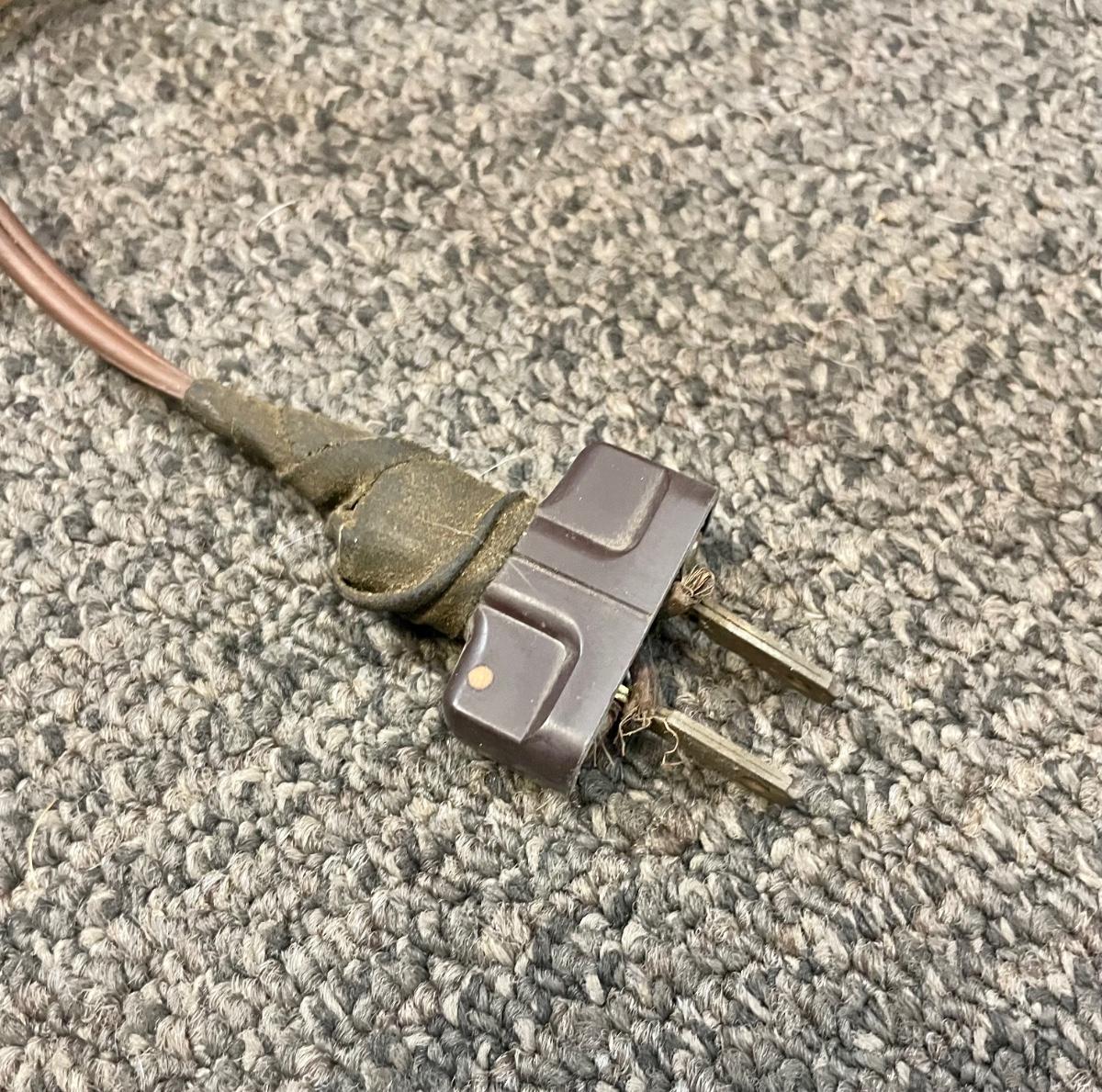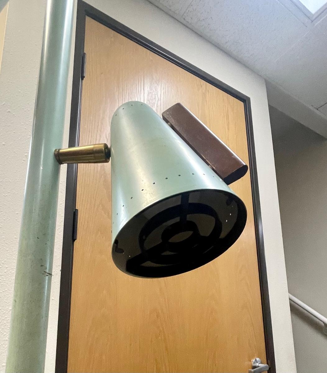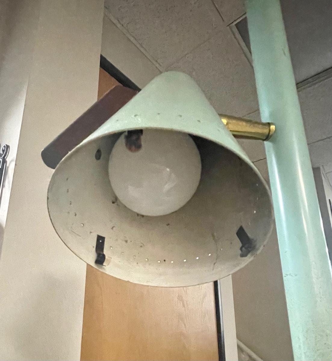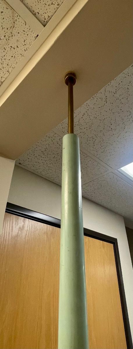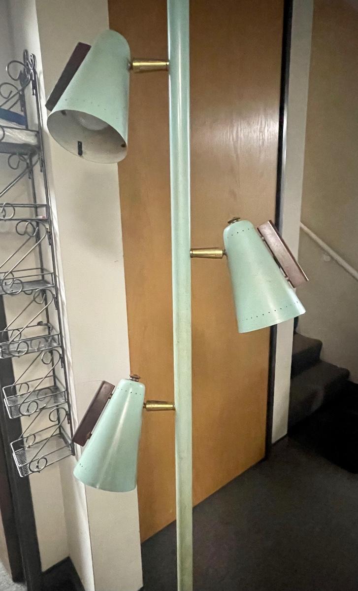 So cool! This tension pole lamp appears to be complete and comes with a bonus pole piece for higher ceilings, but it needs some TLC. Designed by Raymond Loewy for Ted Stiffel Lamps. 2 of the 3 black plastic light baffles are missing, see photos for details. Painted teal, parts of the finish appears to be discolored and rough on an end piece. It does work, we tested it and found that one of the three lamp sockets has some loose wires which should work once socket is fixed. We unfortunately didn't take photos of the lamp when we plugged it in and when we went to remove the plug from the wall socket the plug separated in our hand. We were able to put the pieces back together, but we don't feel comfortable plugging it back in. We are sure that there is an experienced lamp person that is going to thoroughly enjoy restoring this beautiful Mid-Century piece.