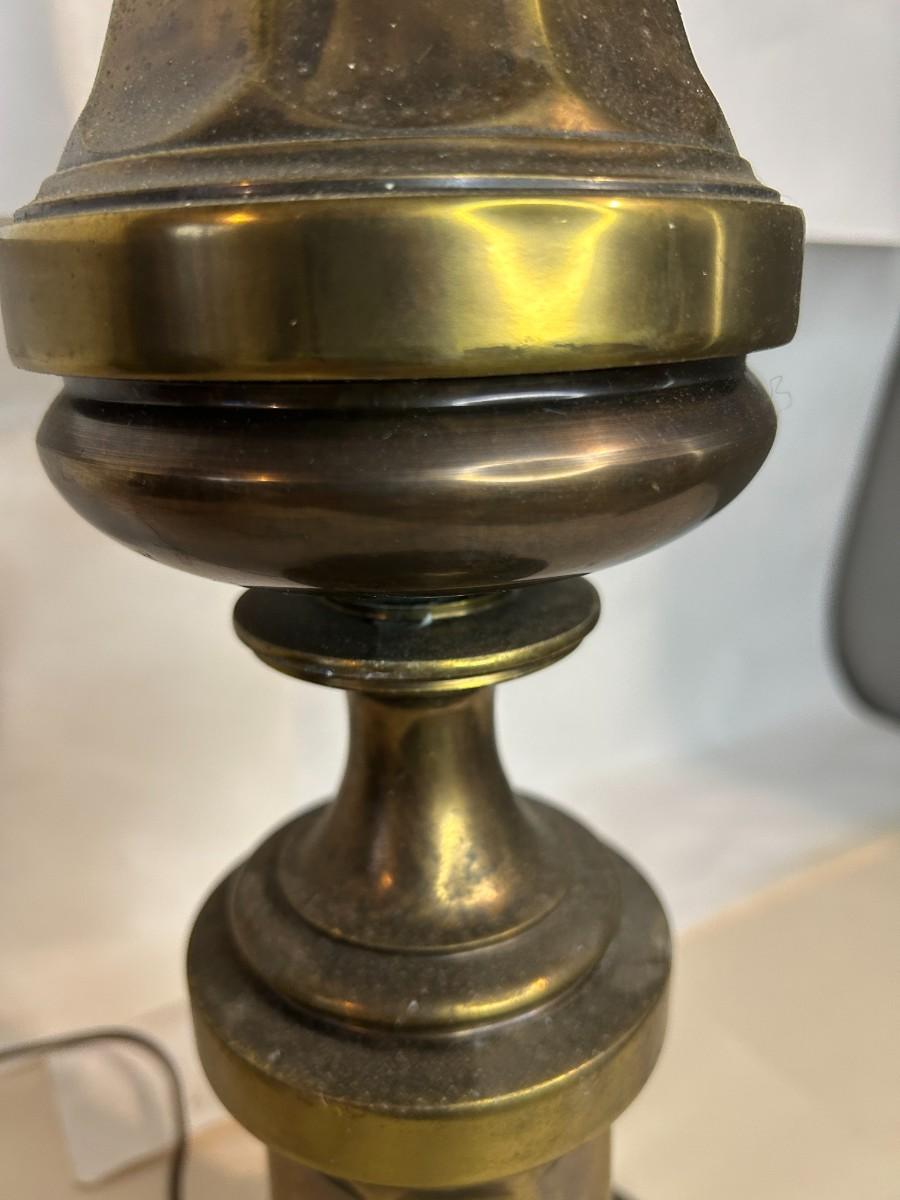 With its substantial brass structure, this traditional lamp will complete any room. It has the original push-button switch, which was upgraded to a 3-way at some point. It is structurally in excellent condition with no chips or cracks, although it will benefit from detailed polishing, hence the reduced price.