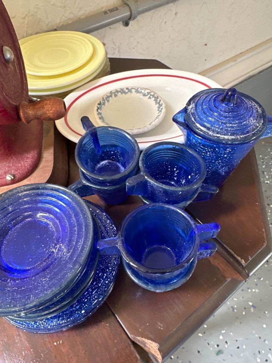 Vintage stitch mistress hand crank sewing machine & Cobalt 40's child dishes Paint splatter is on the Cobalt 40's child dishes