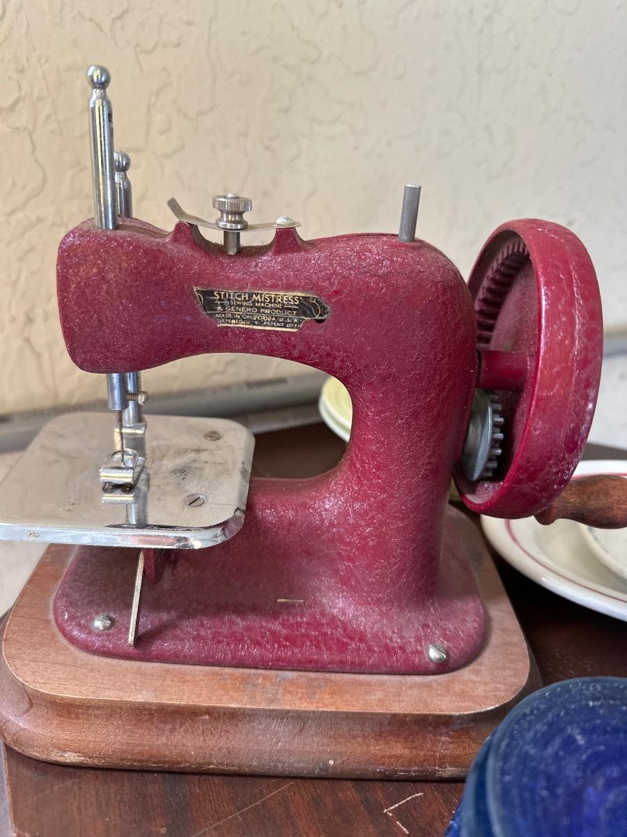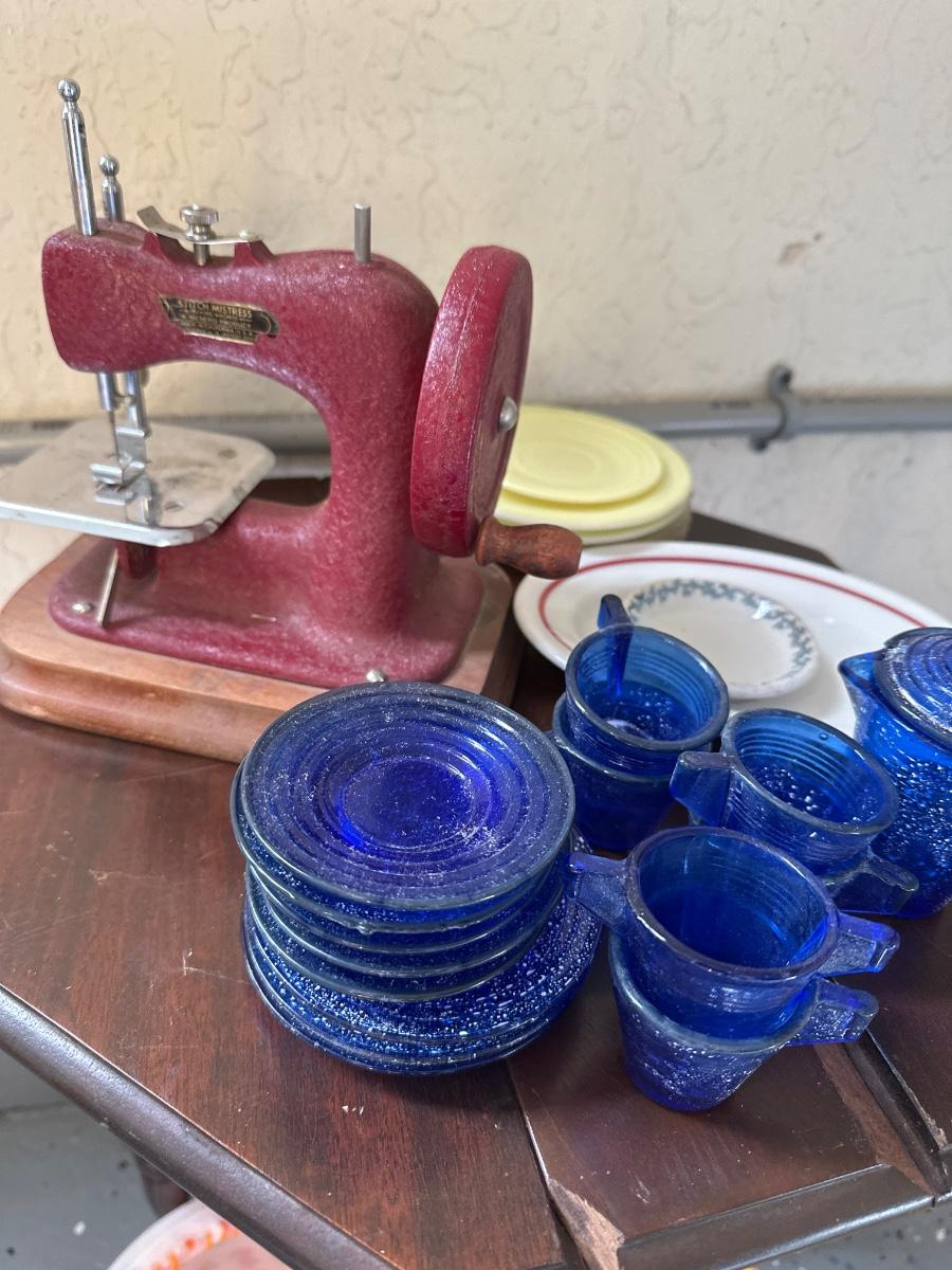 Vintage stitch mistress hand crank sewing machine & Cobalt 40's child dishes
