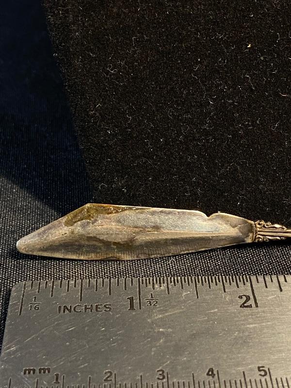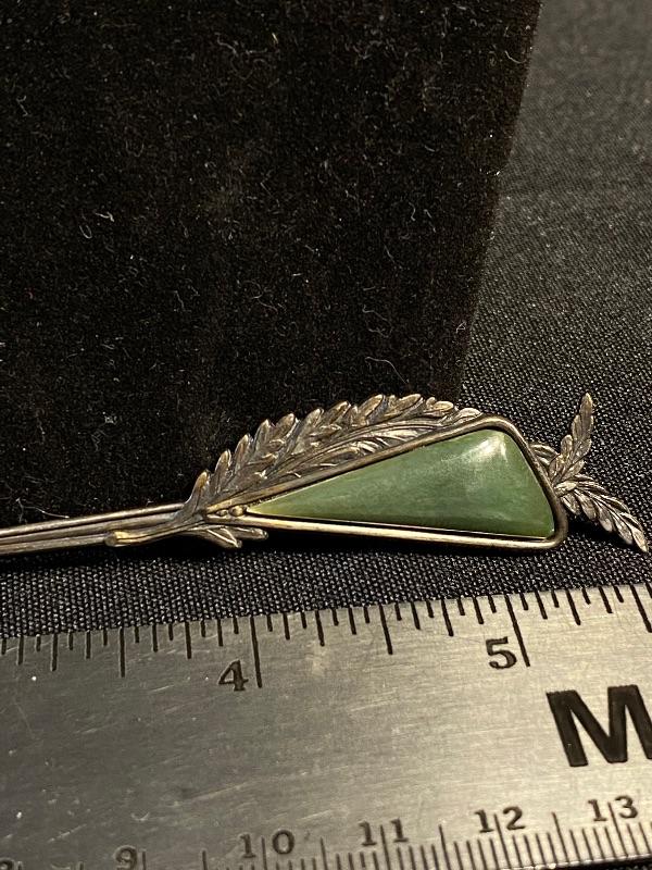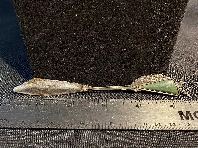 Vintage stone inlaid letter opener. Made by Peak. Unsure of the stone used, possibly jade or green jasper. Measures 5 3/4". No sterling mark so unsure of metal. There is some discoloration from age.