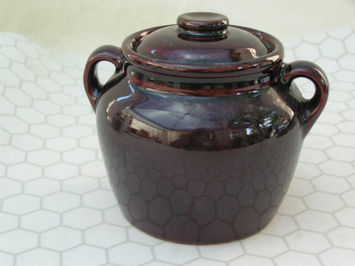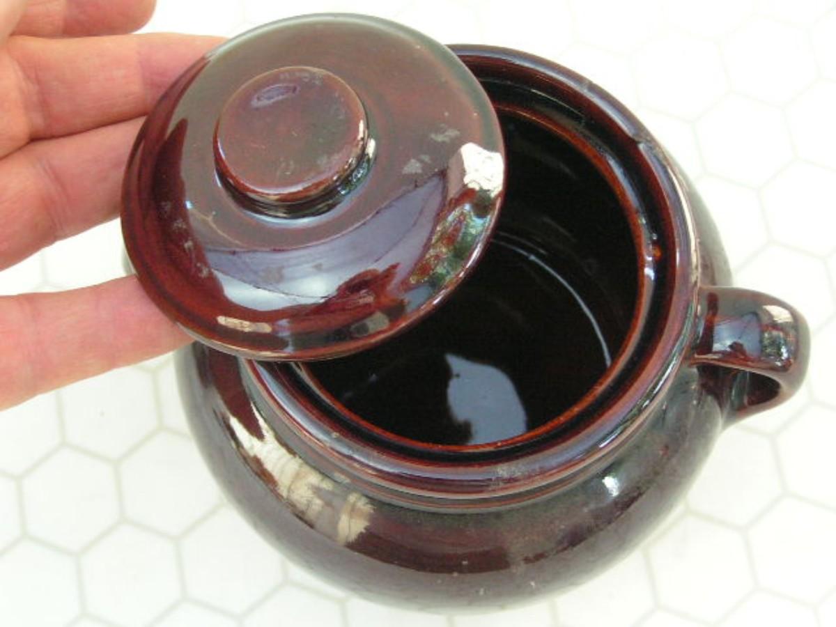 Vintage Stone Ware crockery bean pot w/brown glaze. Marked U S A on bottom. About 4-3/4" tall including lid. CLEAN!
