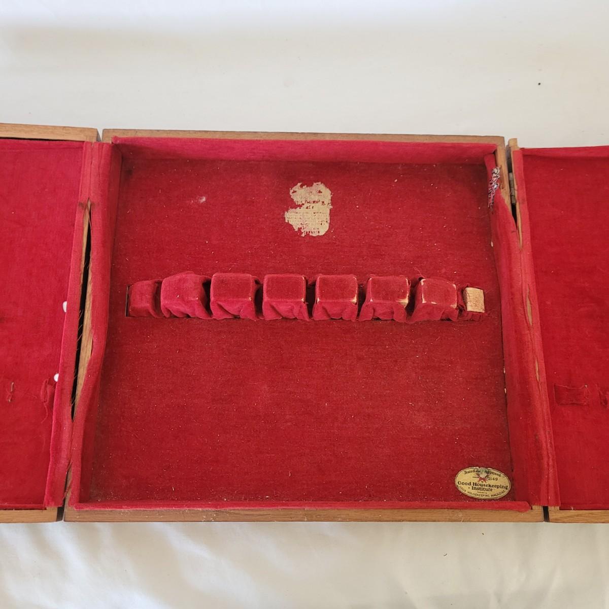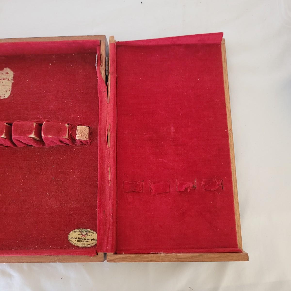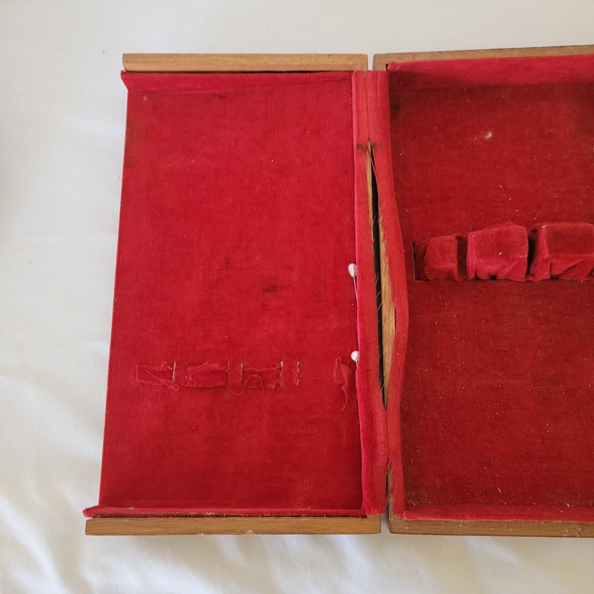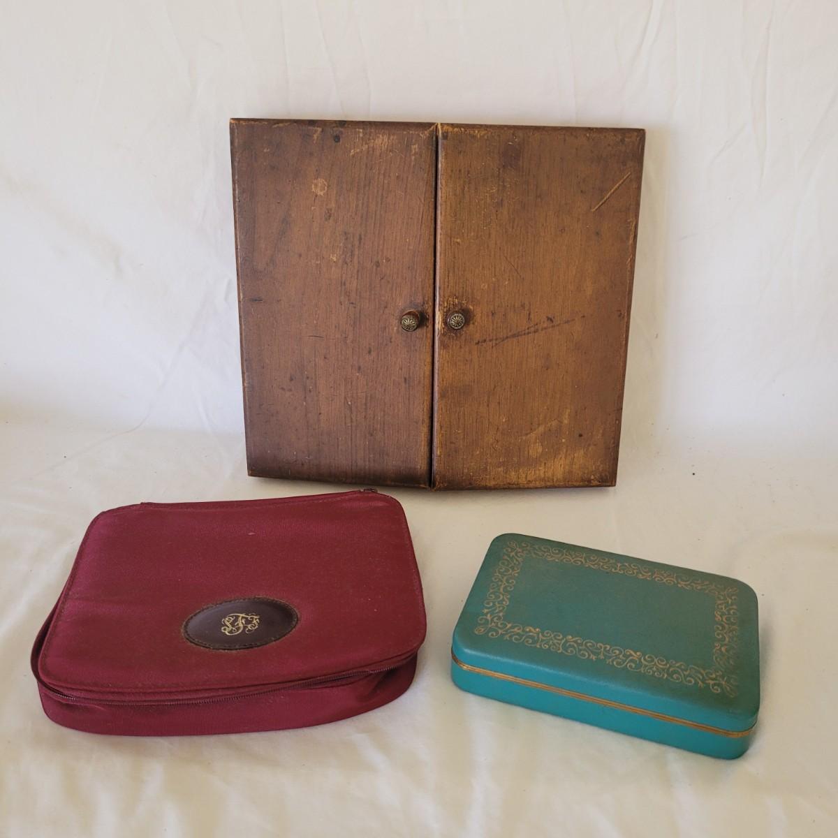 This lot of vintage storage cases includes a wooden serveware case with dovetail joints, a small velvet lined jewelry case and a pouch with snapping straps. Wooden case measures approximately 12” x 2” x 11”H. Shipping available.