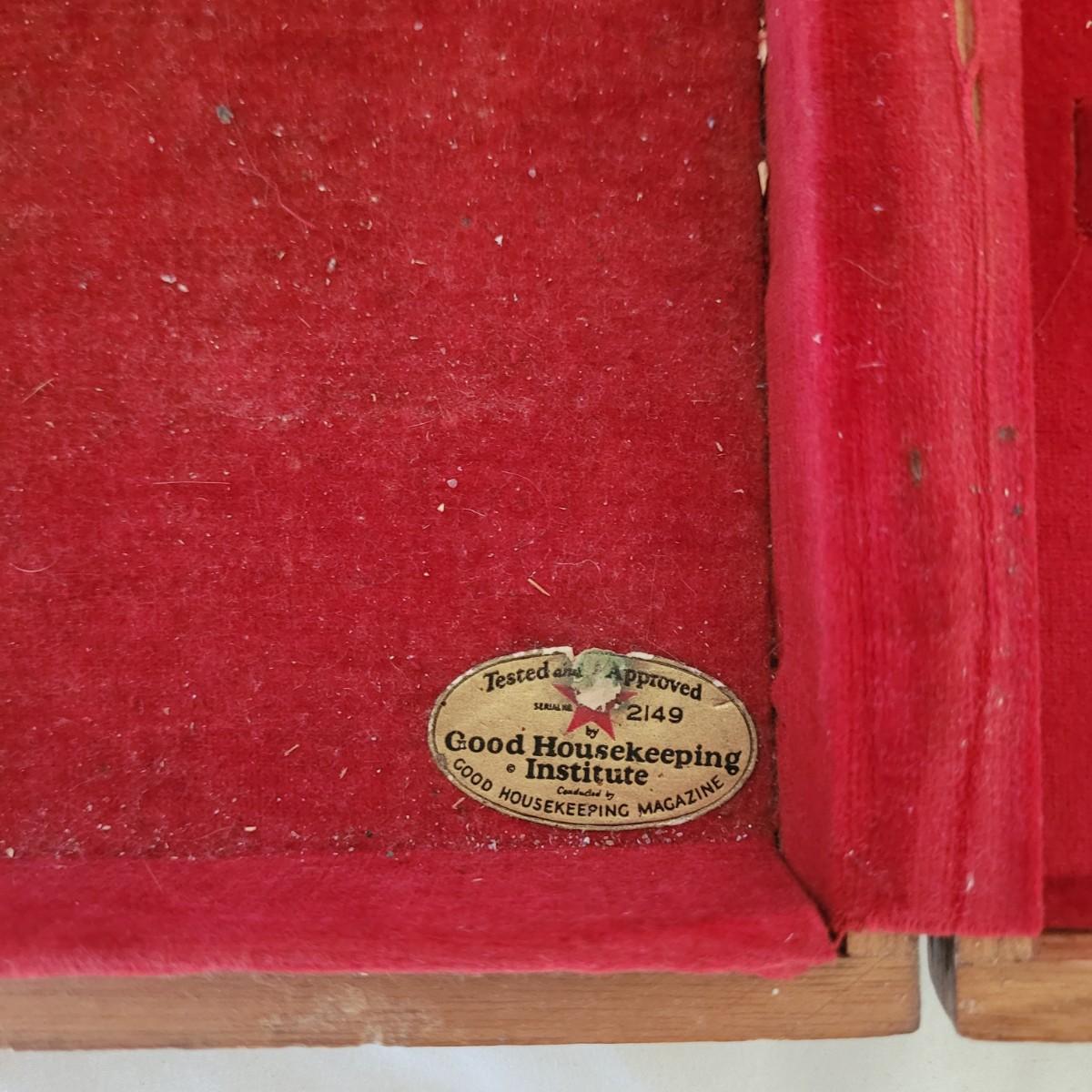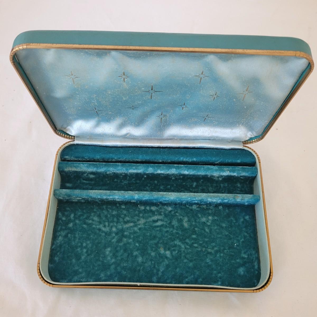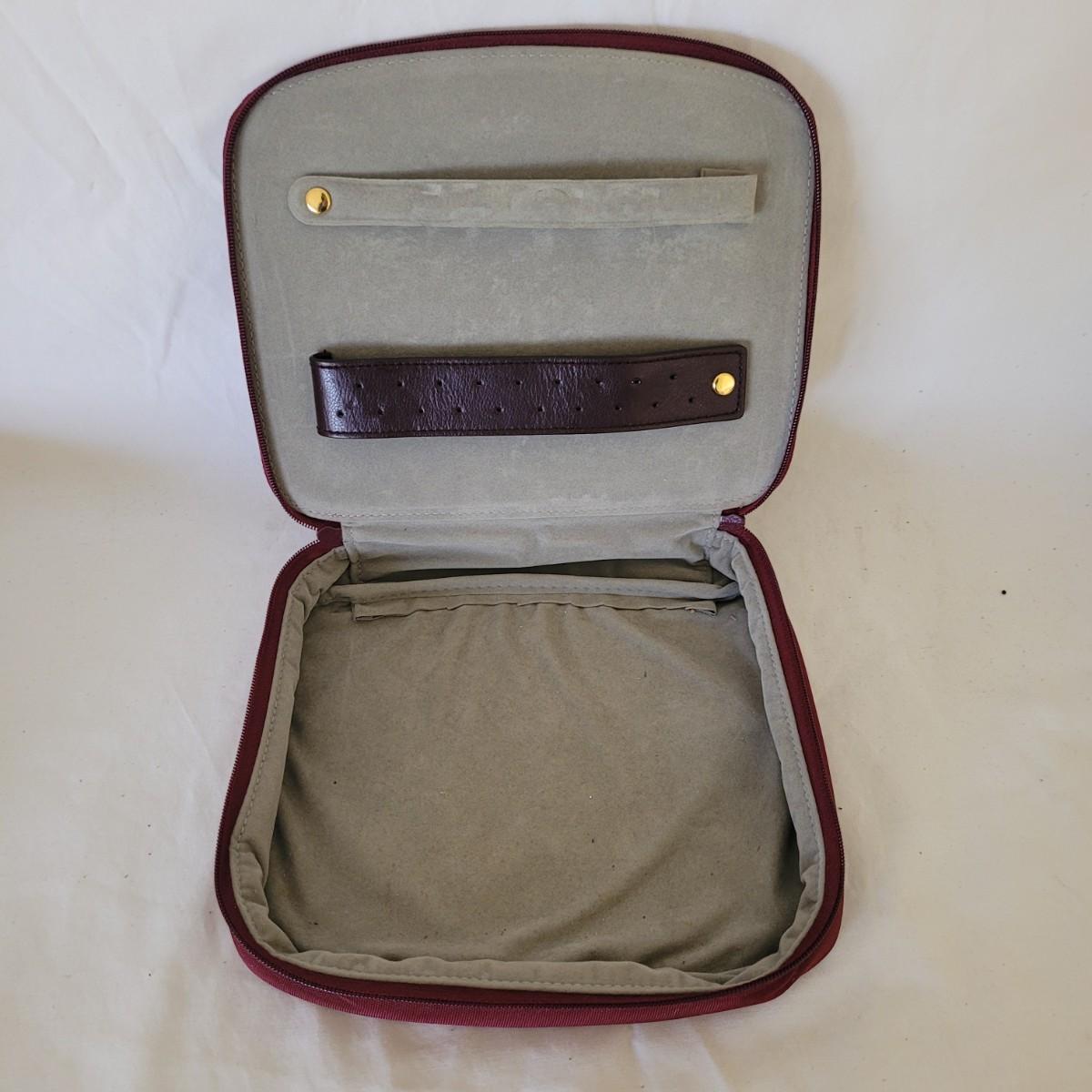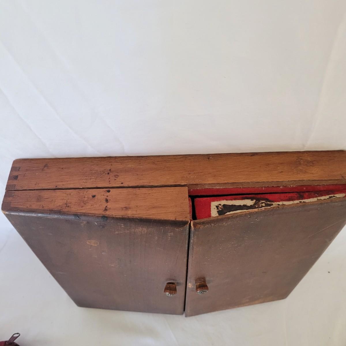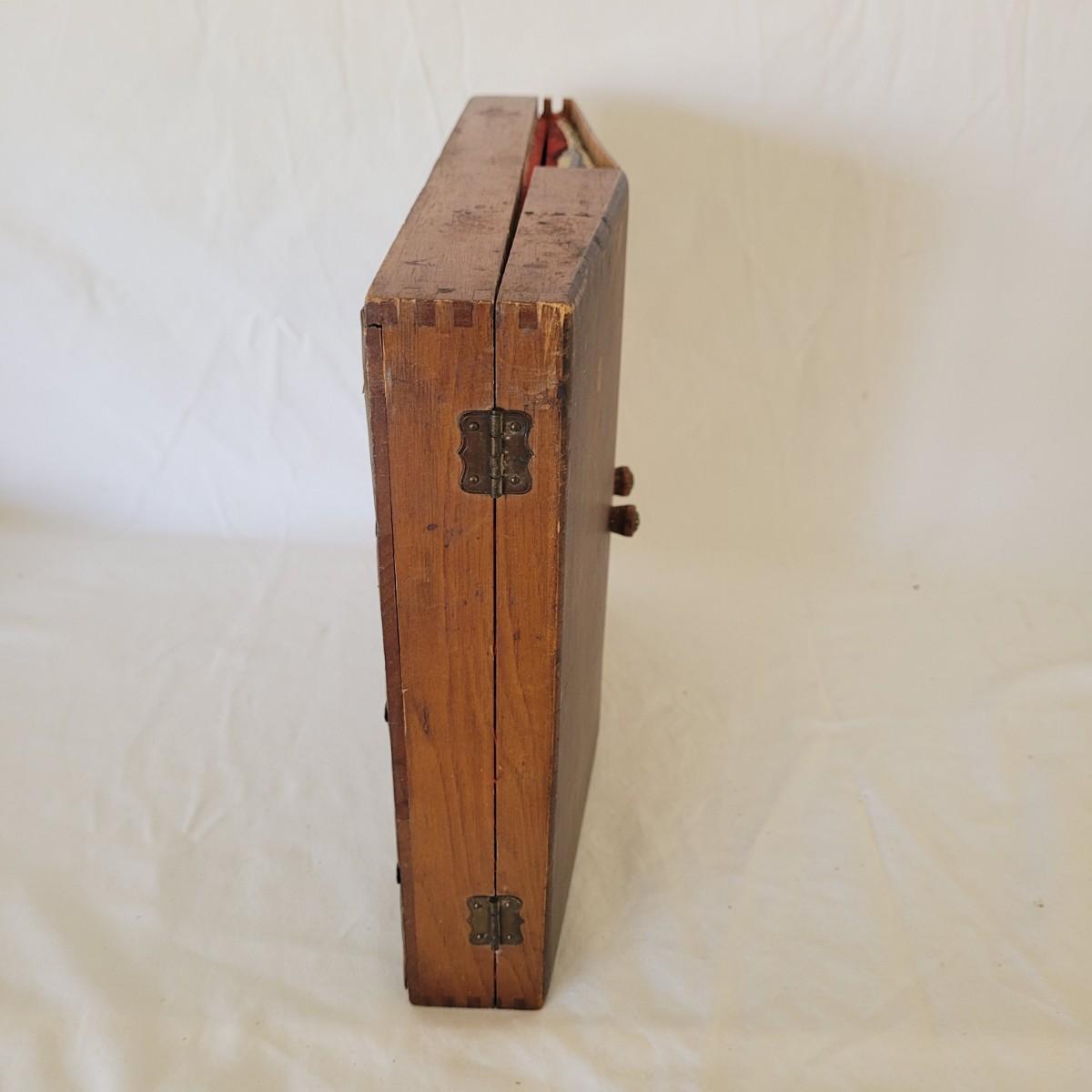 This lot of vintage storage cases includes a wooden serveware case with dovetail joints, a small velvet lined jewelry case and a pouch with snapping straps. Wooden case measures approximately 12” x 2” x 11”H. Shipping available.