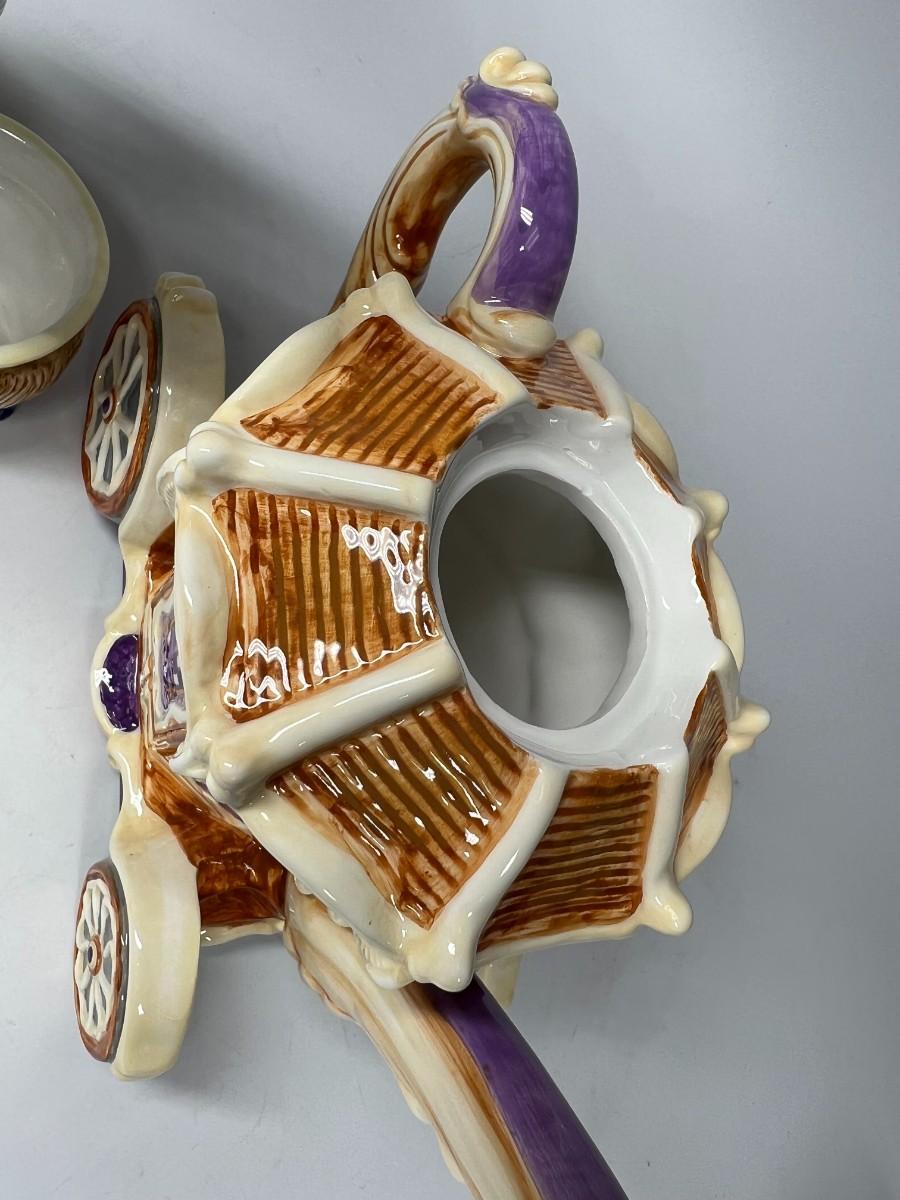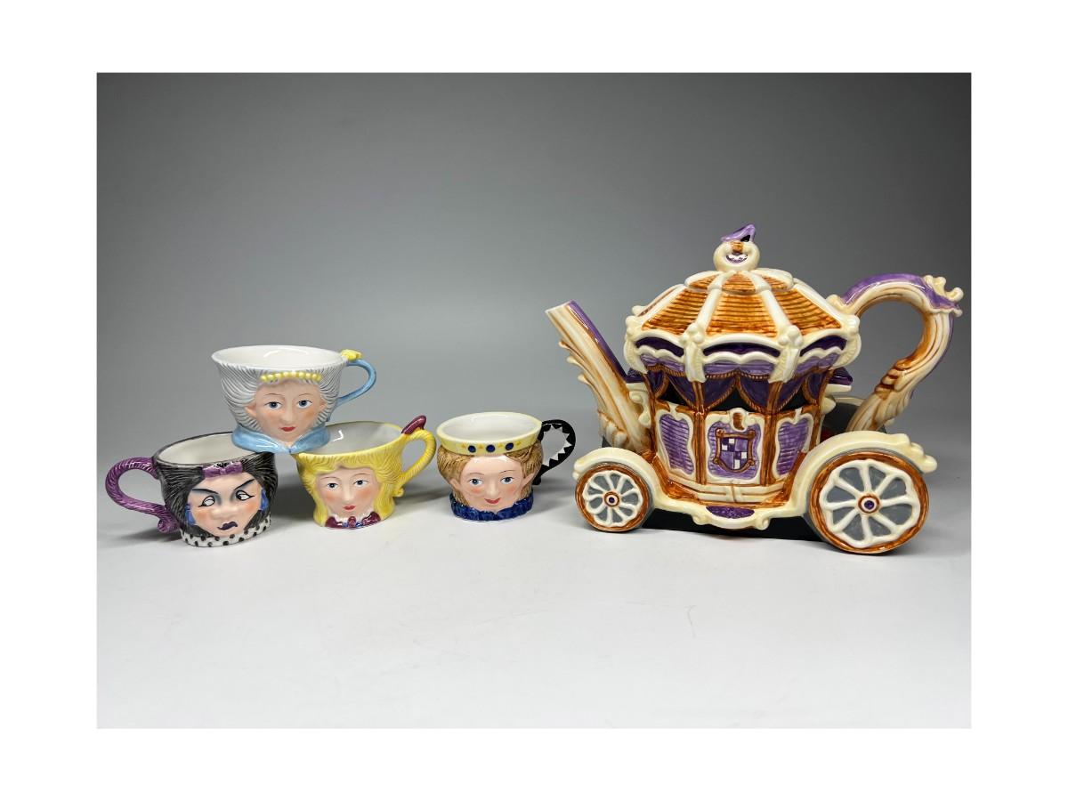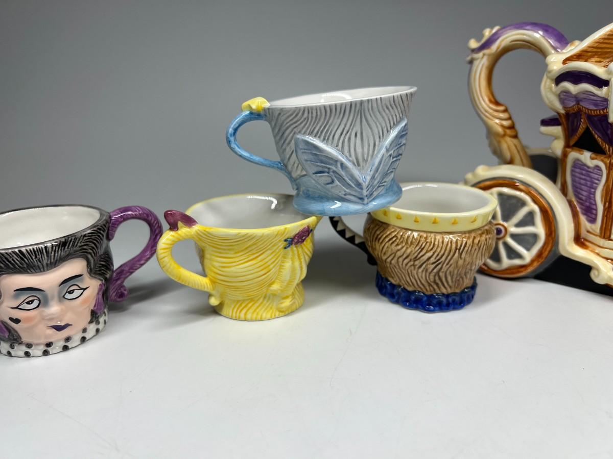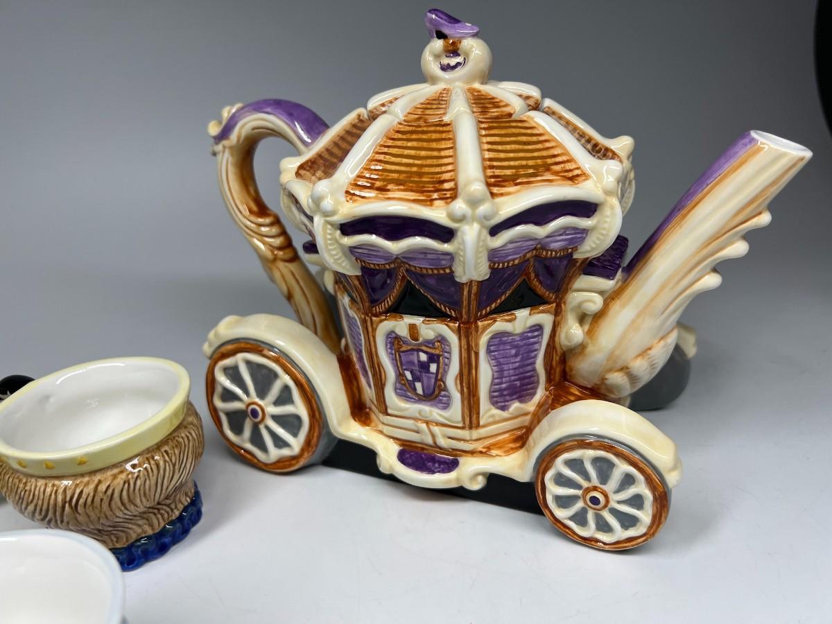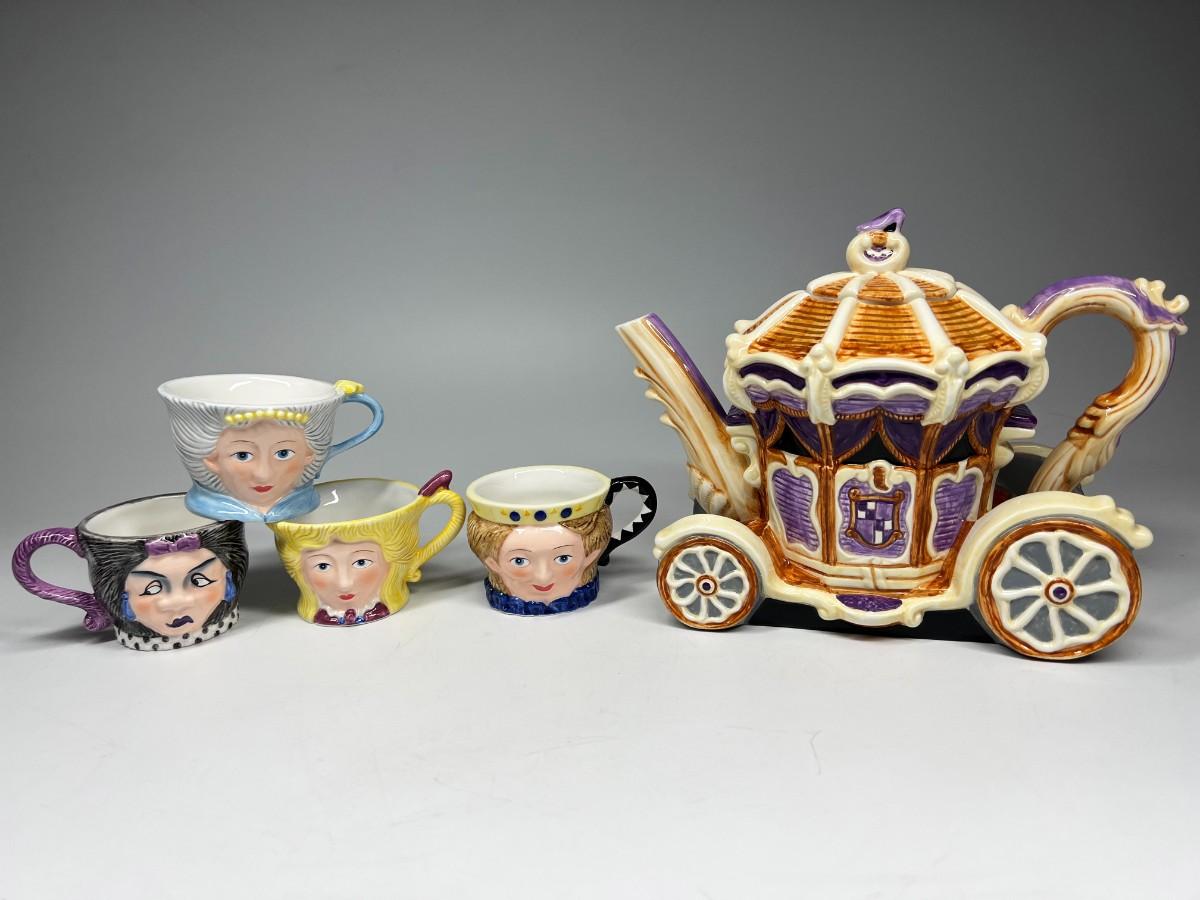 Vintage Storybook Tea Set Cinderella Teapoy & Cups Department 56. Come in original box. Carriage shaped teapot with a different character for each cup. In good condition.