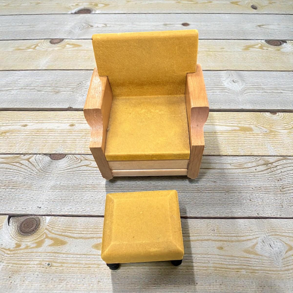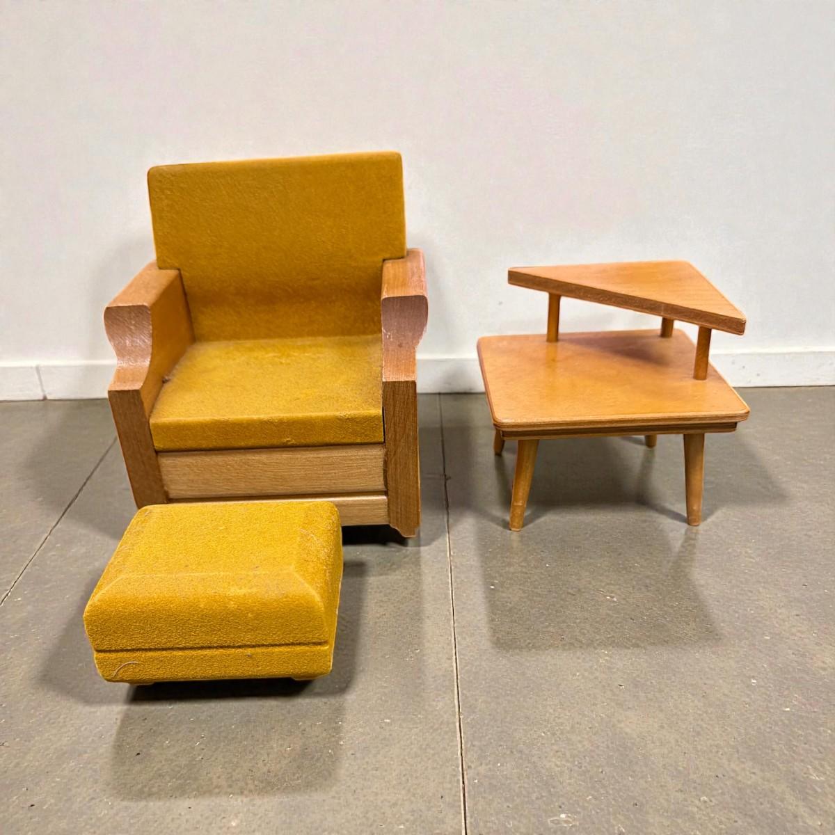 Vintage Strombecker wooden Dollhouse Living Room Furniture Set with a yellow flocked armchair, ottoman and side table