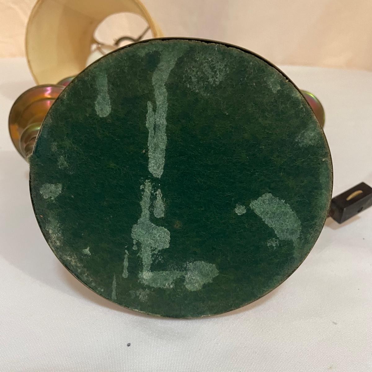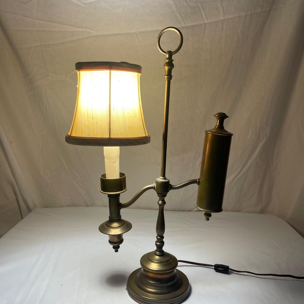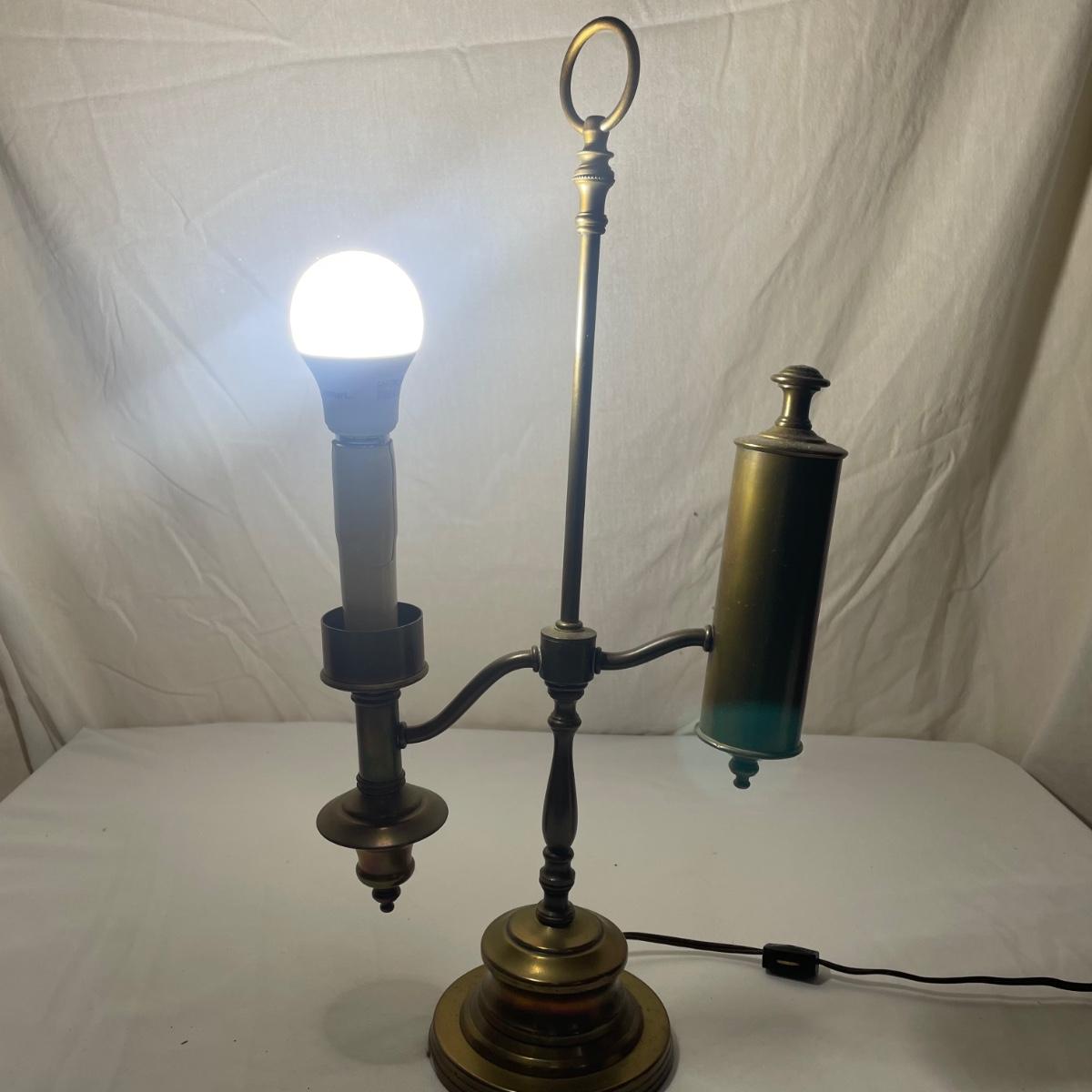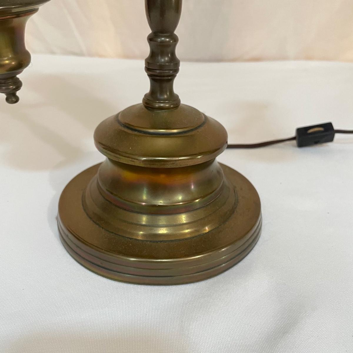 This vintage student desk lamp is in good condition with just a few stains on the felt base and also on its shade. It appears to be solid brass; the top with the ring is loose but could be secured with some glue.