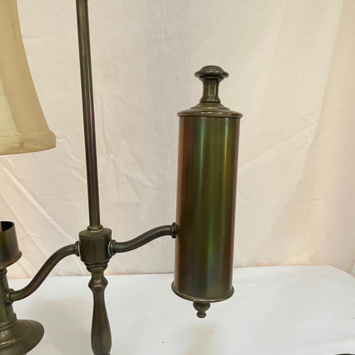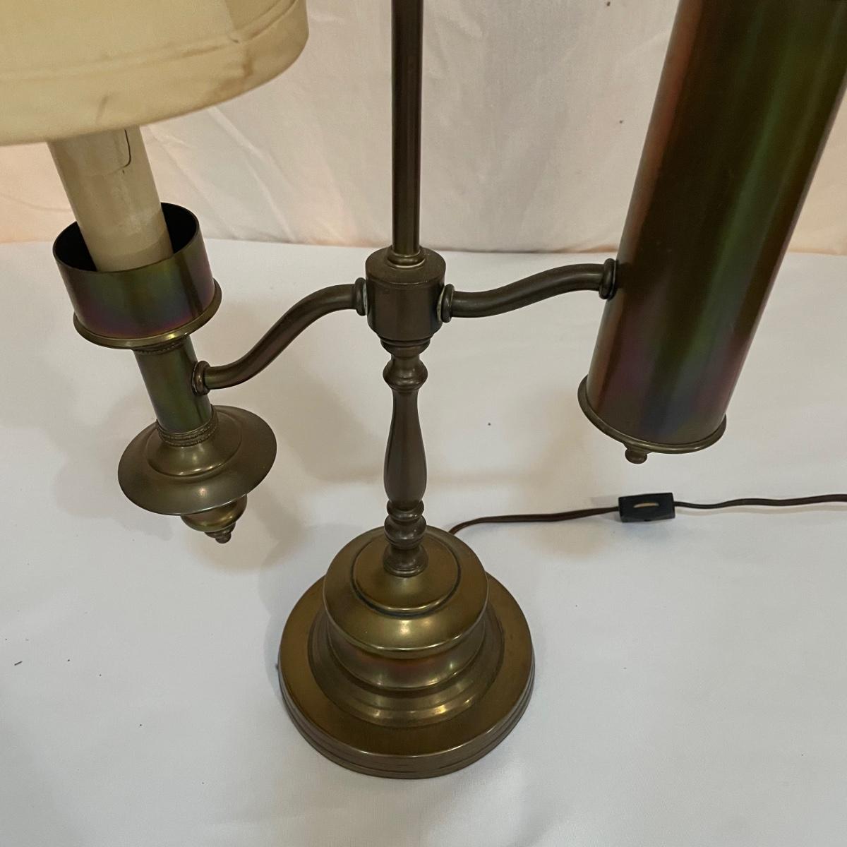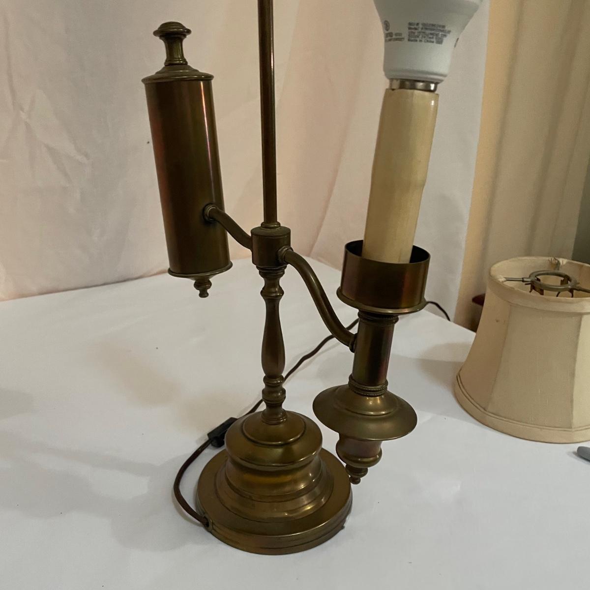 This vintage student desk lamp is in good condition with just a few stains on the felt base and also on its shade. It appears to be solid brass; the top with the ring is loose but could be secured with some glue.