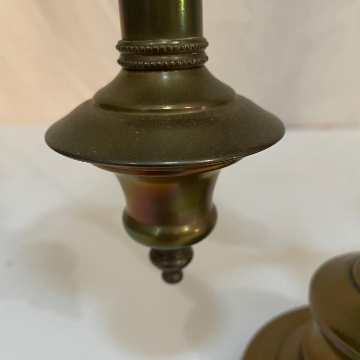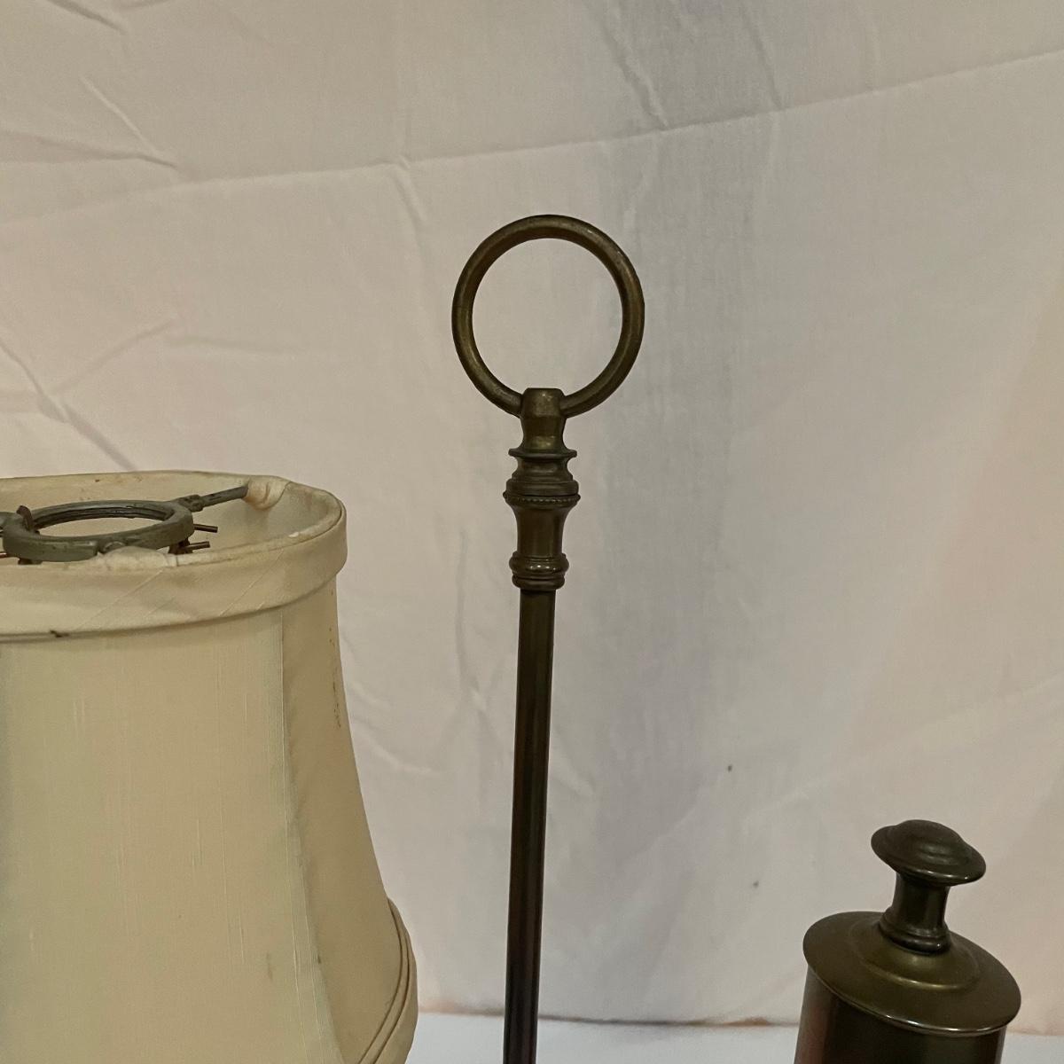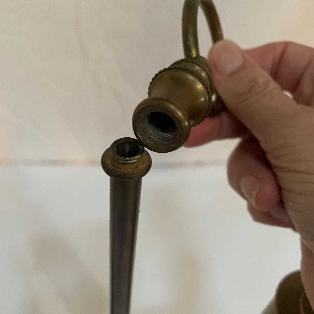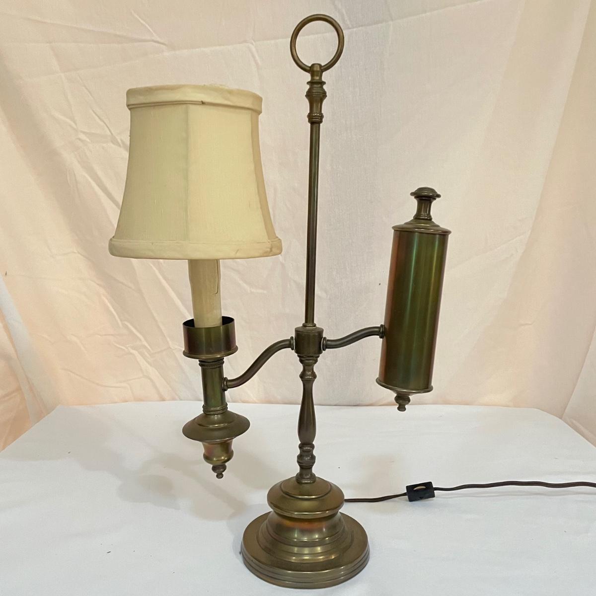 This vintage student desk lamp is in good condition with just a few stains on the felt base and also on its shade. It appears to be solid brass; the top with the ring is loose but could be secured with some glue.