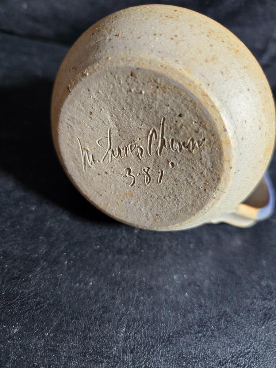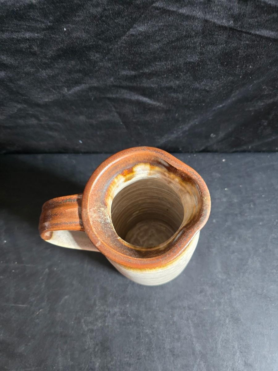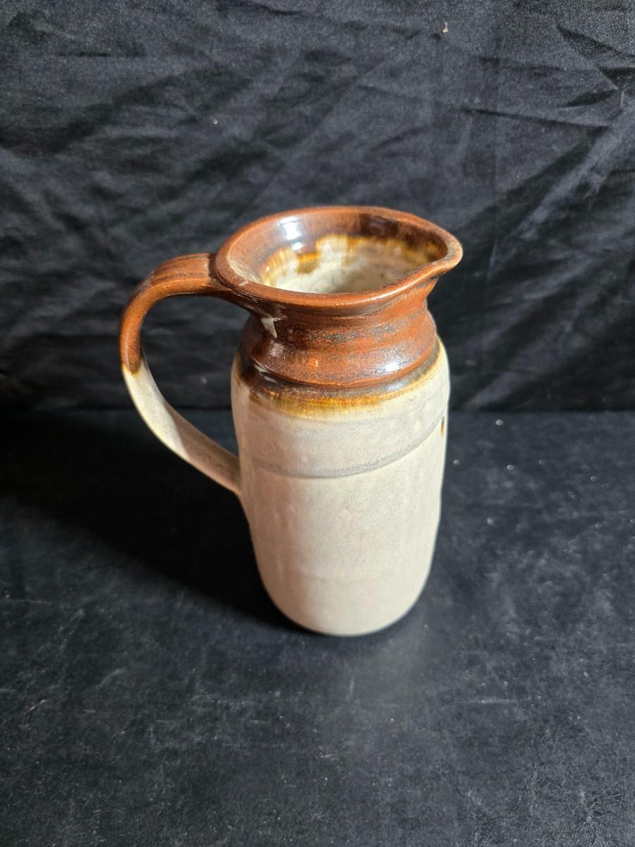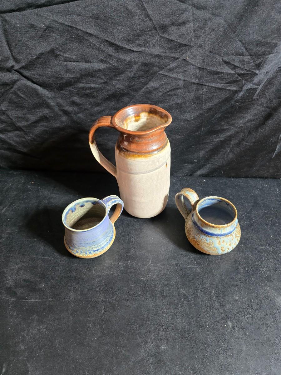 vintage studio pottery pitcher with two mugs - each signed by artist