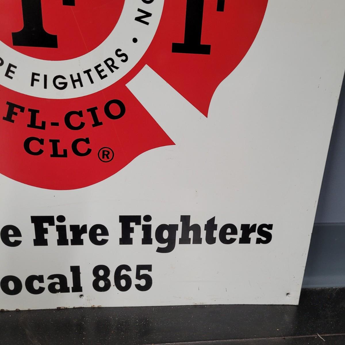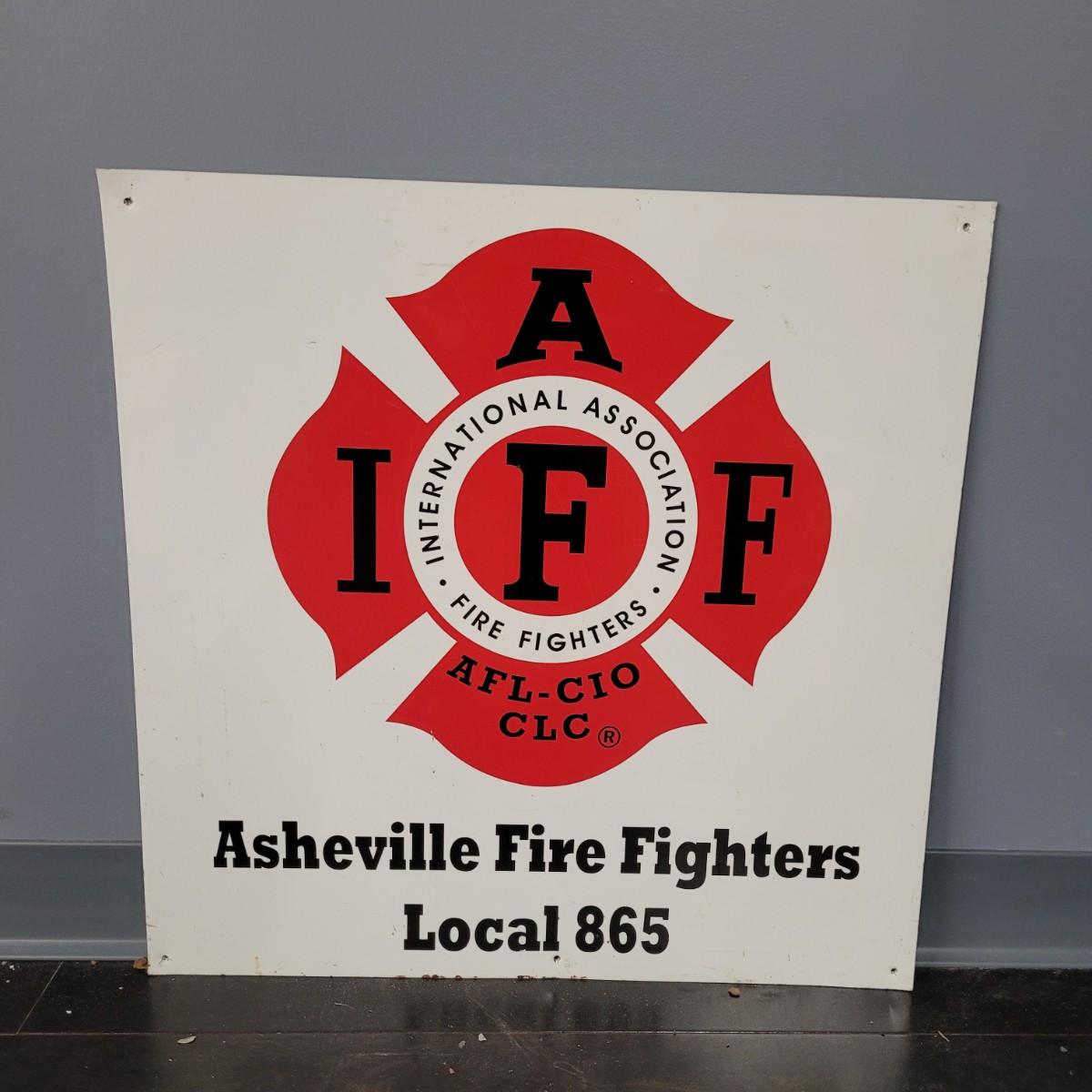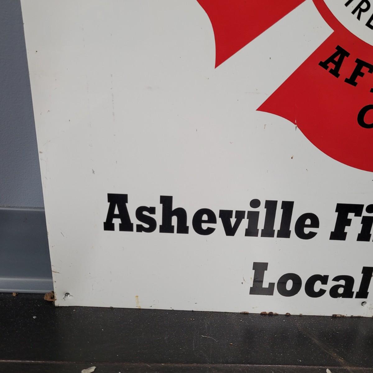 Vintage style Asheville Fire Fighters metal sign. Normal wear and tear throughout, scrapes and bends in metal (see pictures). Measures approximately 24.5" sq. Fire Fighters Combat Challenge nylon flag. Normal wear and tear with slight staining (see pictures). Measures approximately 61" x38.5". Shipping available.