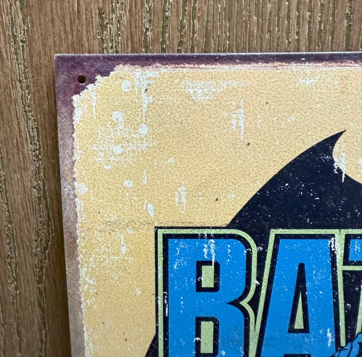 Painted metal sign with an image of the classic 1930’s DC comics Batman. Image is distressed to make it look old.