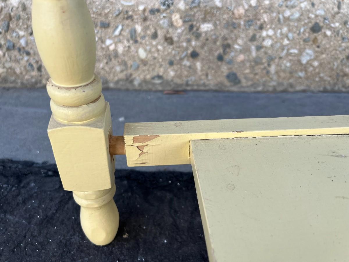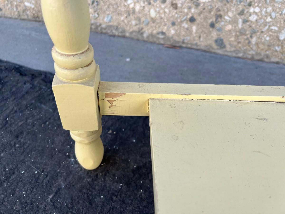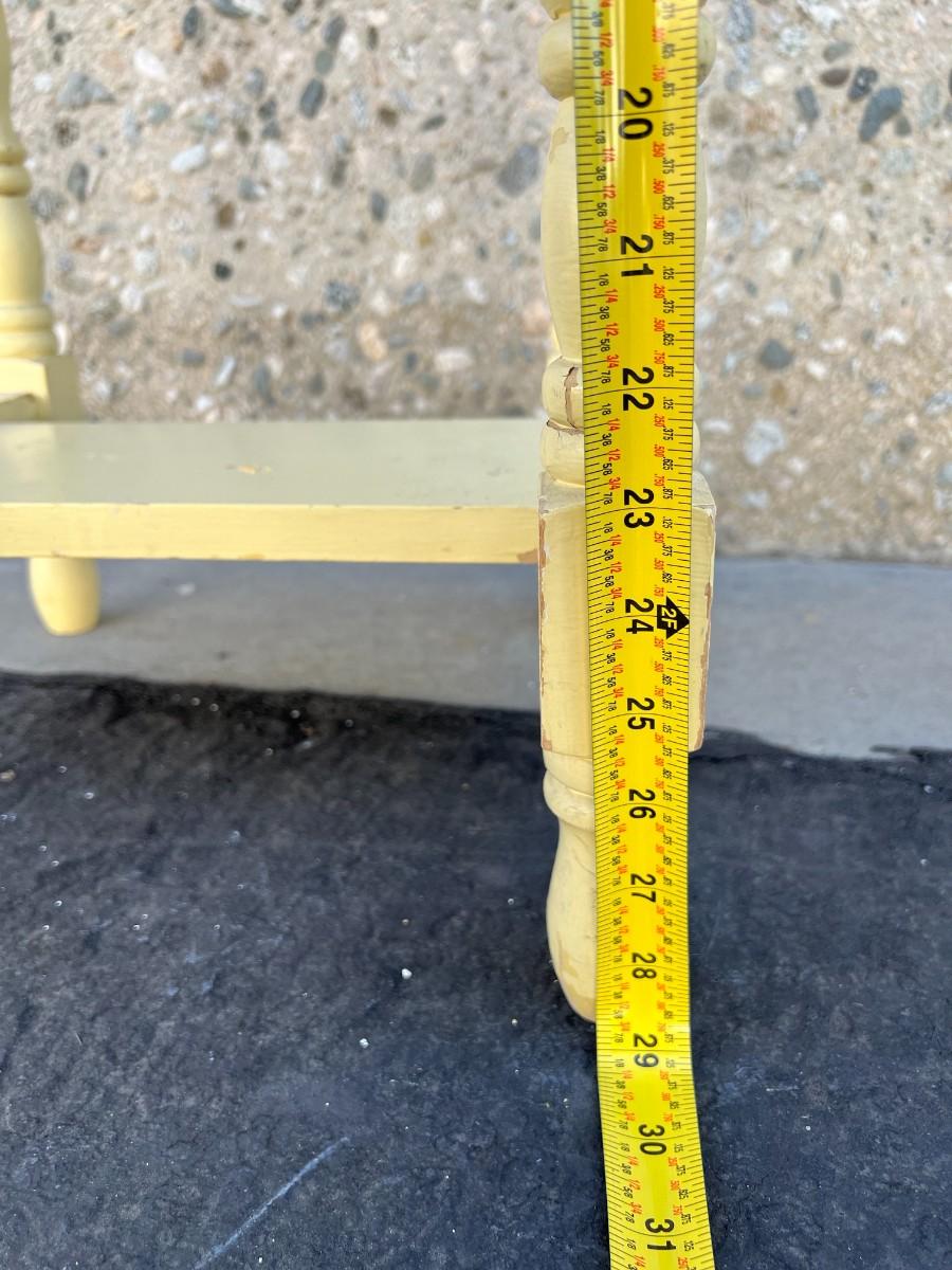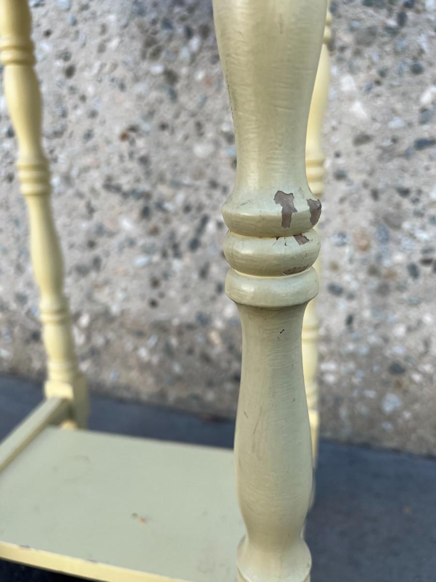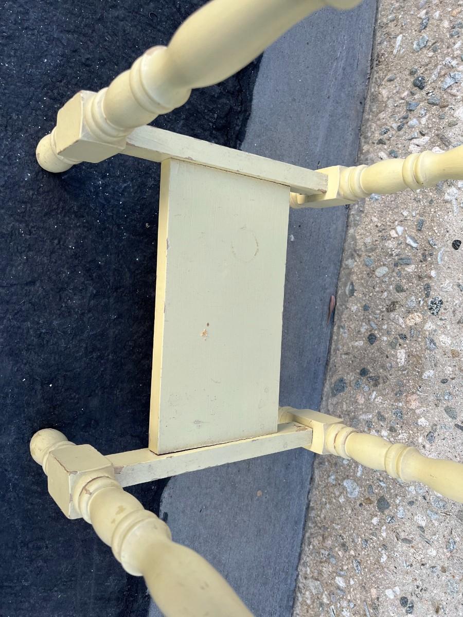 There is some wear to the piece and one of the wooden legs is sticking out and needs to be re-glued, but there is no other significant damage and is in overall good displayable or useable condition. Check pictures for more details and for sizing.