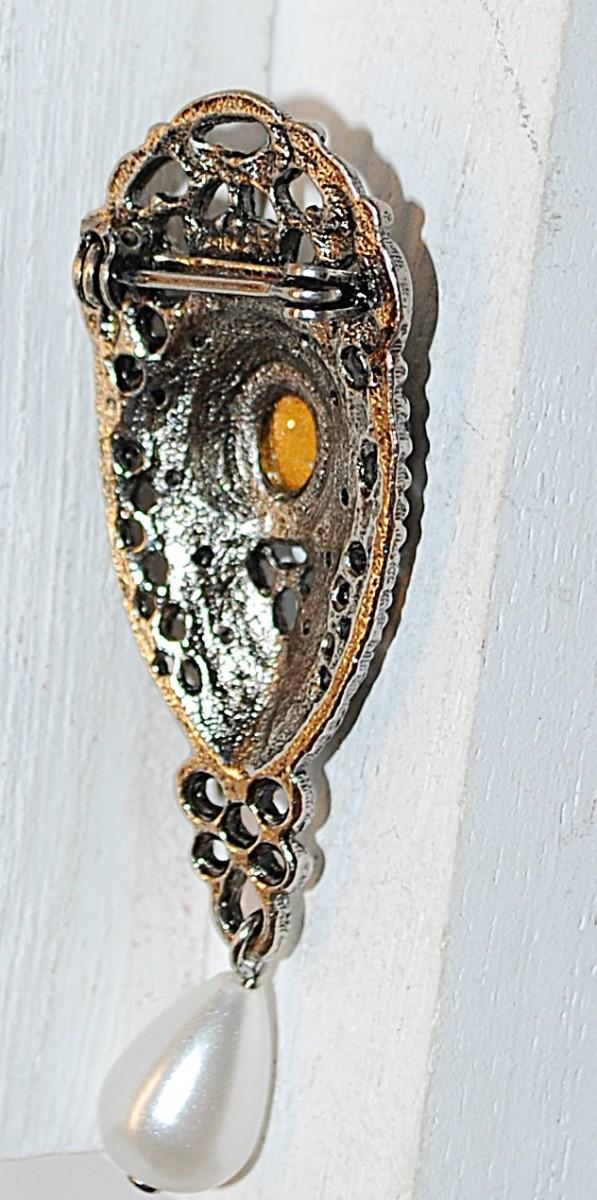 Vintage Style Intertwined Metal Setting BROOCH (2½") with Oval Center Stone & Dangle Faux Pearl