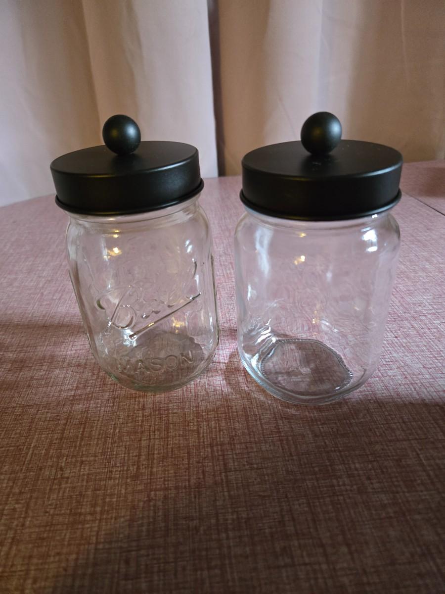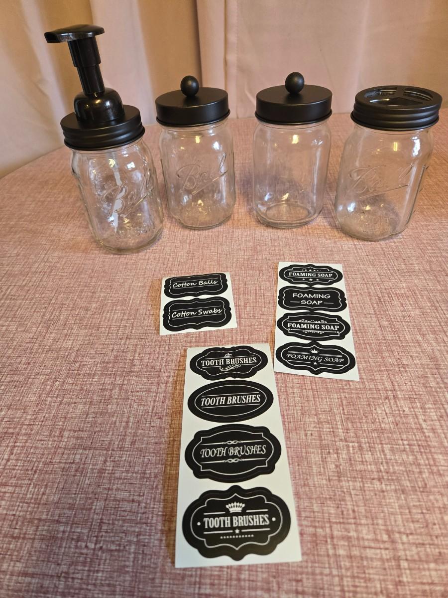 Vintage look accessories to turn Mason jars into bathroom accessories, never used. Jars & stickers included.