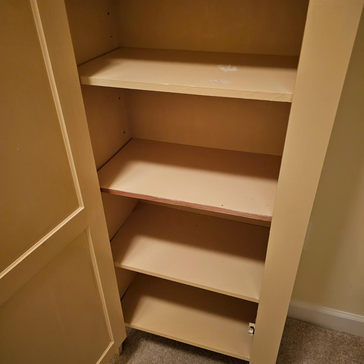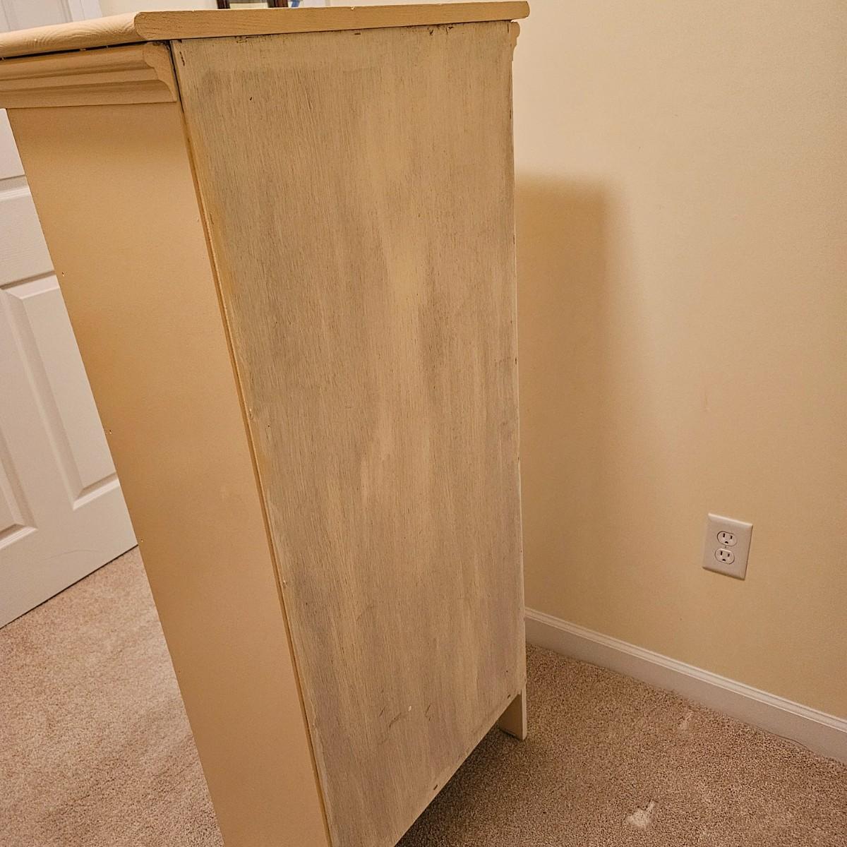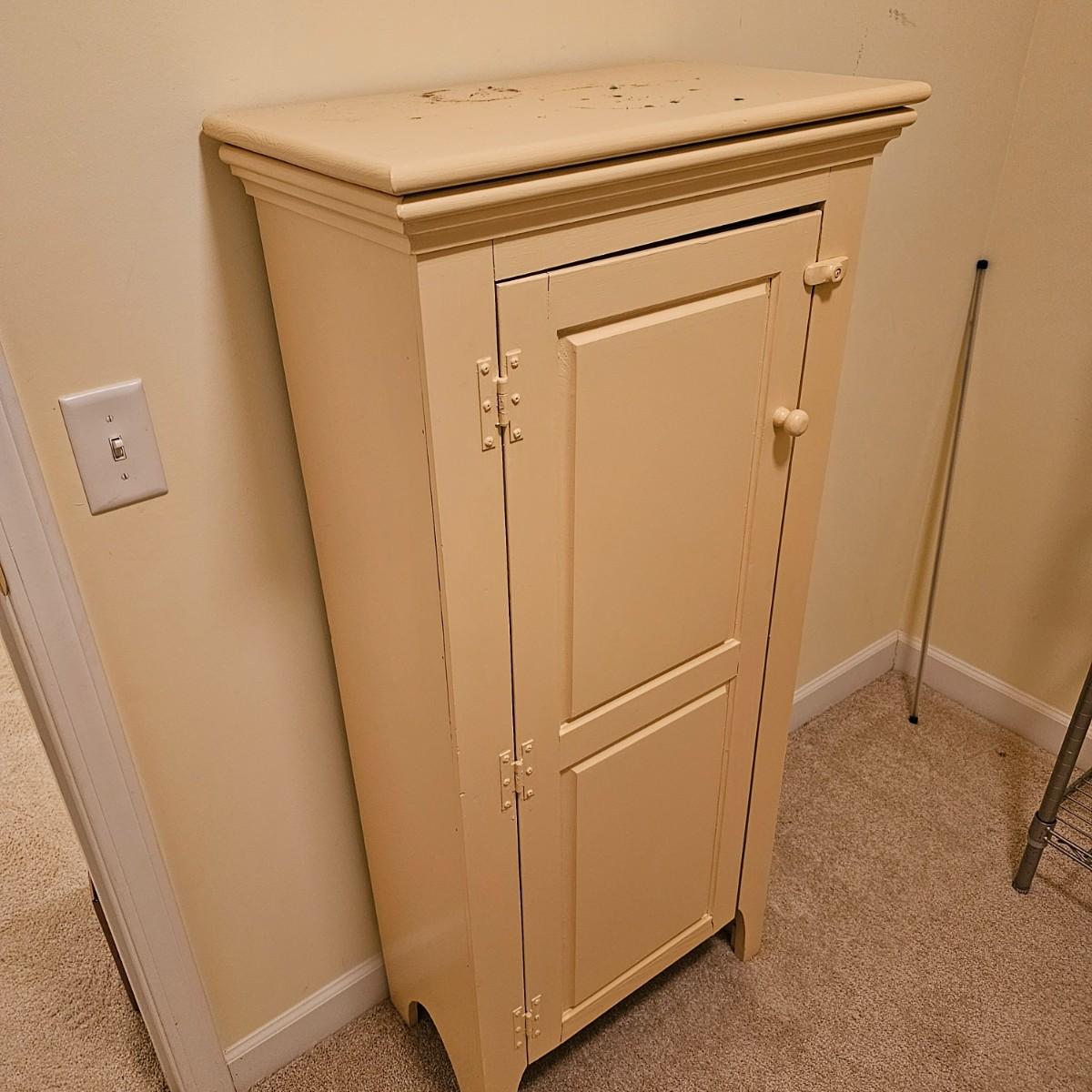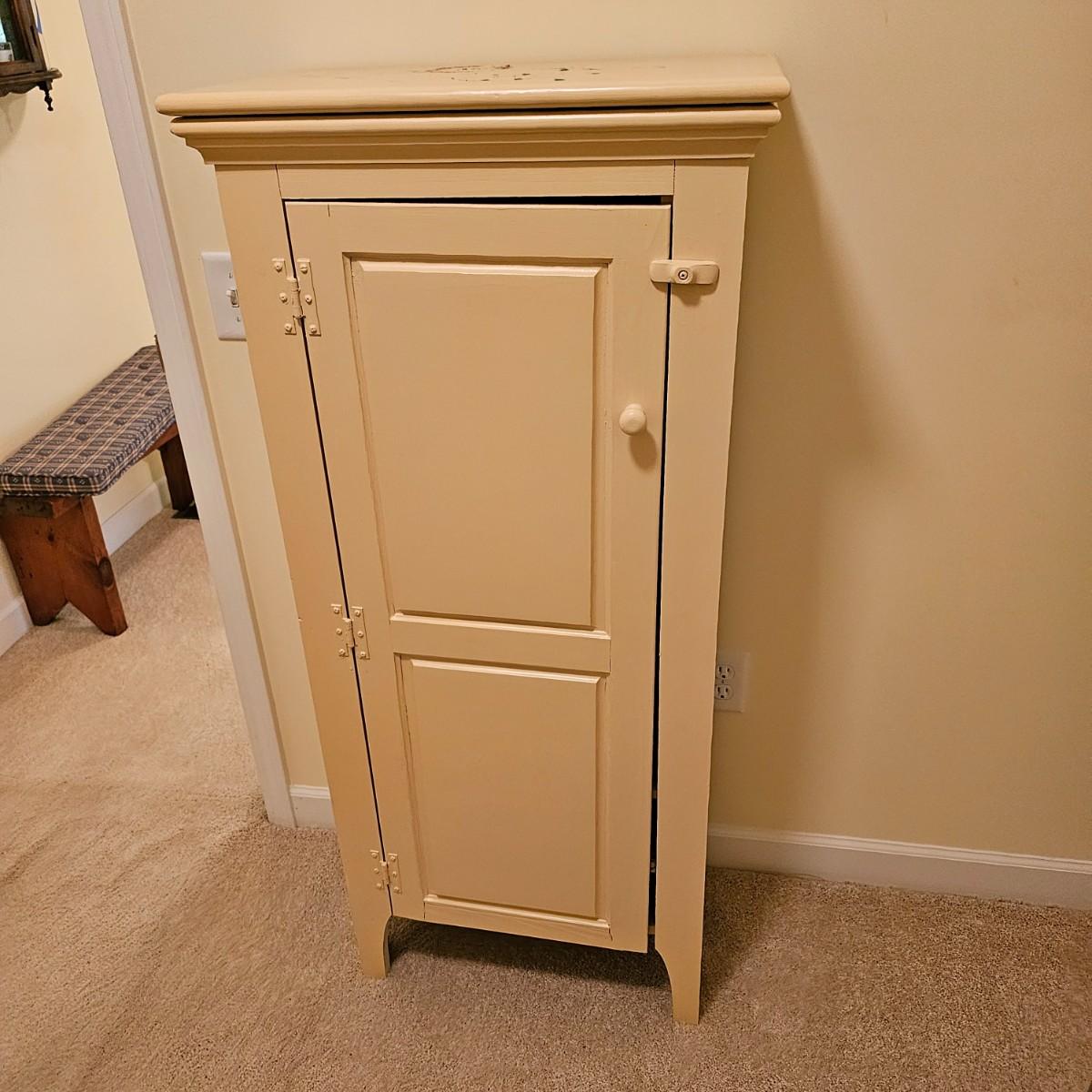 A wooden cabinet that has been painted a light yellow color. It appears to be pine with a manufactured wood back. The piece has three adjustable shelves inside. Door has old style wood latch. Unit measures 23" x 13" x 50"H. Some conditions issues on top, Please see photos for details. Local pickup only. This item is located upstairs. Winning bidder must bring assistance to help move and load this item due to its size and location.
