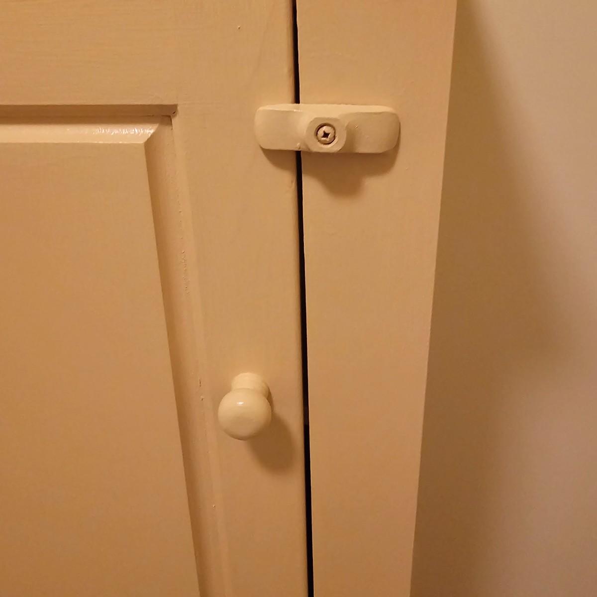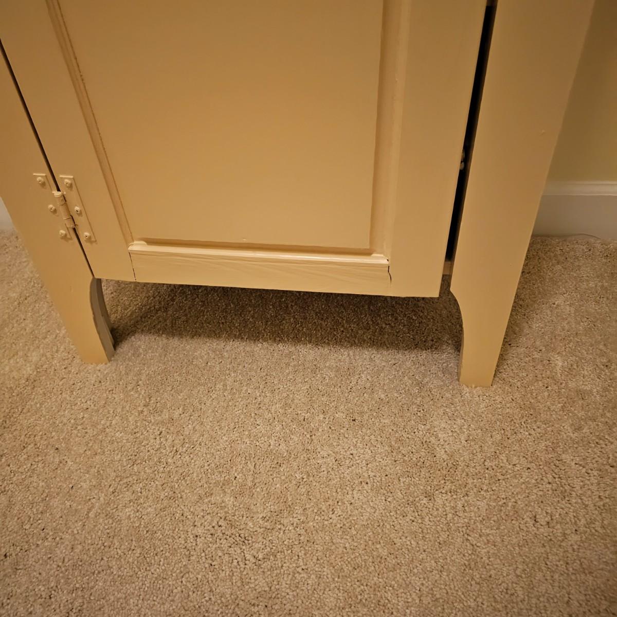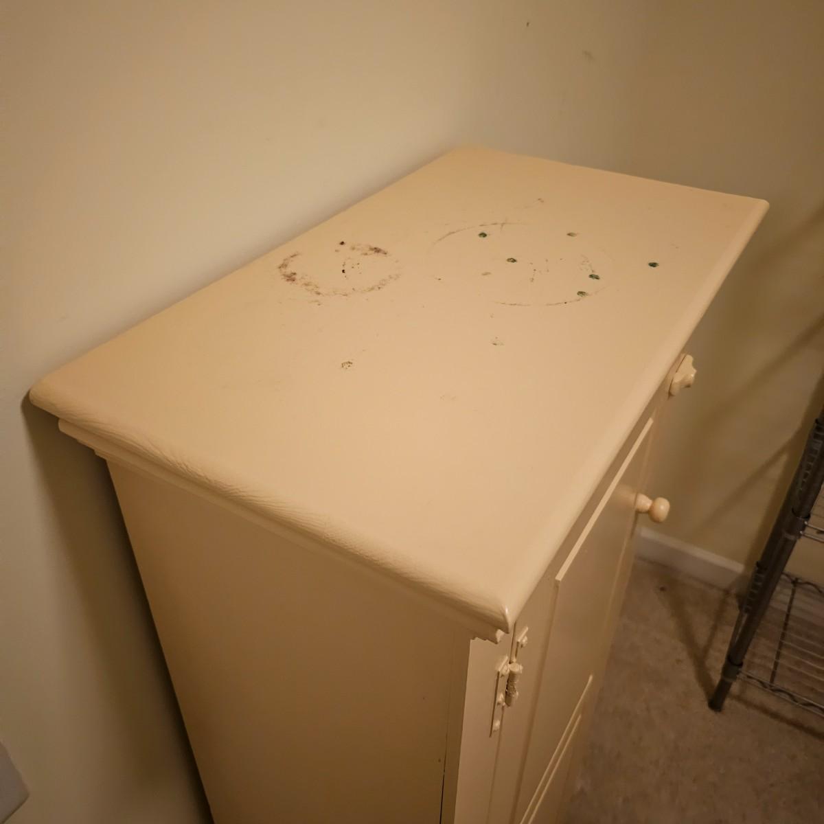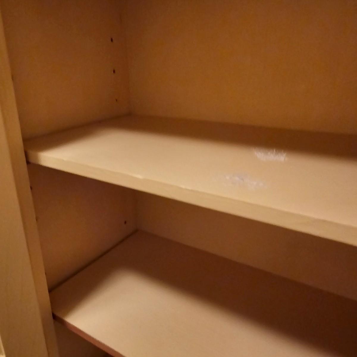 A wooden cabinet that has been painted a light yellow color. It appears to be pine with a manufactured wood back. The piece has three adjustable shelves inside. Door has old style wood latch. Unit measures 23" x 13" x 50"H. Some conditions issues on top, Please see photos for details. Local pickup only. This item is located upstairs. Winning bidder must bring assistance to help move and load this item due to its size and location.