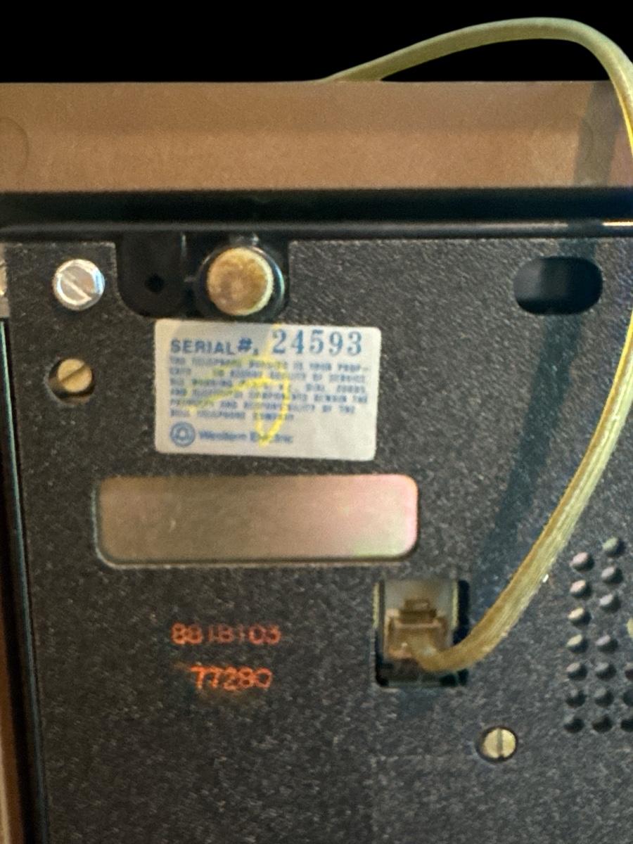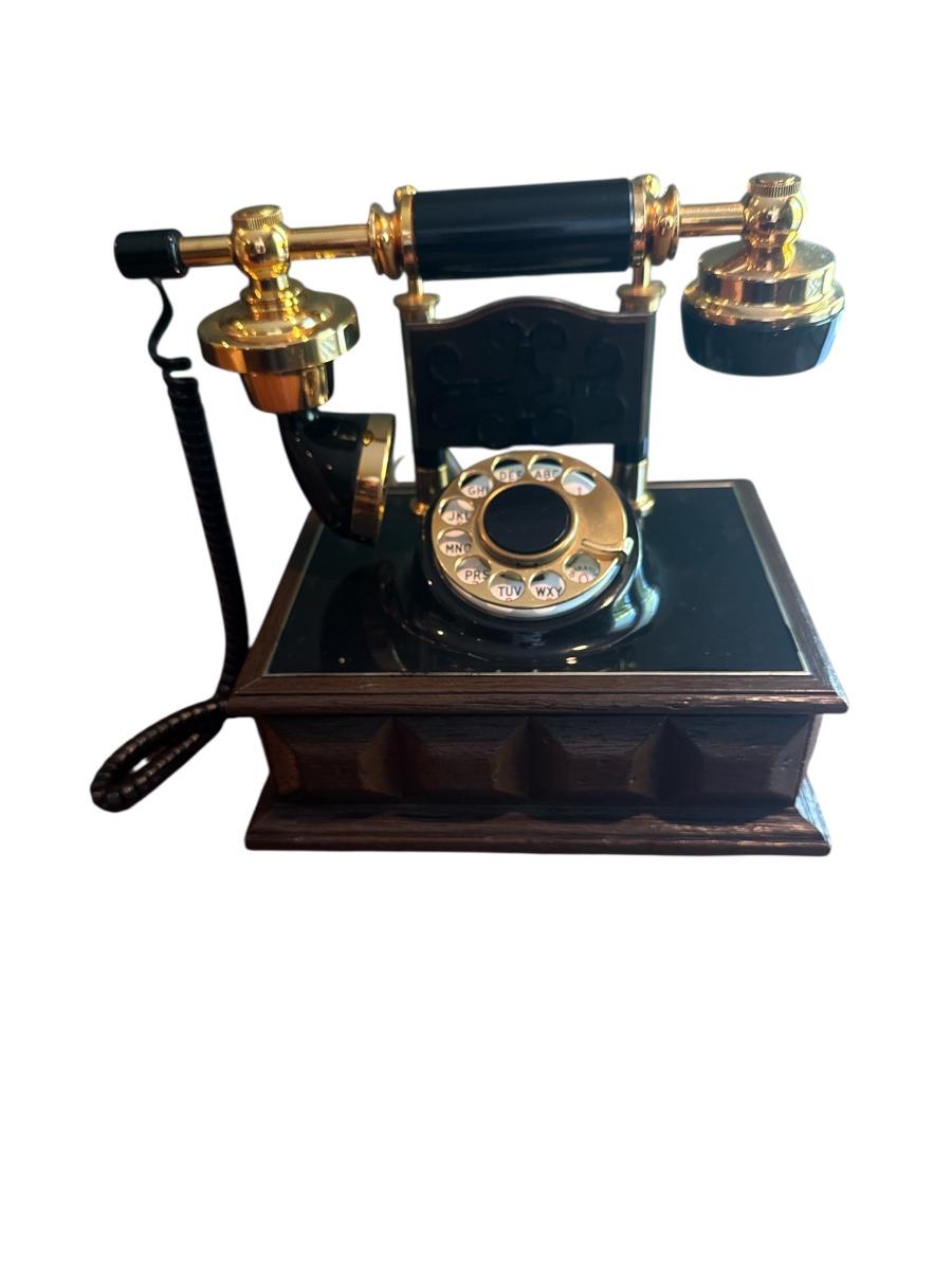 This is a vintage-style rotary-look push-button telephone by Western Electric, model T7280. It has a classic early 20th-century candlestick-inspired design with modern push-button functionality hidden within the rotary dial. The body combines black and gold accents with a decorative wood-tone base.