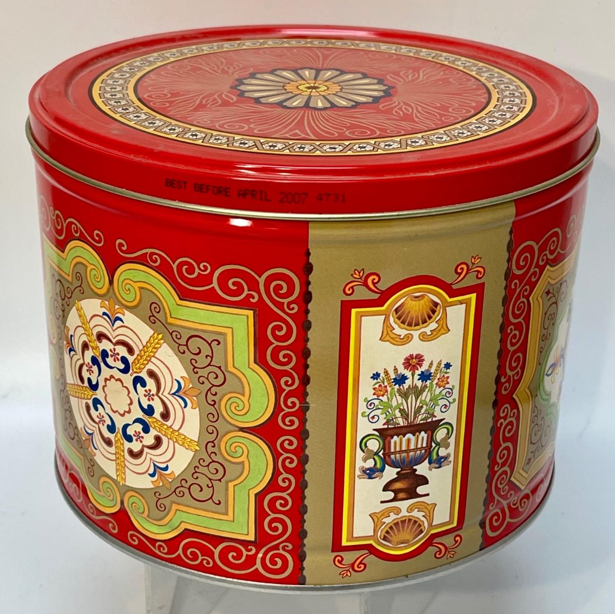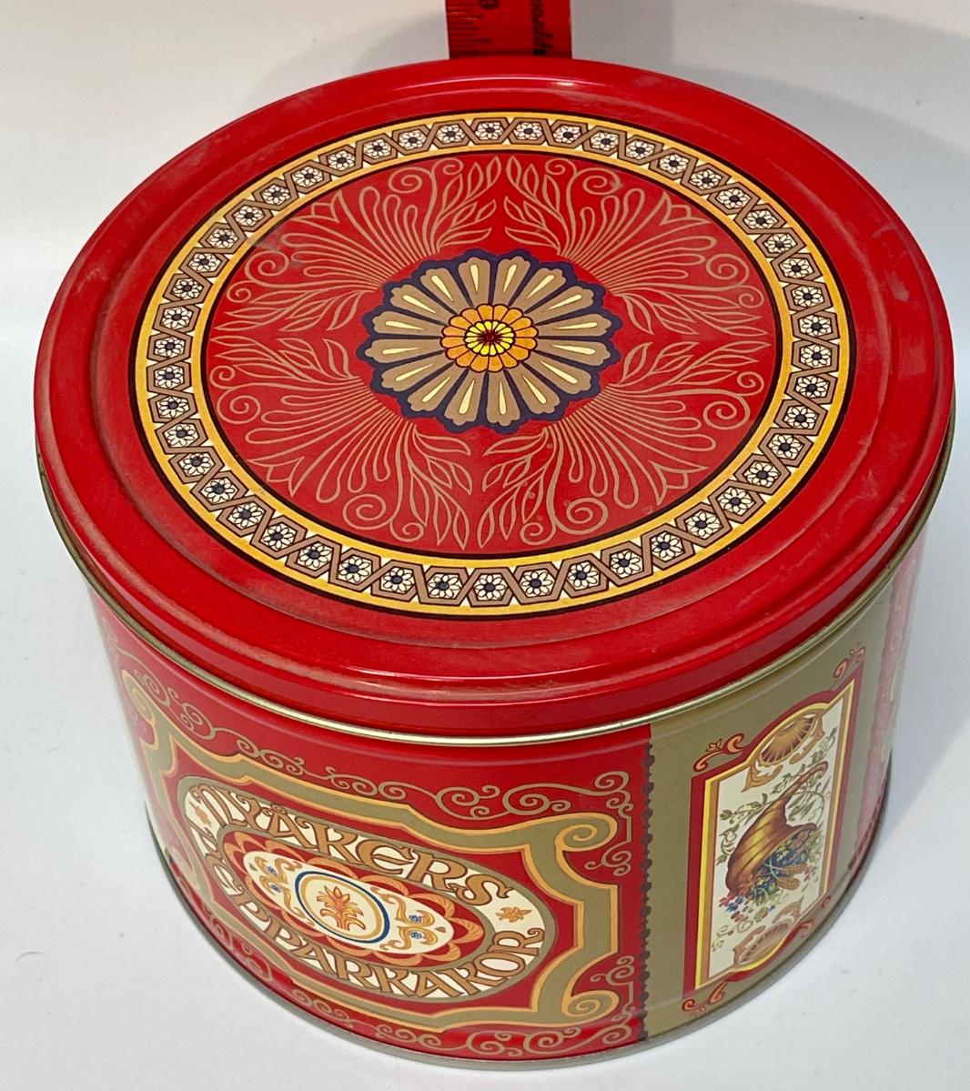 Vintage styled metal cookie tin. Colorful red and gold patterned tin. Displays nicely.
