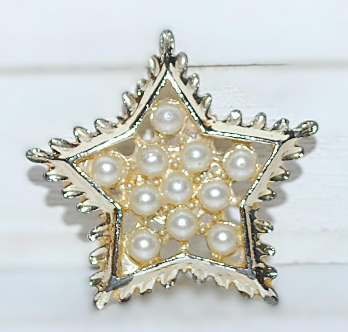 Vintage Style Set of 11 Faux PEARLS BROOCH (1¼" Diam.) on a 5 Point STAR & Gold Tone Setting