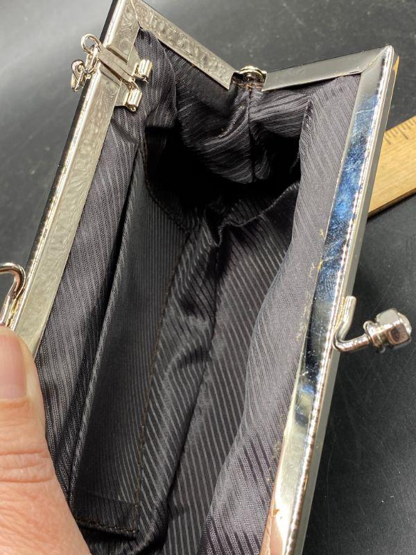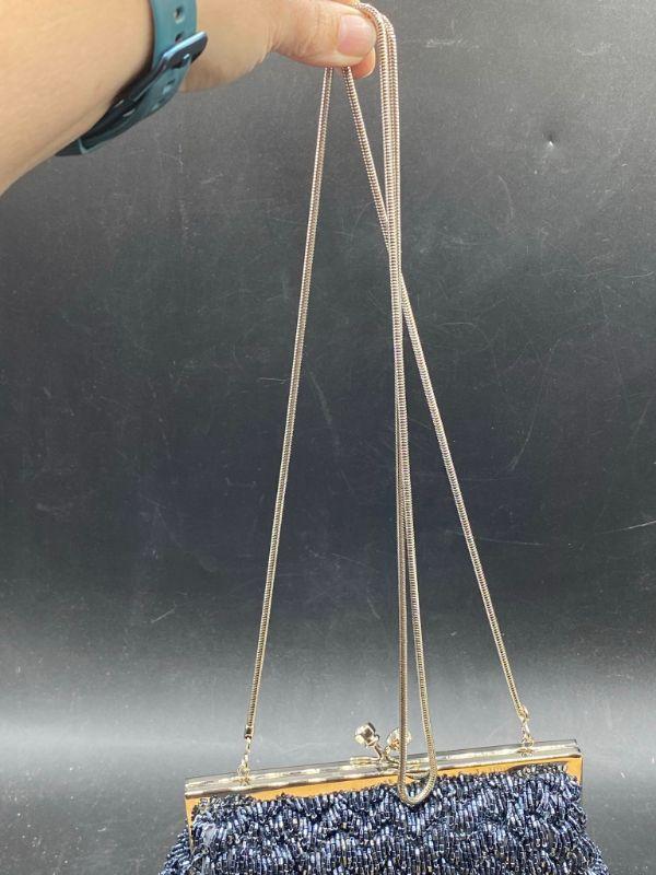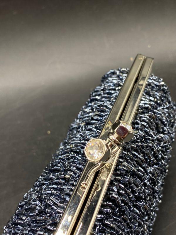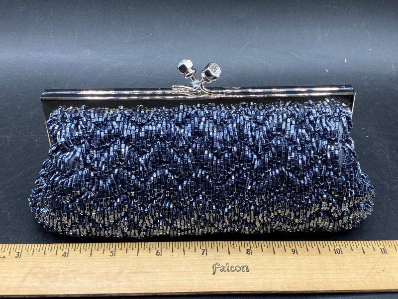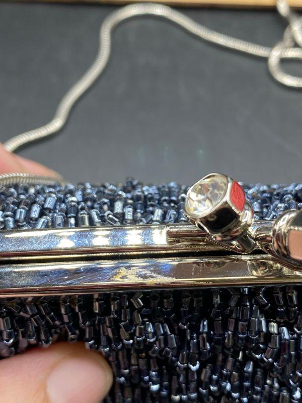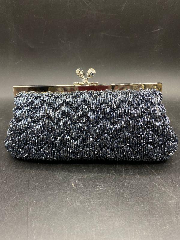 Vintage style beaded clutch. Steel grey seed beads strung to create a zig zag pattern. Rhinestone ends on the latch. Extra long metal strap makes it a crossbody. Clutch is small about 8" across. No missing beads that I could see. Unbranded. I believe this is a newer purse made to look older, the metal makes me think that, beautiful no matter the age.
