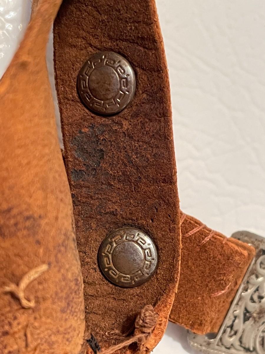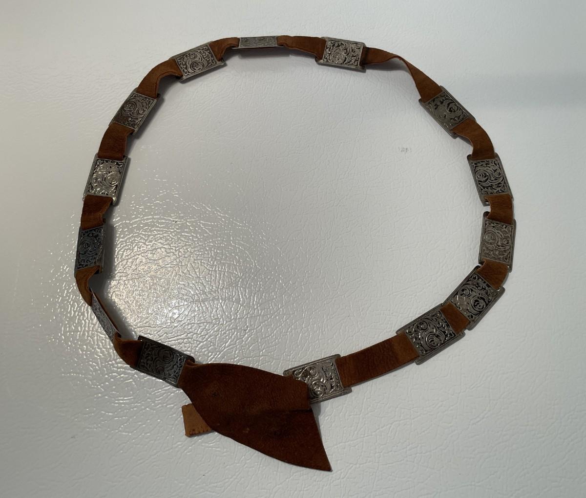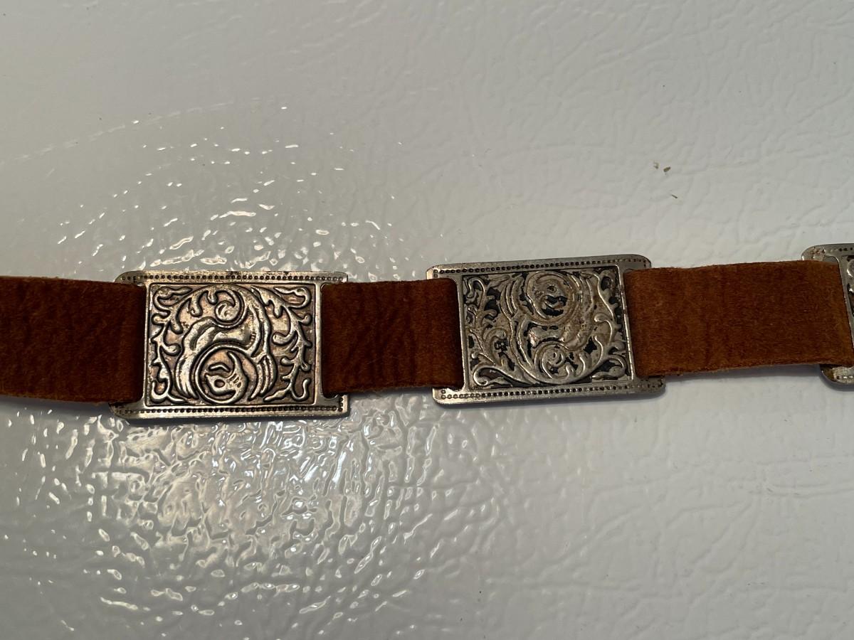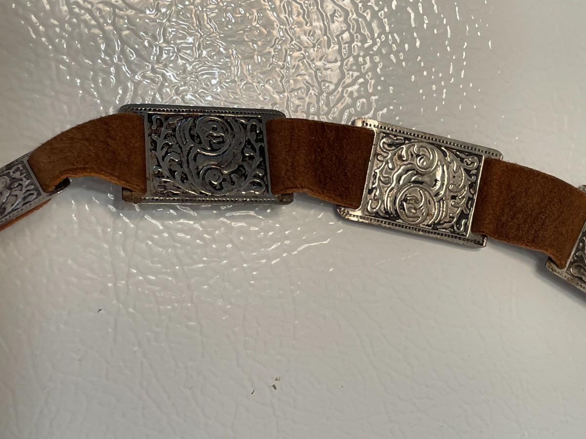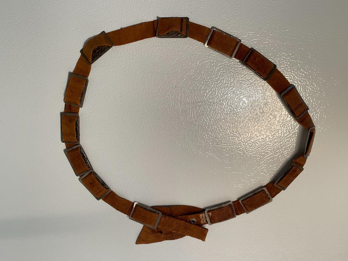 This belt is made of a suede like leather (possibly deer) and embellished with panels of a lightweight, embossed metal (likely aluminum). It closes with on snap, but has two lenghts (two snaps). It is about 35.25 inches in total length, and the largest waist lenght is about 32 inches.