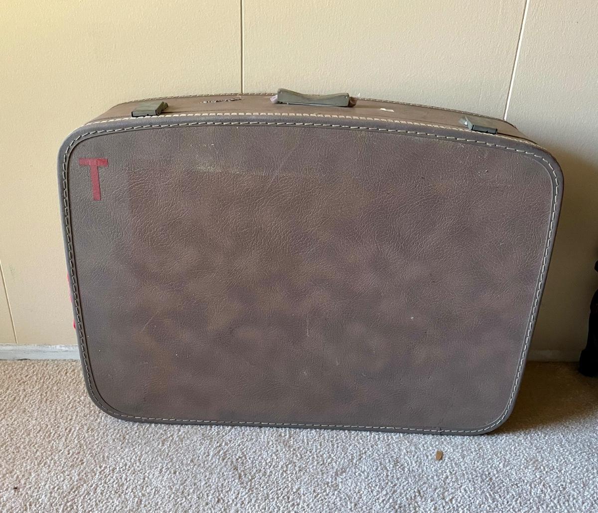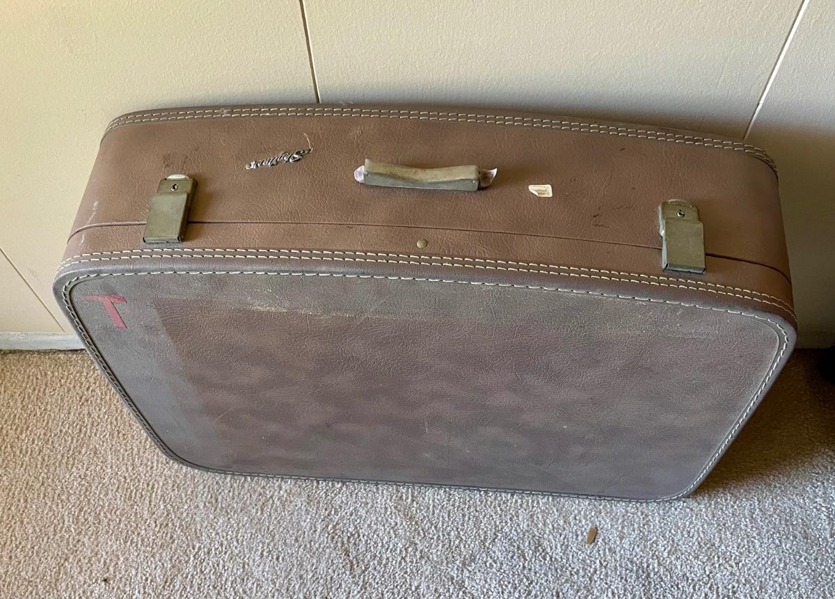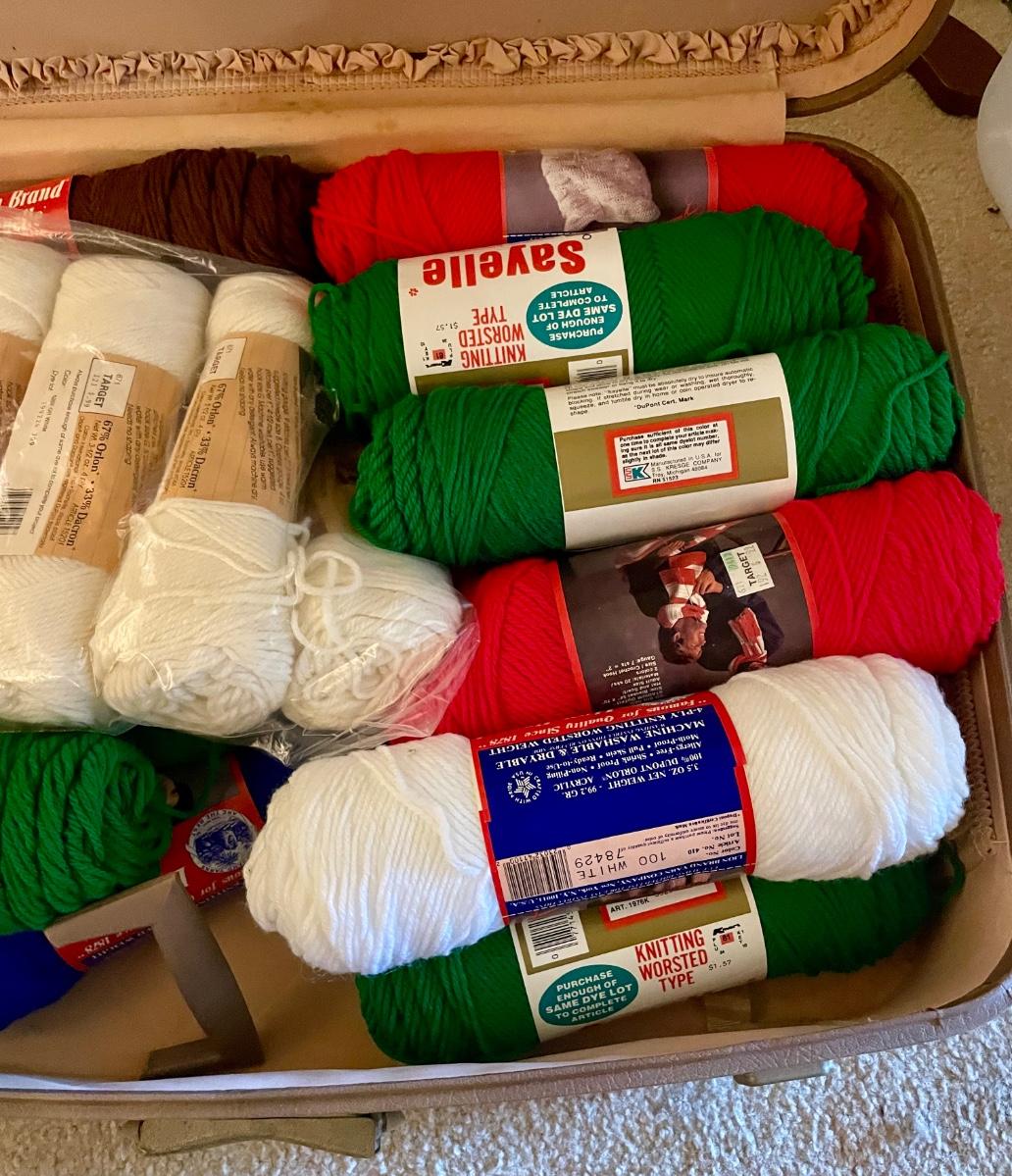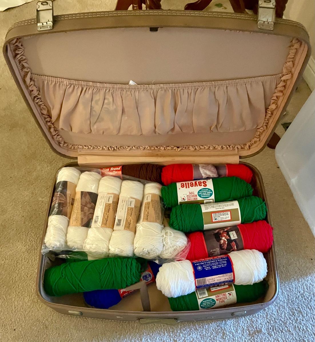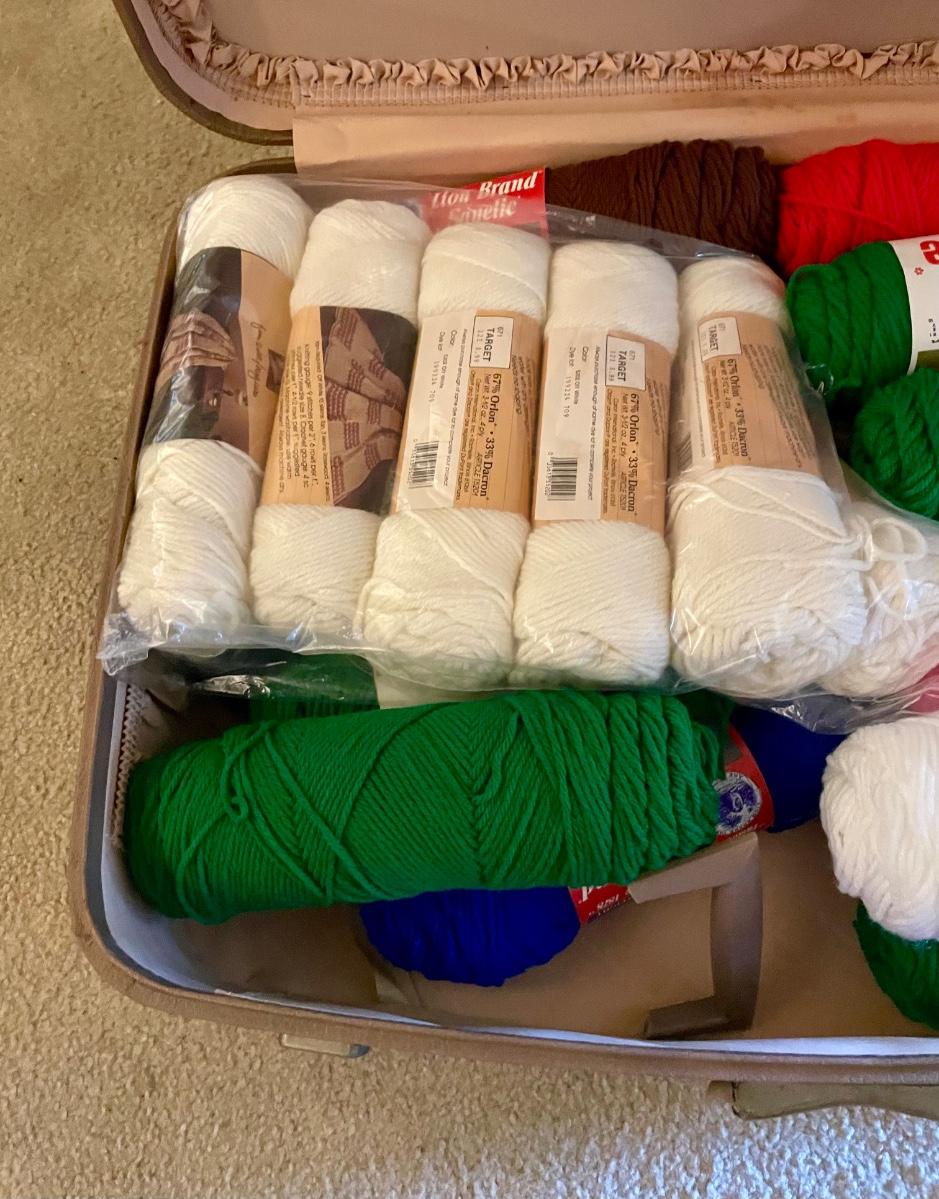 Vintage Skyline suitcase, has a broken handle. Filled with many colors of yarn, most are unused skeins.