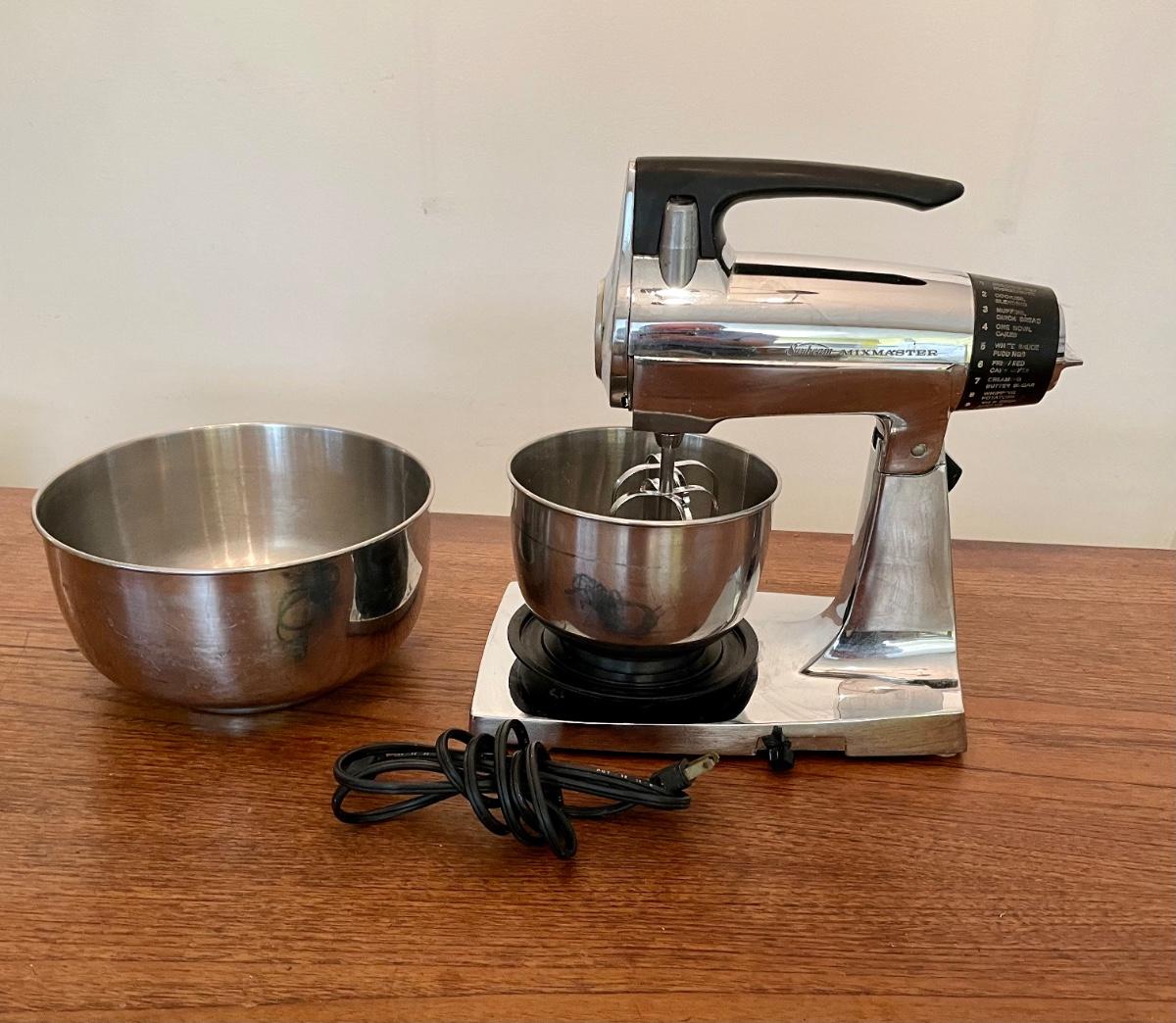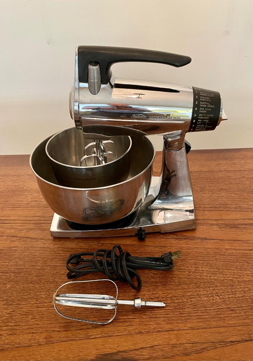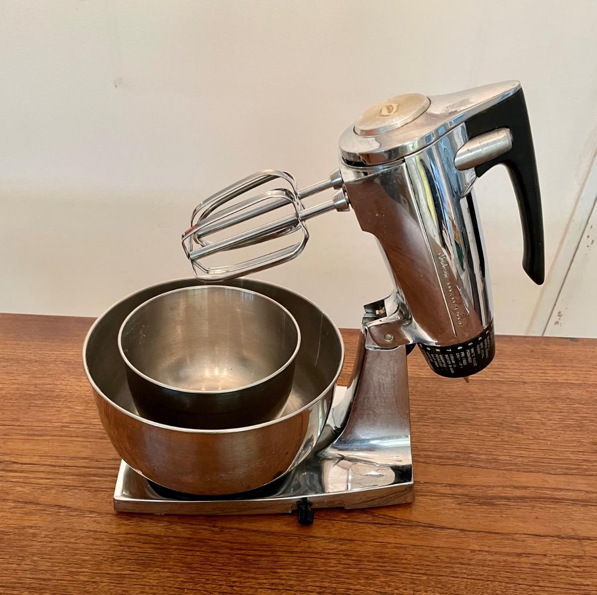 Vintage chrome mixer with beaters, 2 bowls, and original cord. Fully tested.