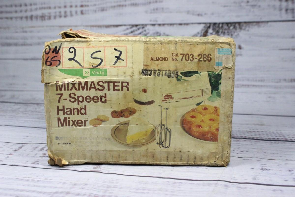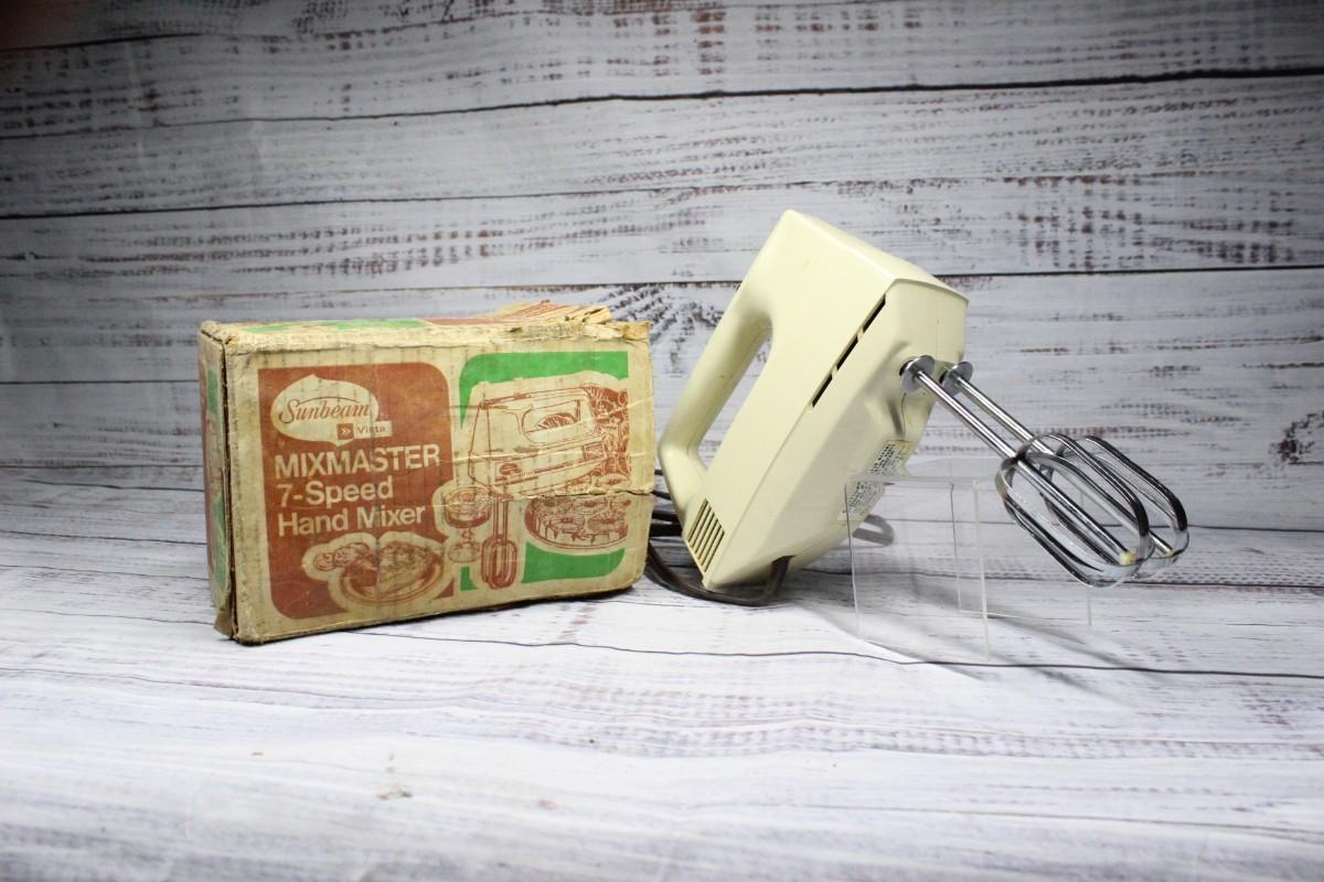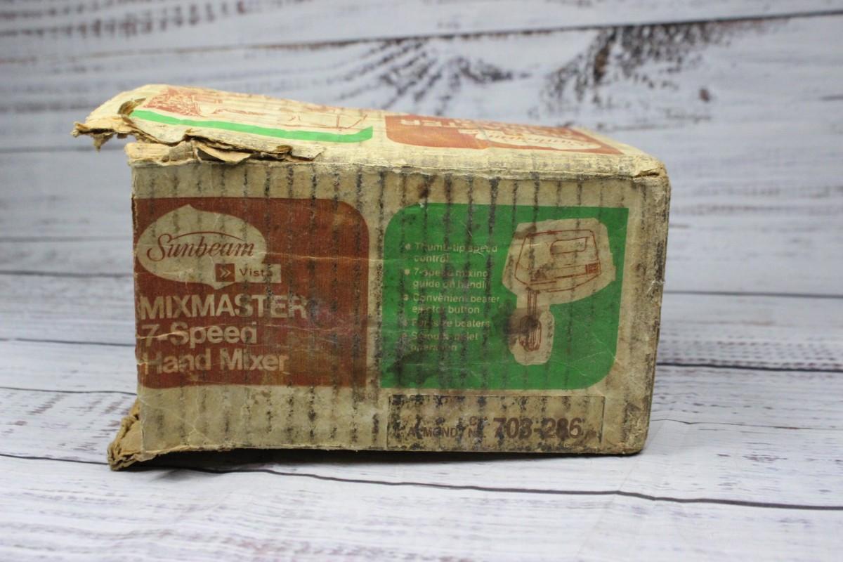 Vintage Sunbeam Mixmaster 7-Speed Hand Mixer with the original box. The mixer has a little wear, but has been tested and works perfectly.