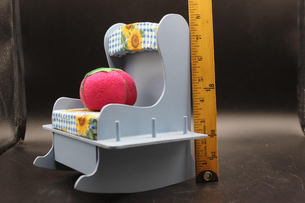 Vintage Sunflower Rocking Chair Sewing Set with Tomato Pin Cushion, there are no significant cracks or chips to the rocking chair and is in good condition. Check pictures for more details and for sizing.