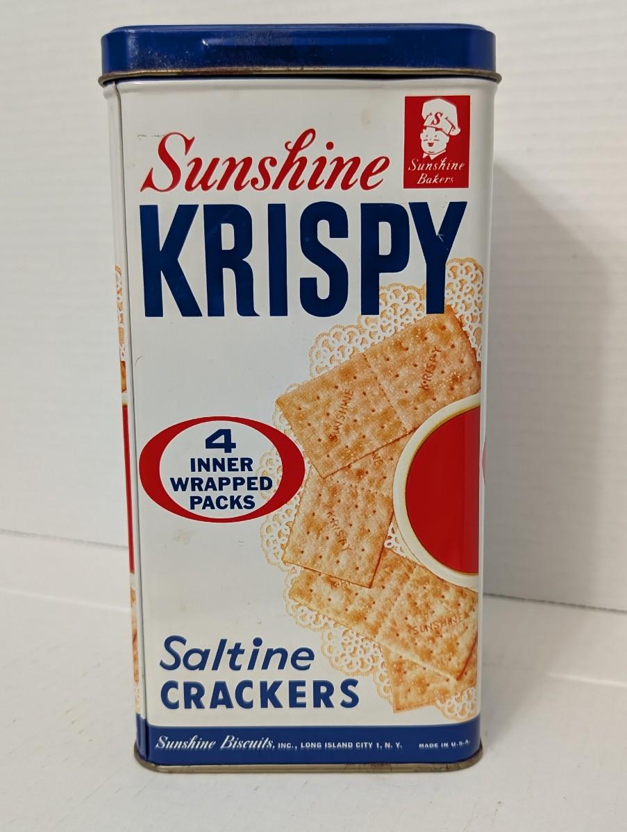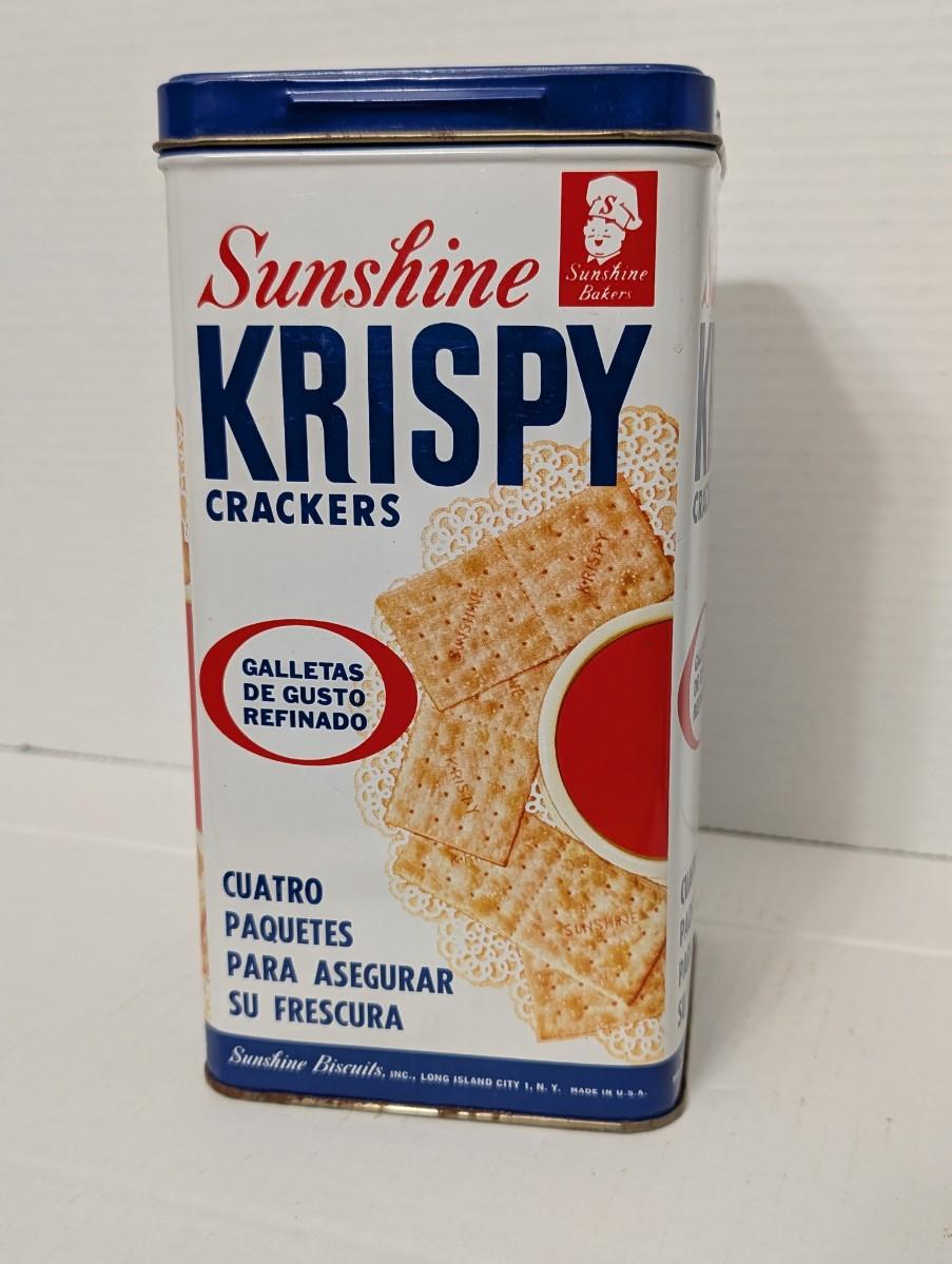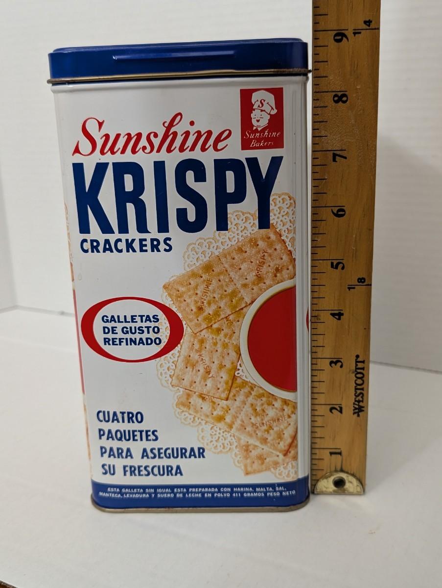 vintage Sunshine Krispy tin, Sunshine Biscuits advertising, saltine crackers tin, retro kitchen decor, collectible food container, vintage pantry tin, Sunshine Bakers memorabilia, cracker tin collectible, retro advertising tin, vintage food packaging