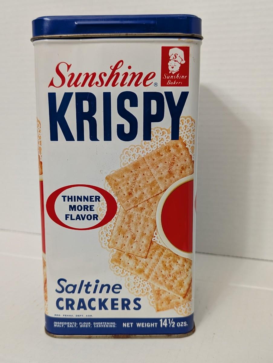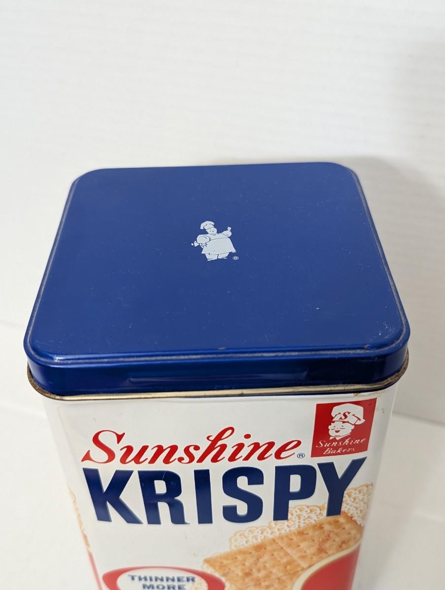 vintage Sunshine Krispy tin, Sunshine Biscuits advertising, saltine crackers tin, retro kitchen decor, collectible food container, vintage pantry tin, Sunshine Bakers memorabilia, cracker tin collectible, retro advertising tin, vintage food packaging