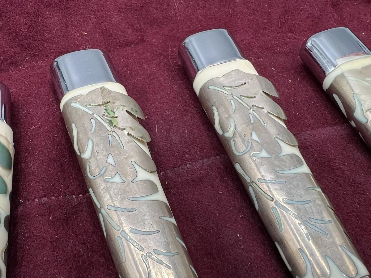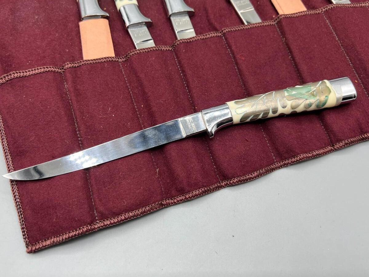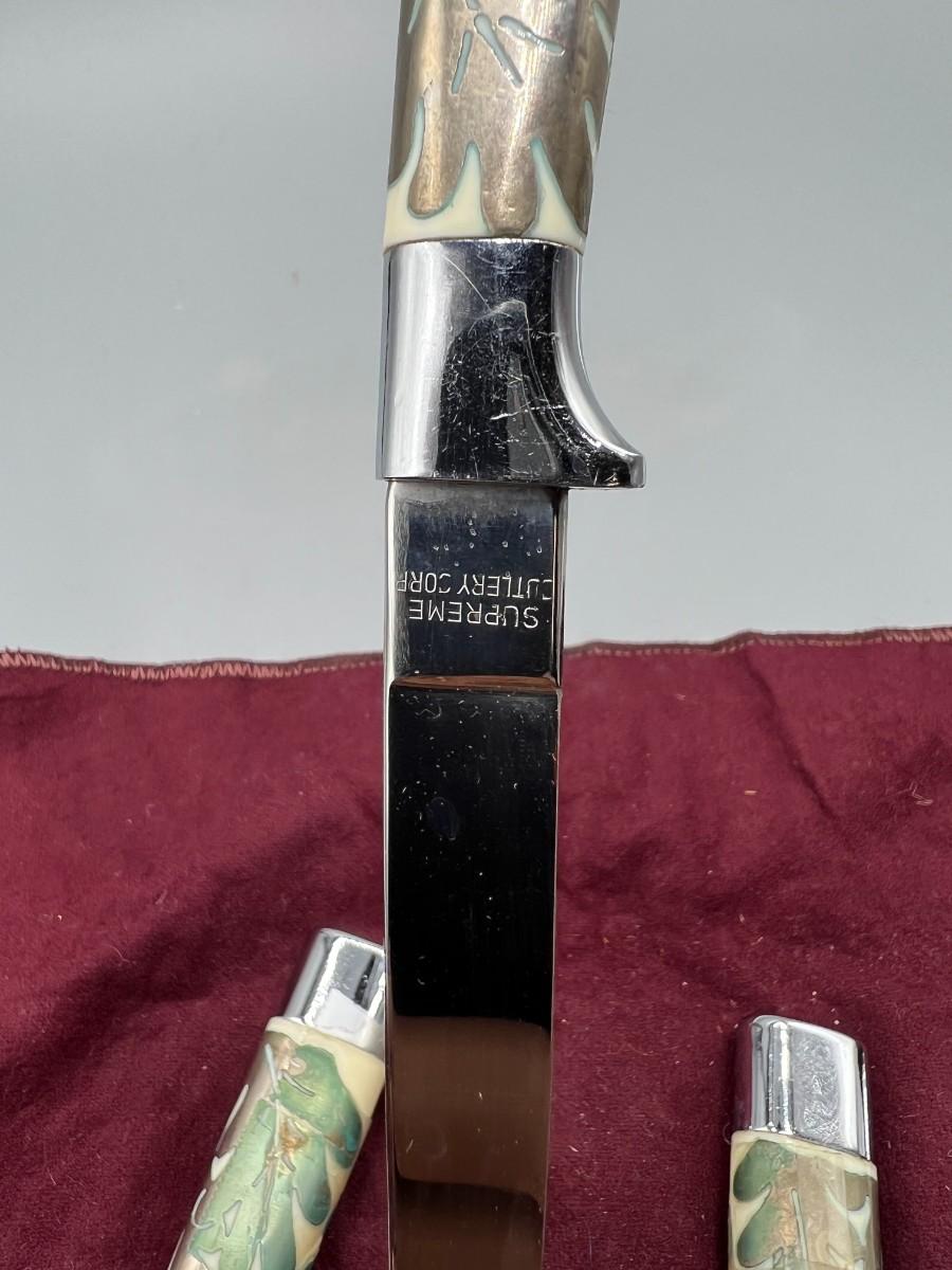 Set of 8 vintage Supreme Cutlery steak knives. Handles have signs of age; blades are in good condition. Leaf art on handles is lifting in places.