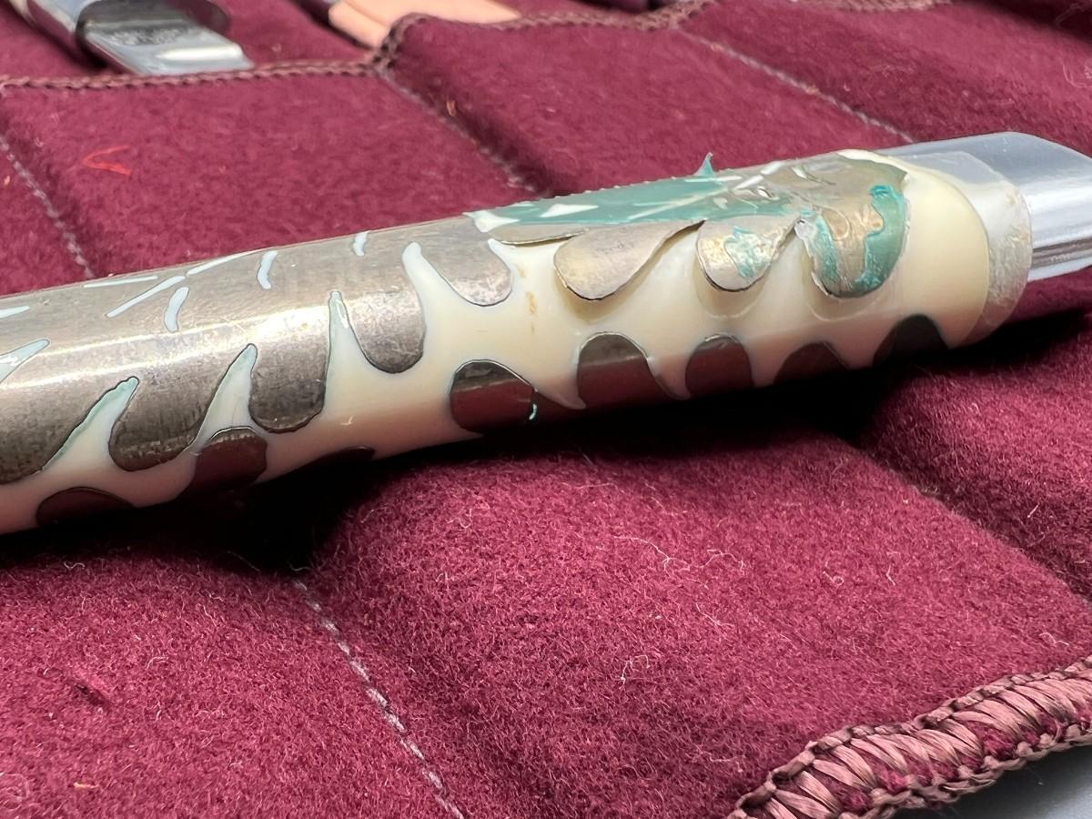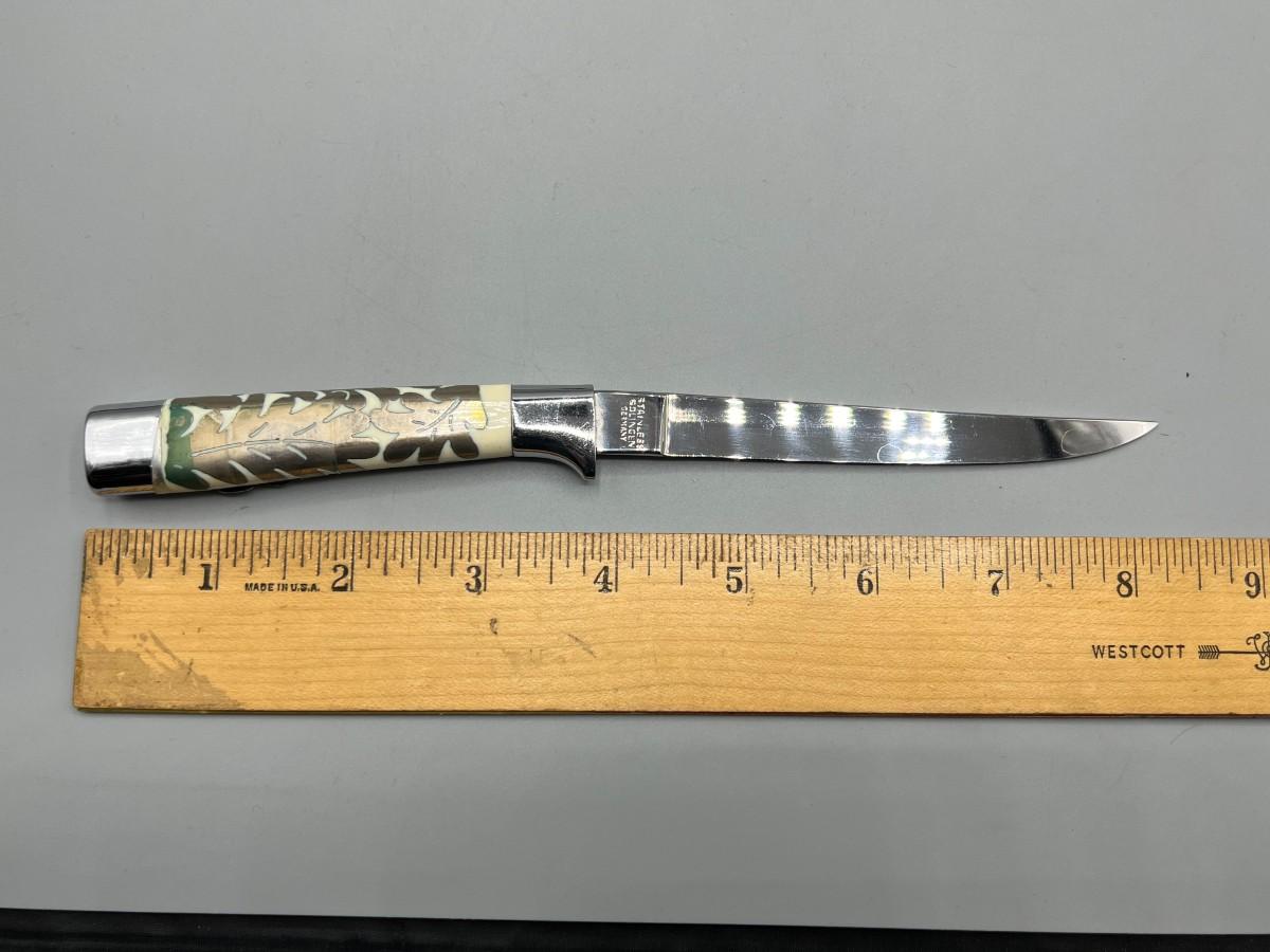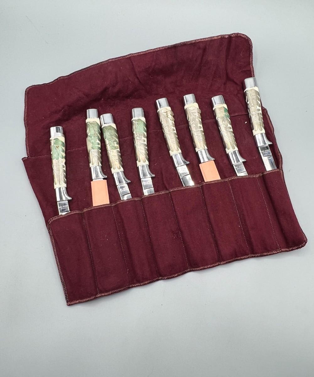 Set of 8 vintage Supreme Cutlery steak knives. Handles have signs of age; blades are in good condition. Leaf art on handles is lifting in places.
