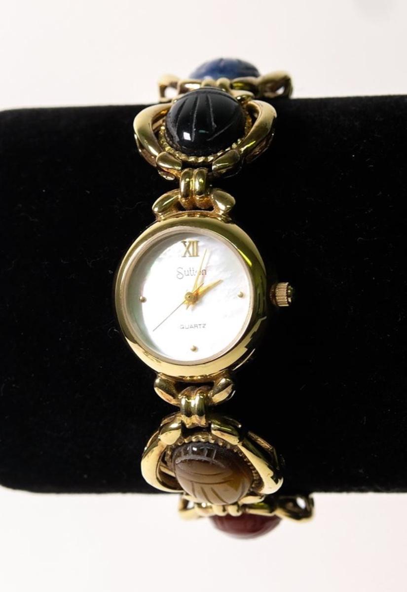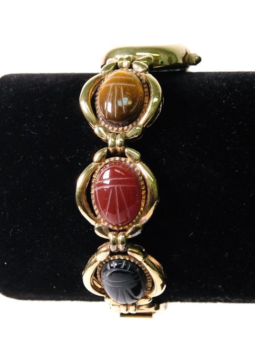 Carved stones (Lapis, Tiger's Eye, Obsidian, Carnelian, chrysoprase). Band measures approx. 6". Unsure of working condition, needs new battery.